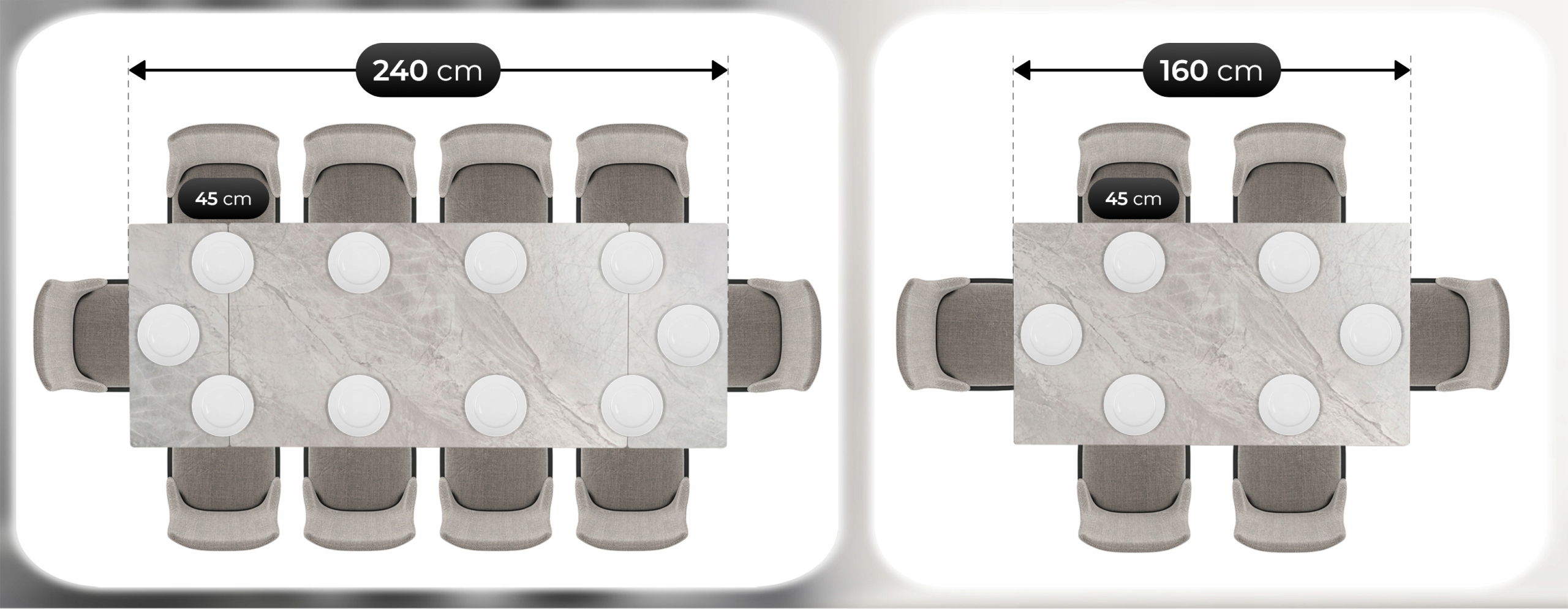 Dzięki szybkiemu i wygodnemu mechanizmowi rozkładania, możesz z łatwością zwiększyć długość stołu z 160 cm do imponujących 240 cm. Wszystko za sprawą dwóch ukrytych wkładek, które wysuwają się płynnie na prowadnicach po obu stronach blatu.