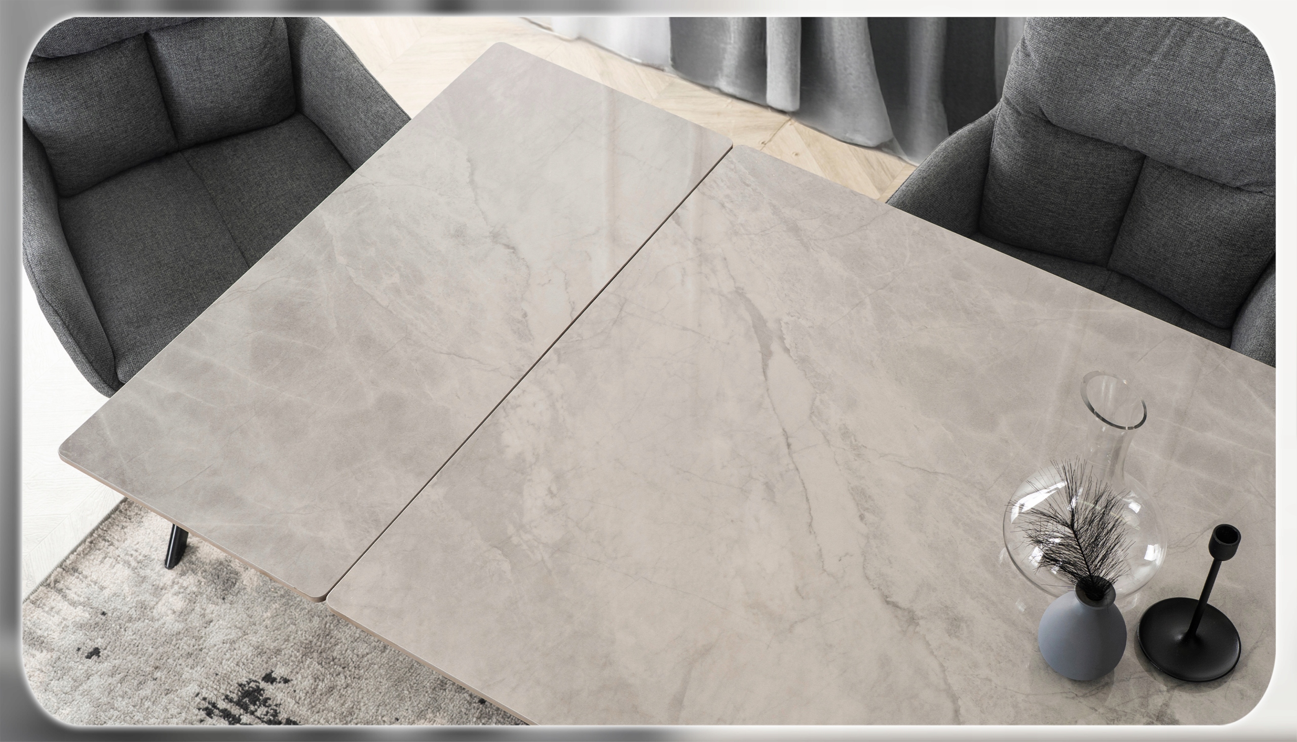 - Ceramika klasy premium – blat stołu jest niezwykle trwały, odporny na zarysowania i wysokie temperatury.