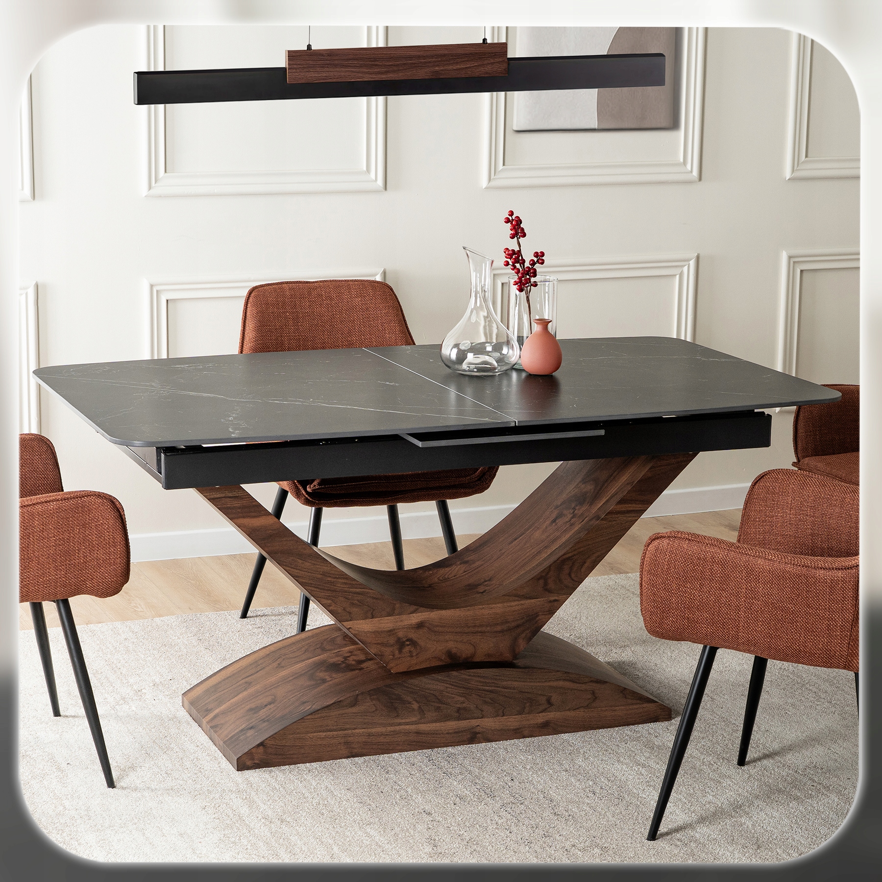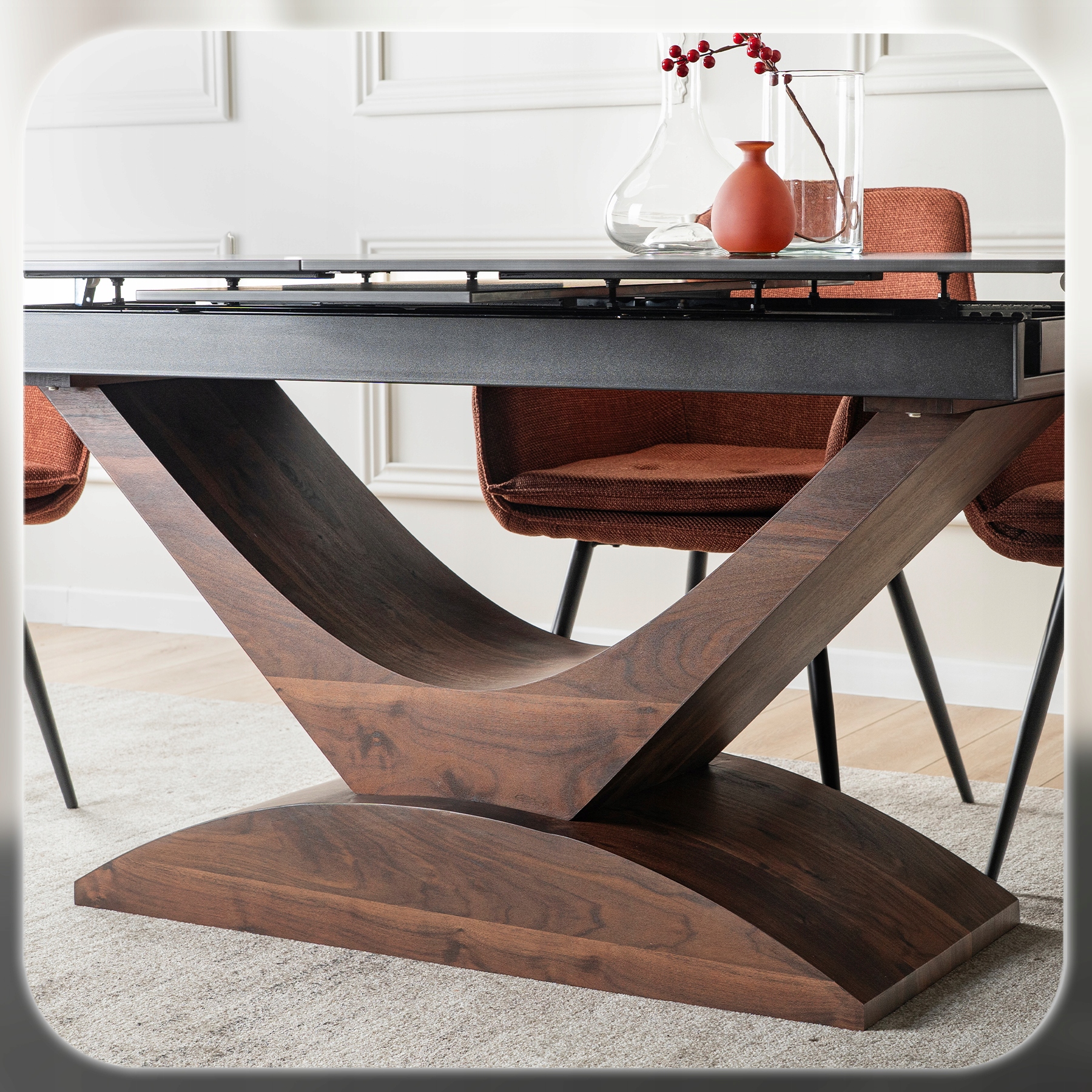 - Uniwersalna forma – prostokątny, lekko zaokrąglony kształt i elegancki kolor orzecha pasują do jadalni, salonu, a także przestrzeni komercyjnych o wysokim standardzie.