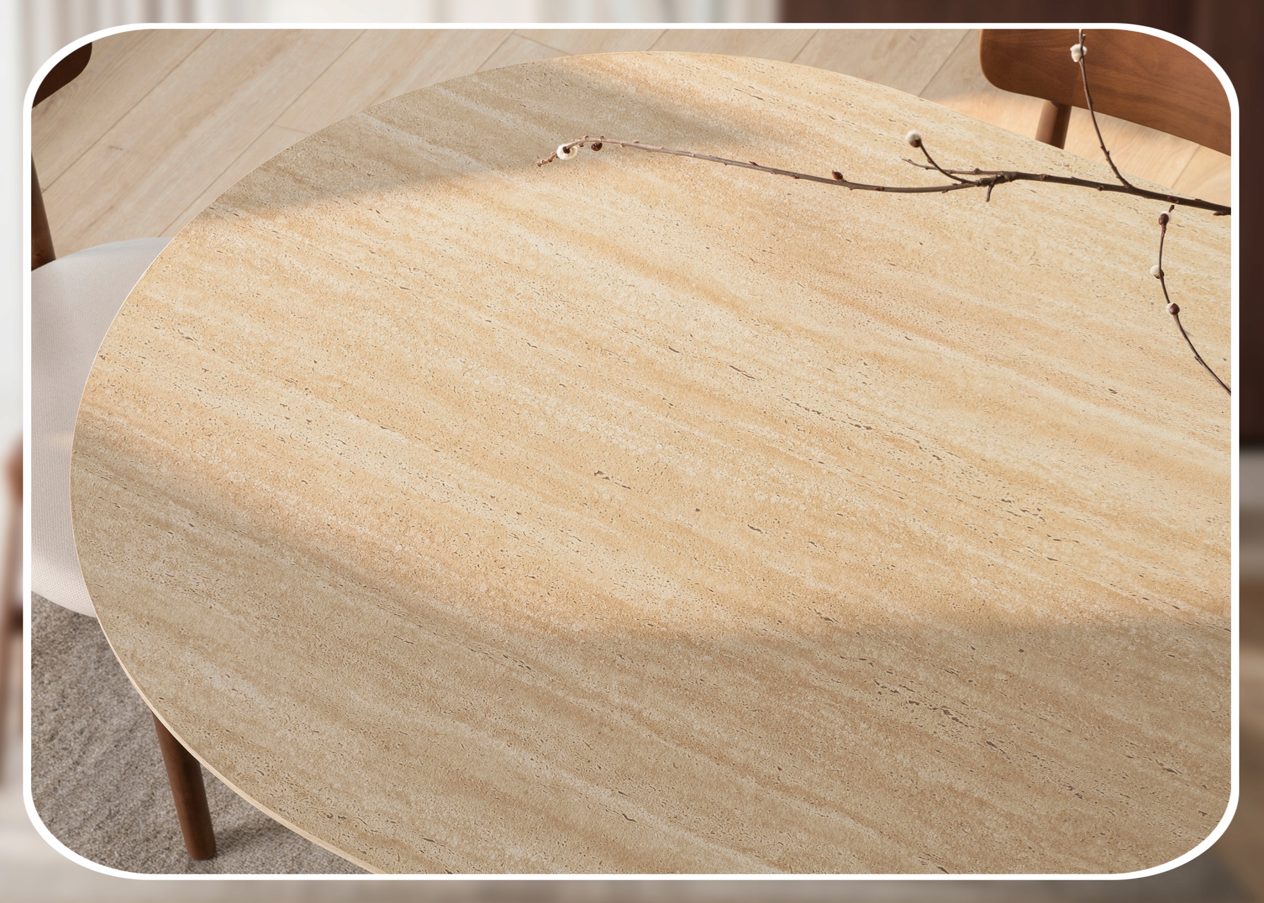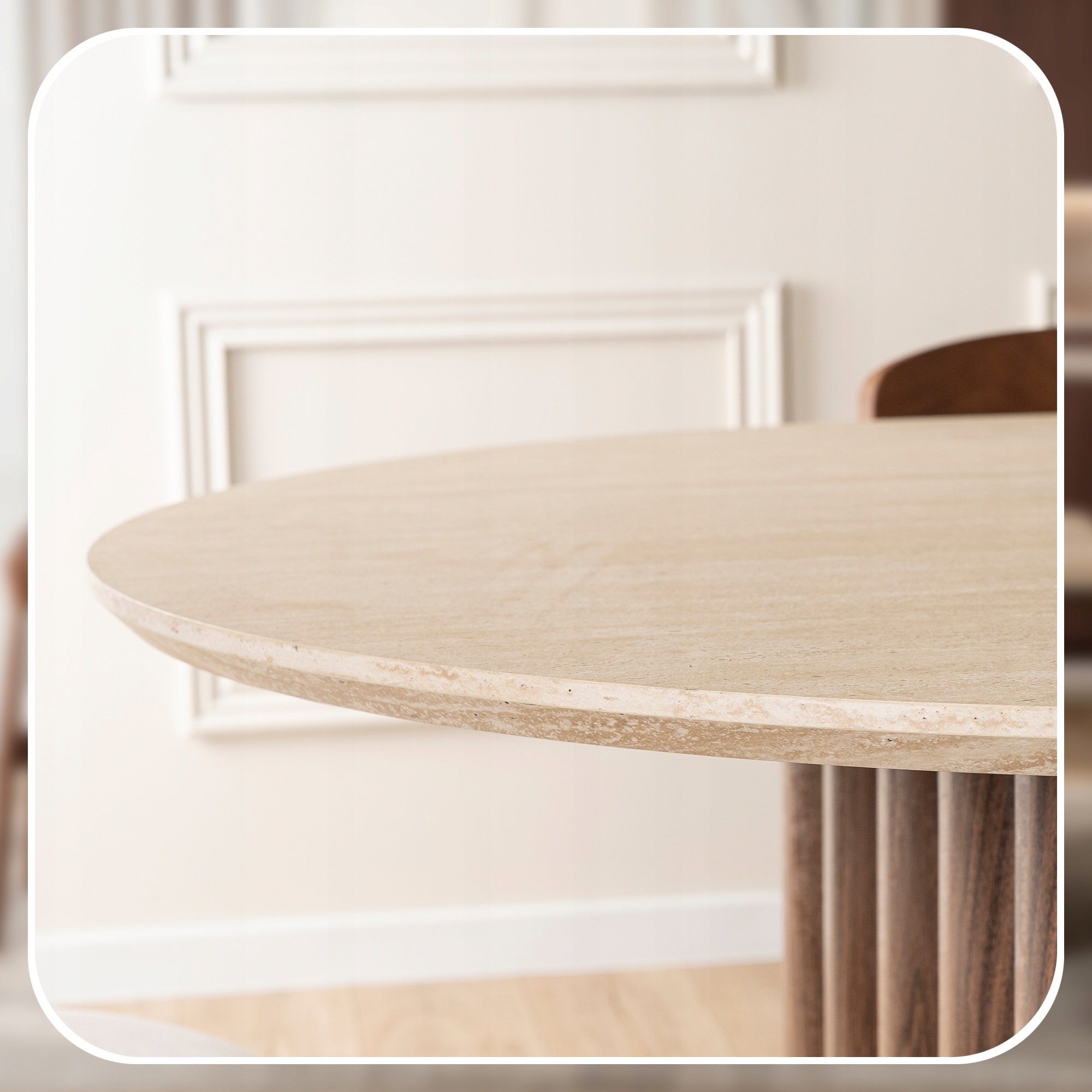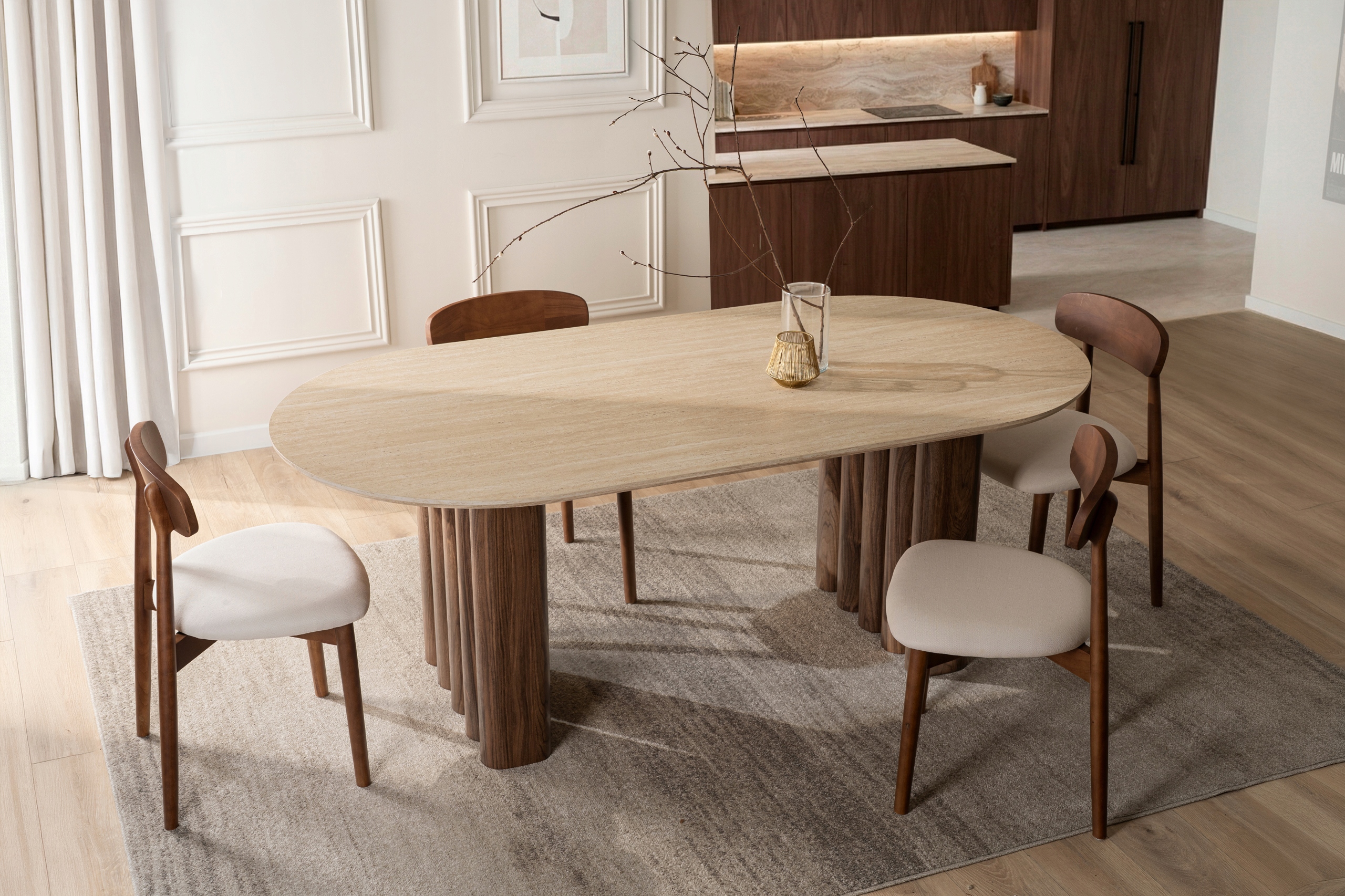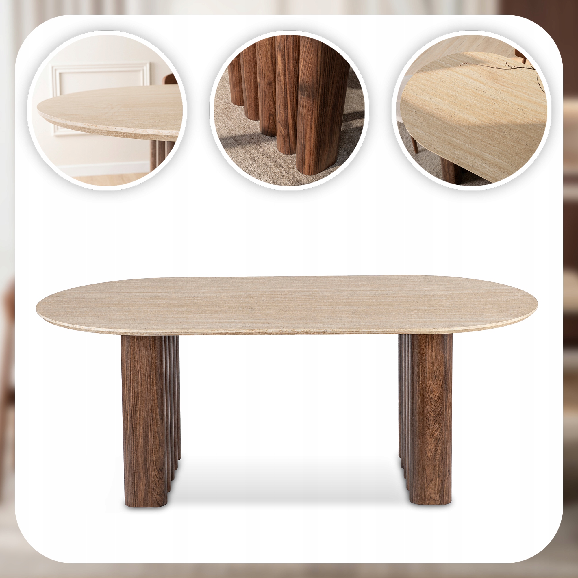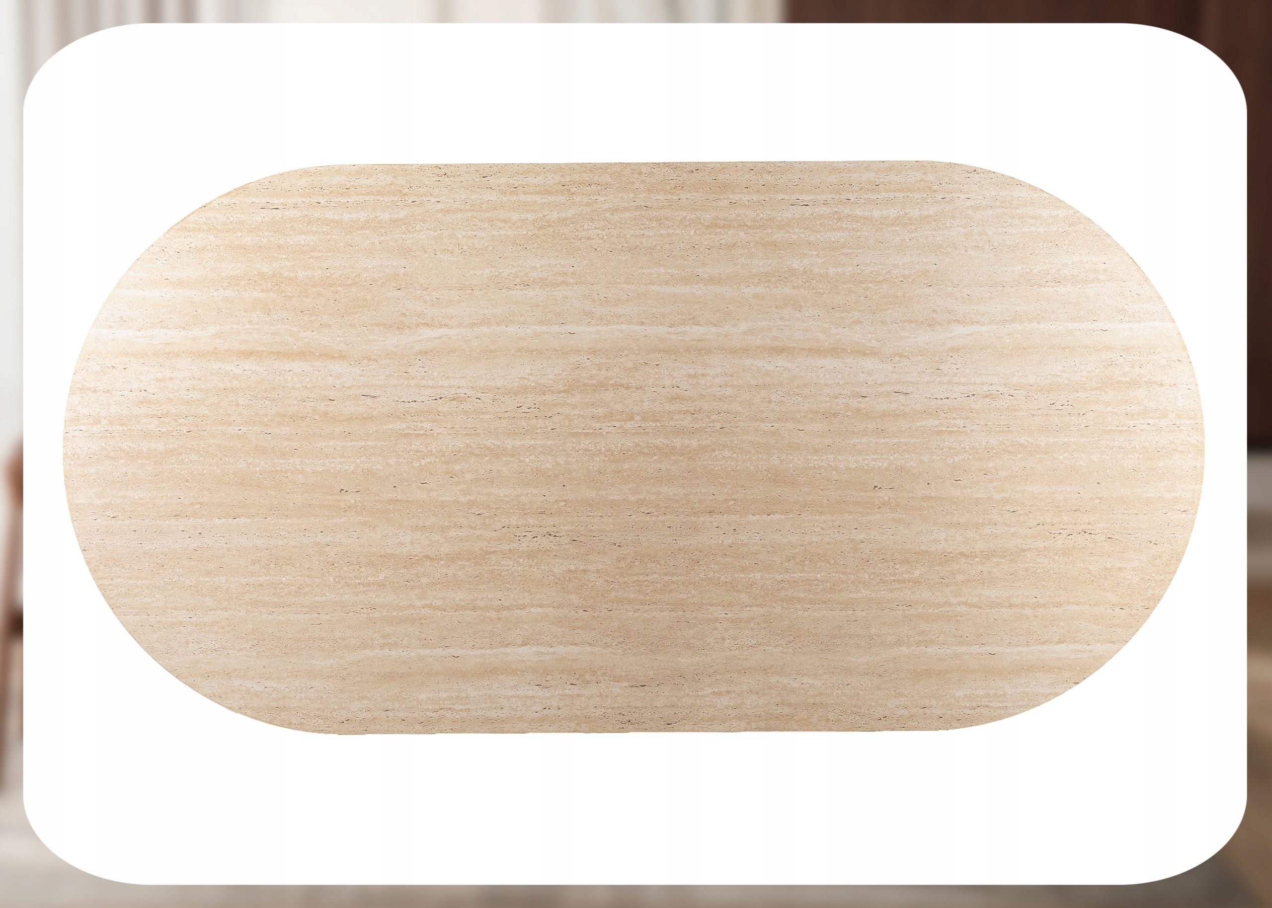 Stół DARIO to wyjątkowe połączenie naturalnych materiałów i eleganckiej formy, które idealnie wpisuje się w aktualne trendy aranżacyjne. Owalny blat w wykończeniu trawertynu zachwyca subtelną strukturą i jasnym, ciepłym odcieniem, dodając wnętrzu lekkości oraz wyrafinowania.