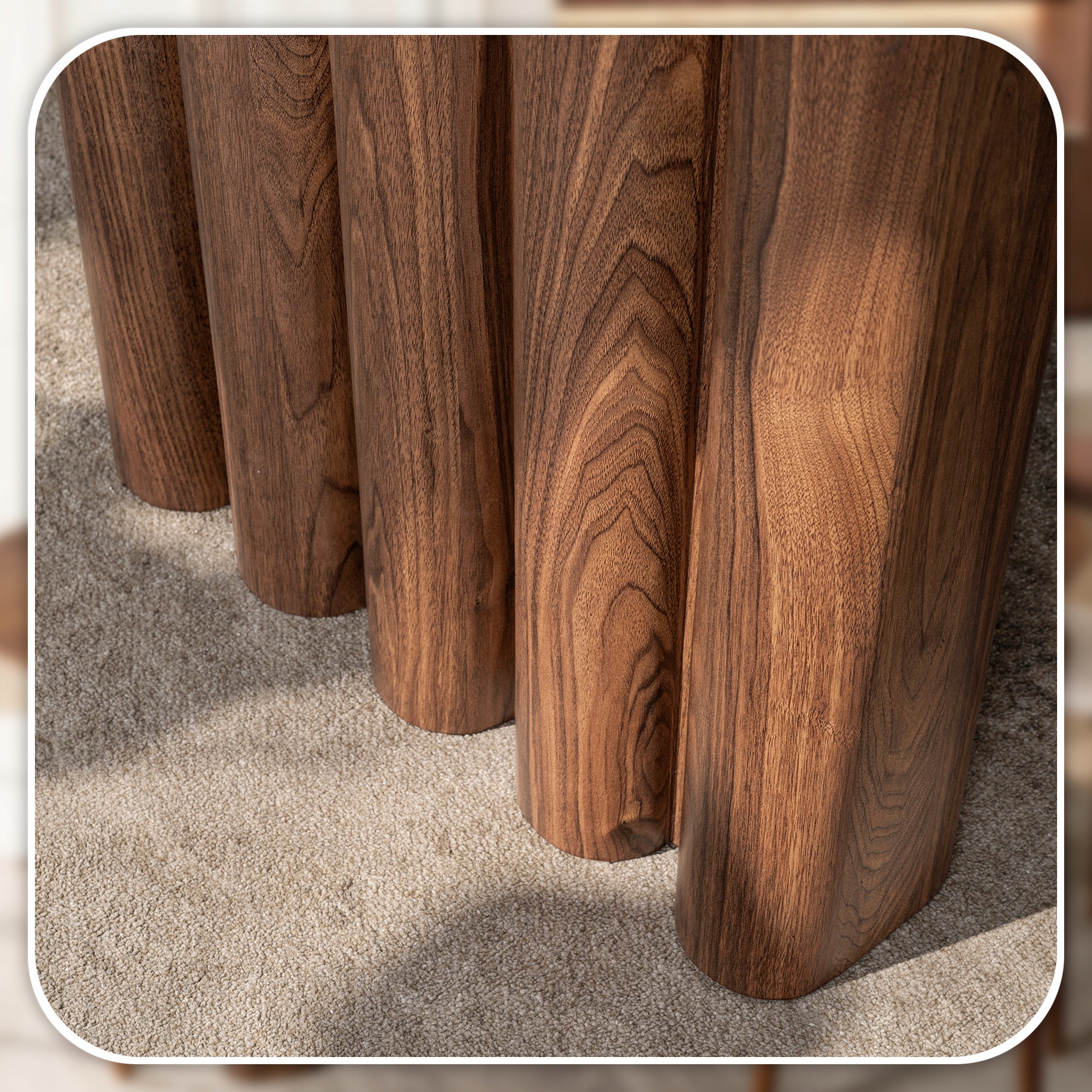 Efektowna podstawa została wykonana w dekorze naturalnego orzecha, tworząc spójną i elegancką całość z blatem. Jej ryflowana, forma przyciąga wzrok i nadaje meblowi wyjątkowy, designerski charakter.