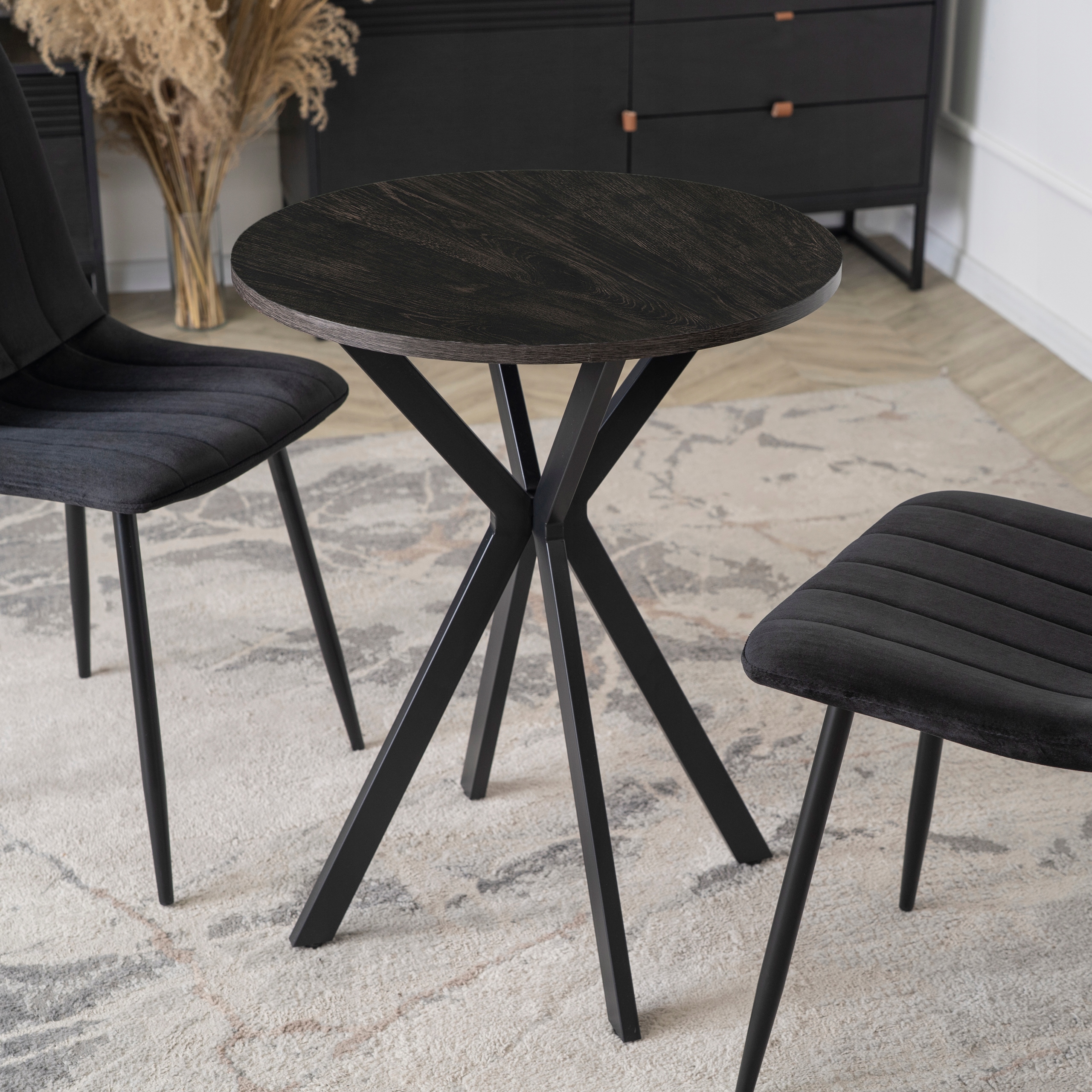 Stół o wymiarach 60 x 60 x 75,5 cm to idealny wybór do jadalni, kuchni lub salonu. Jego okrągły blat w odcieniu czarnym prezentuje się wyjątkowo stylowo nawiązując do estetyki industrialnej i loftowej. Stabilna podstawa w formie czarnych metalowych nóg krzyżowych dodaje mu charakteru.