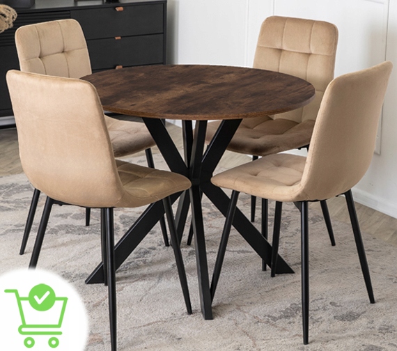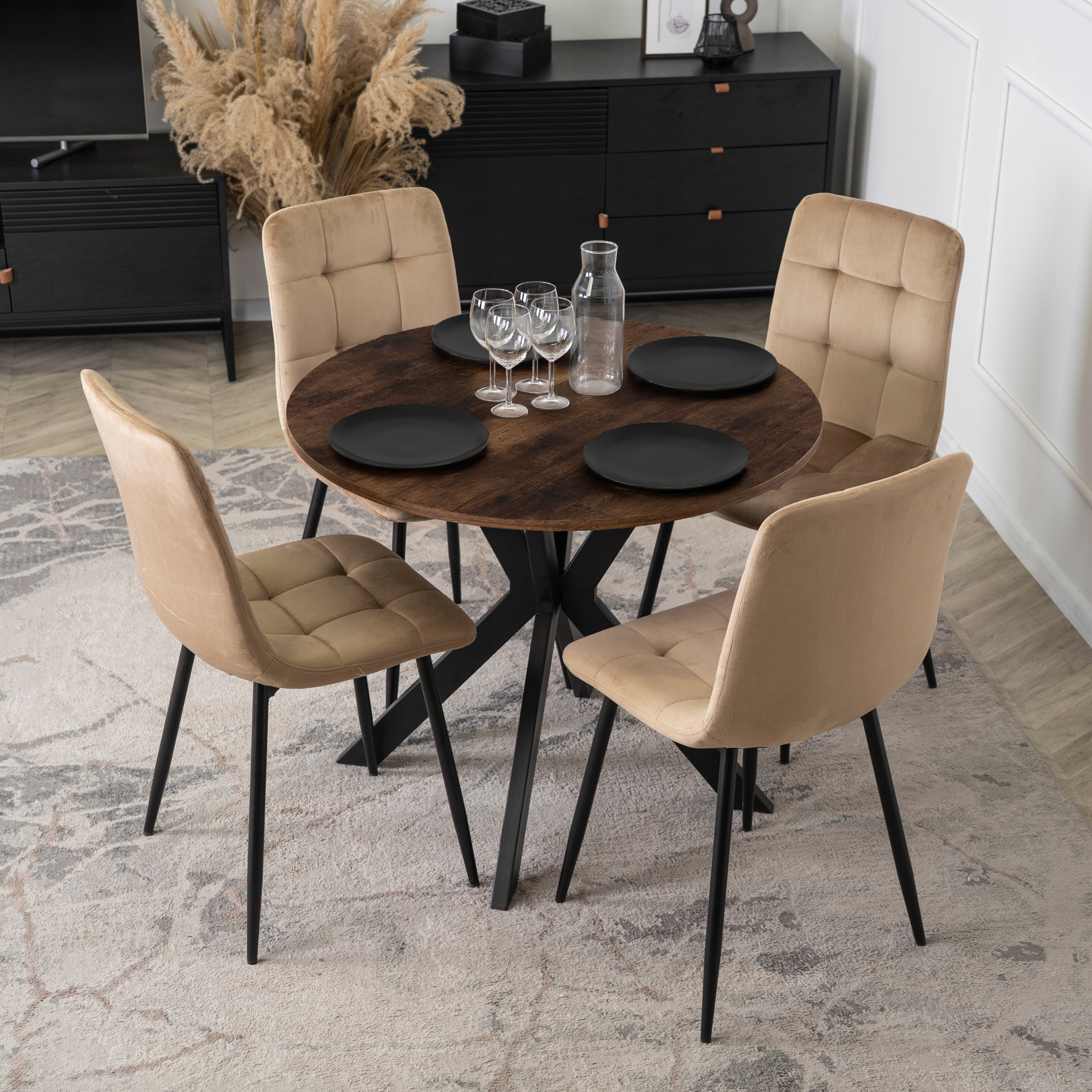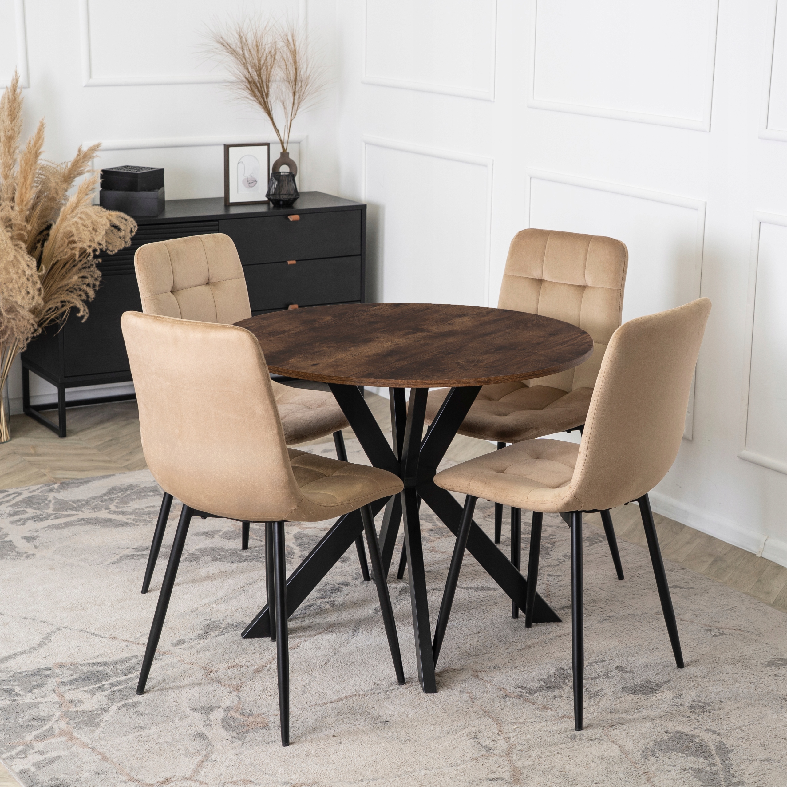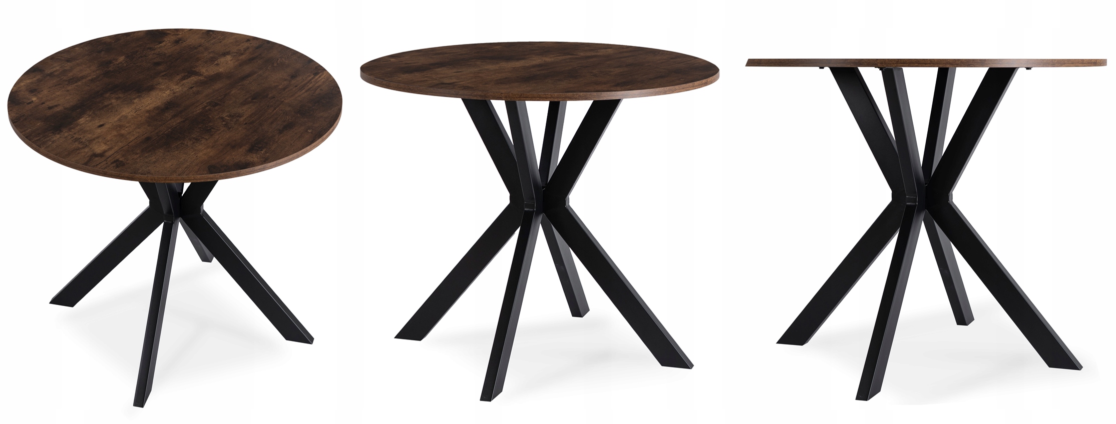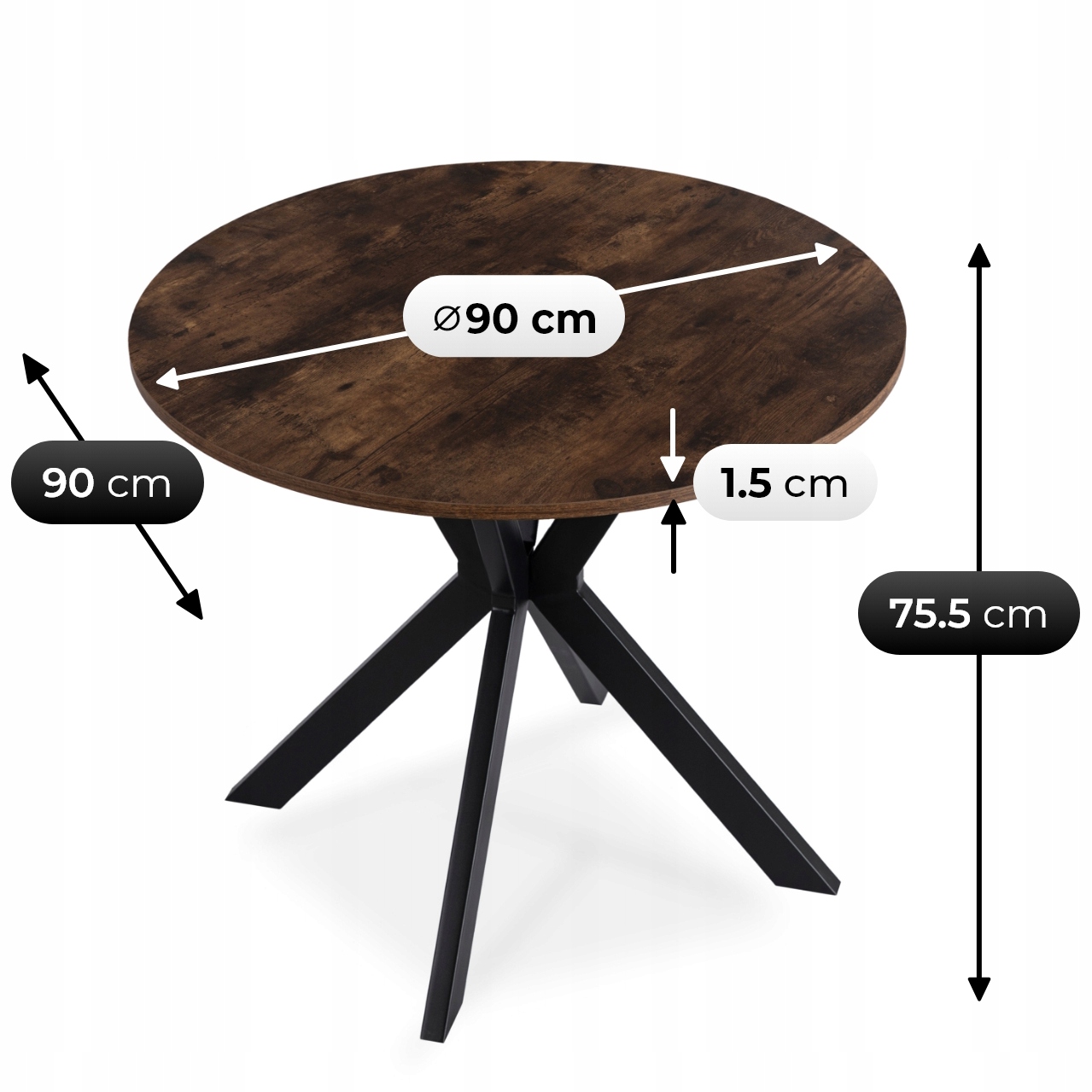 Stół o wymiarach 90 x 90 x 75,5 cm to idealny wybór do jadalni, kuchni lub salonu. Jego okrągły blat w odcieniu rustykalnym oraz stabilna podstawa w formie czarnych metalowych nóg krzyżowych dodaje mu charakteru.