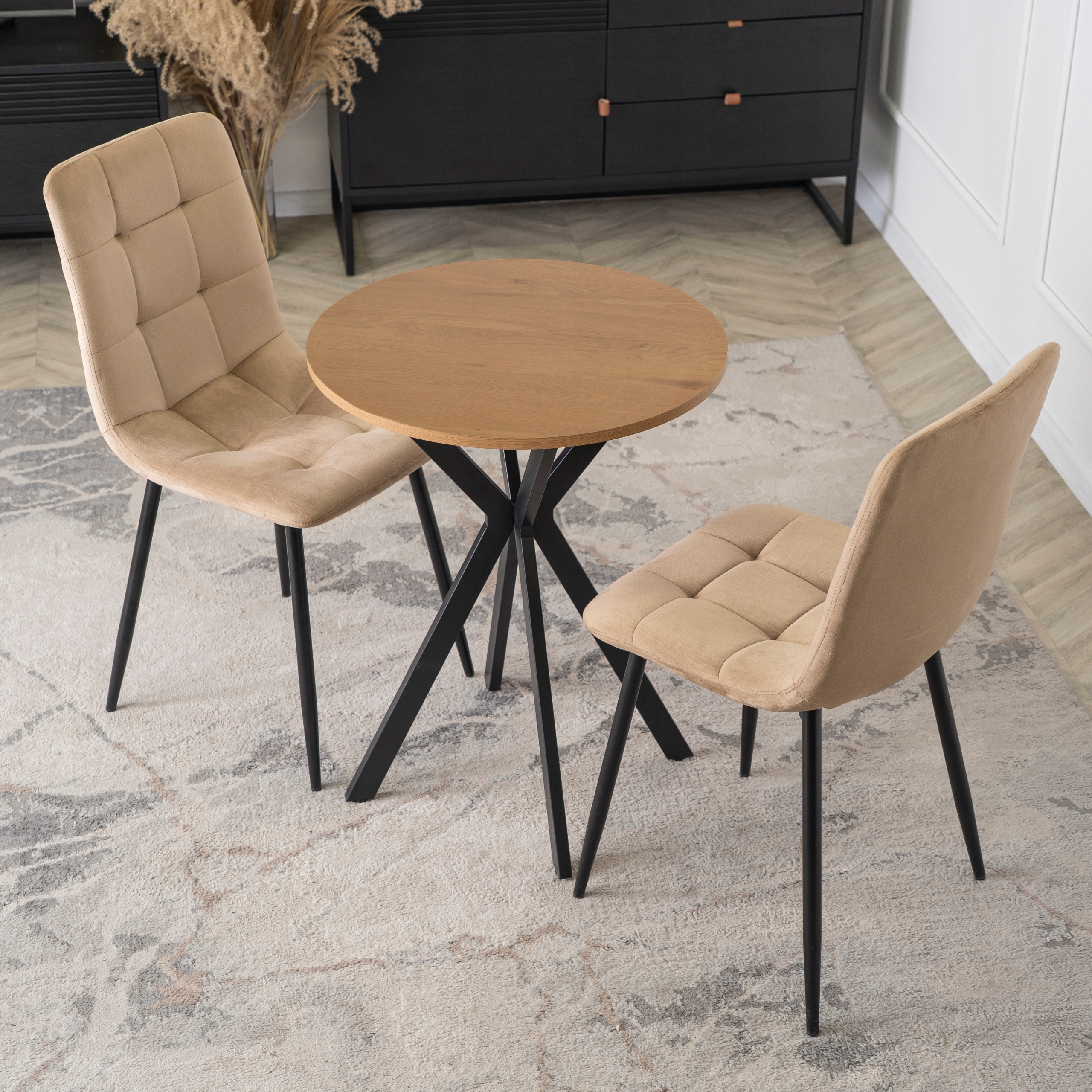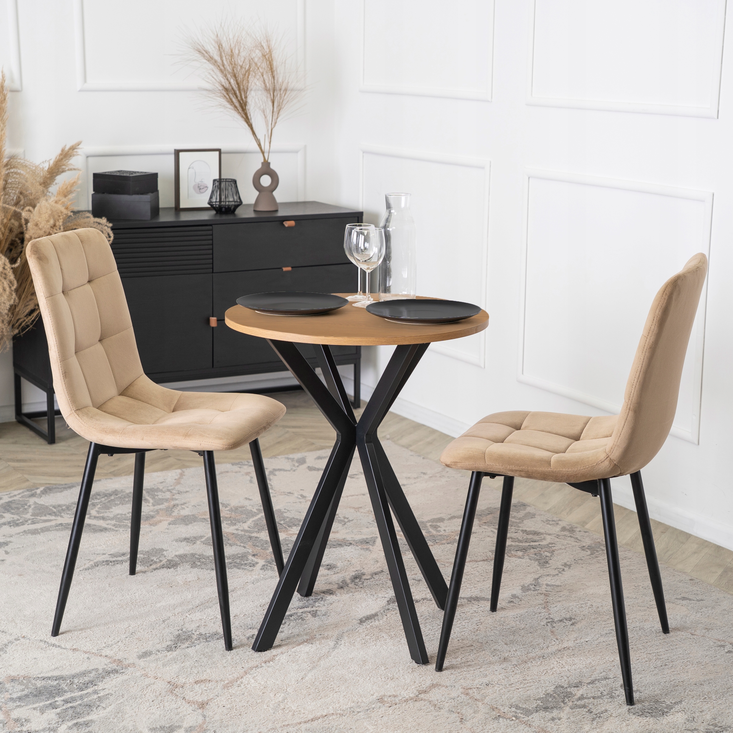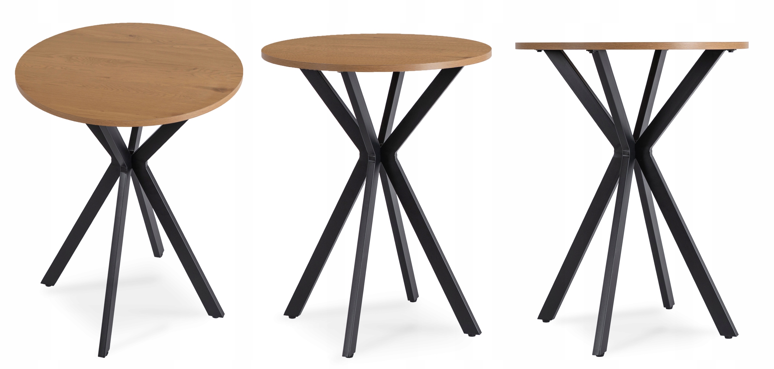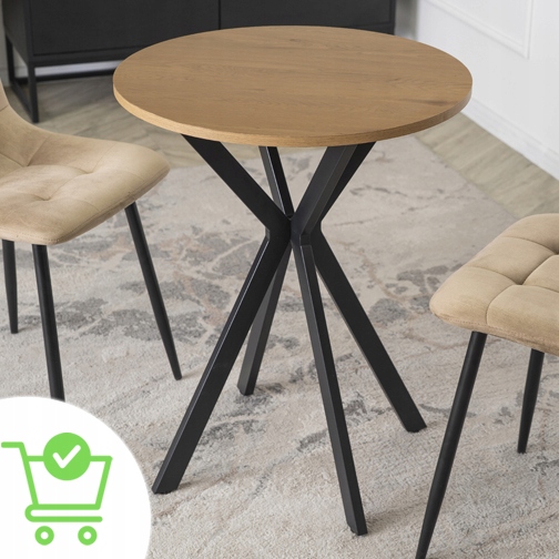 Stół o wymiarach 60 x 60 x 75,5 cm to idealny wybór do jadalni, kuchni lub salonu. Jego okrągły blat w odcieniu dębu prezentuje się wyjątkowo stylowo. Stabilna podstawa w formie czarnych metalowych nóg krzyżowych dodaje mu charakteru.