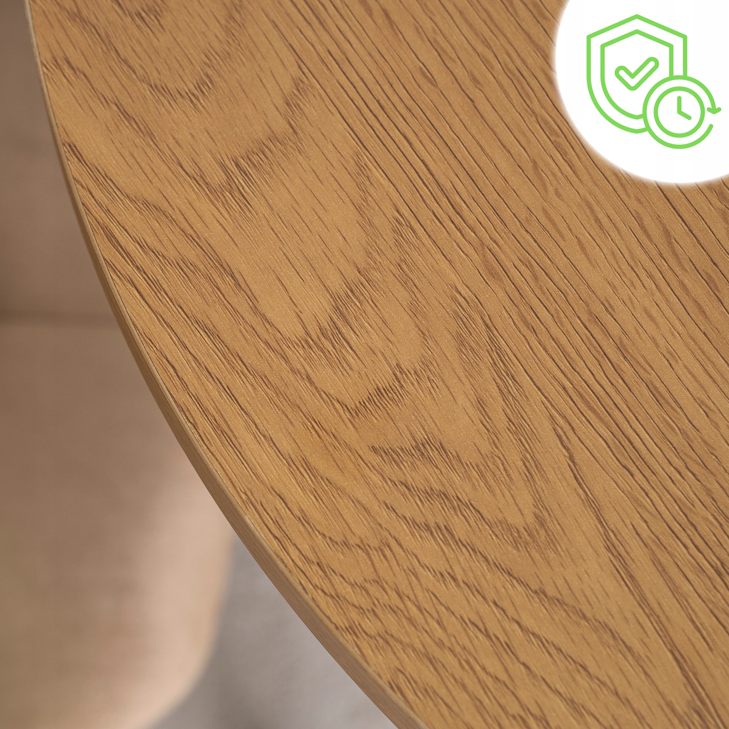 Blat wykonano z płyty MDF z wykończeniem w kolorze złotego dębu. Materiał ten zapewnia trwałość, a jednocześnie efektowny wygląd z widocznym usłojeniem. Powierzchnia blatu jest zabezpieczona warstwą ochronną ułatwiającą pielęgnację.