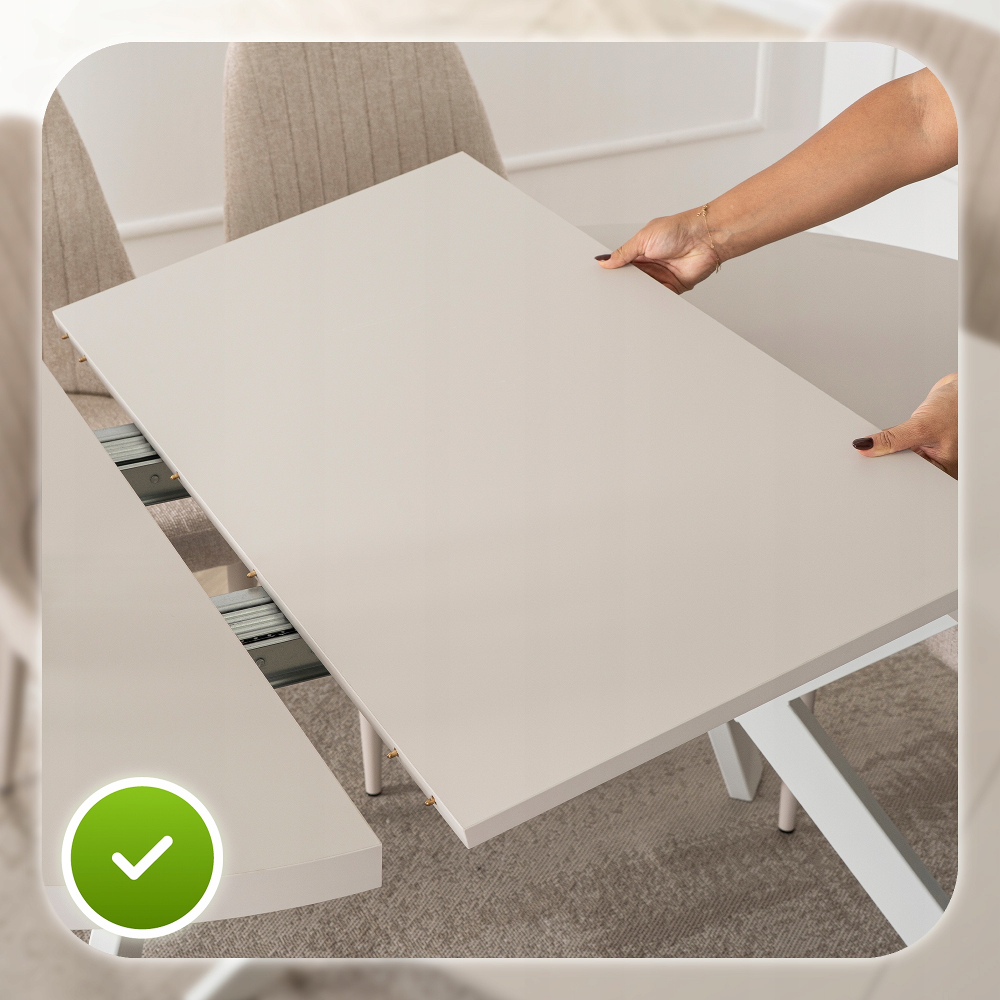 - Odporność na codzienne użytkowanie – solidna płyta MDF gwarantuje stabilność i długą żywotność stołu, nawet przy częstym rozkładaniu.