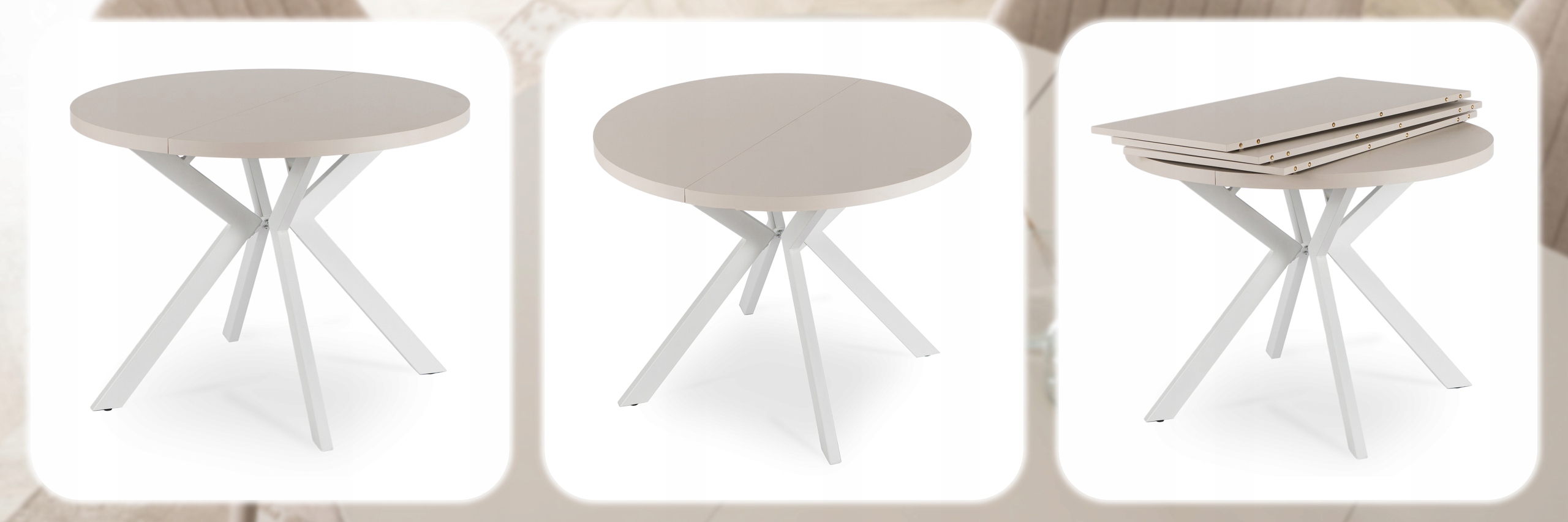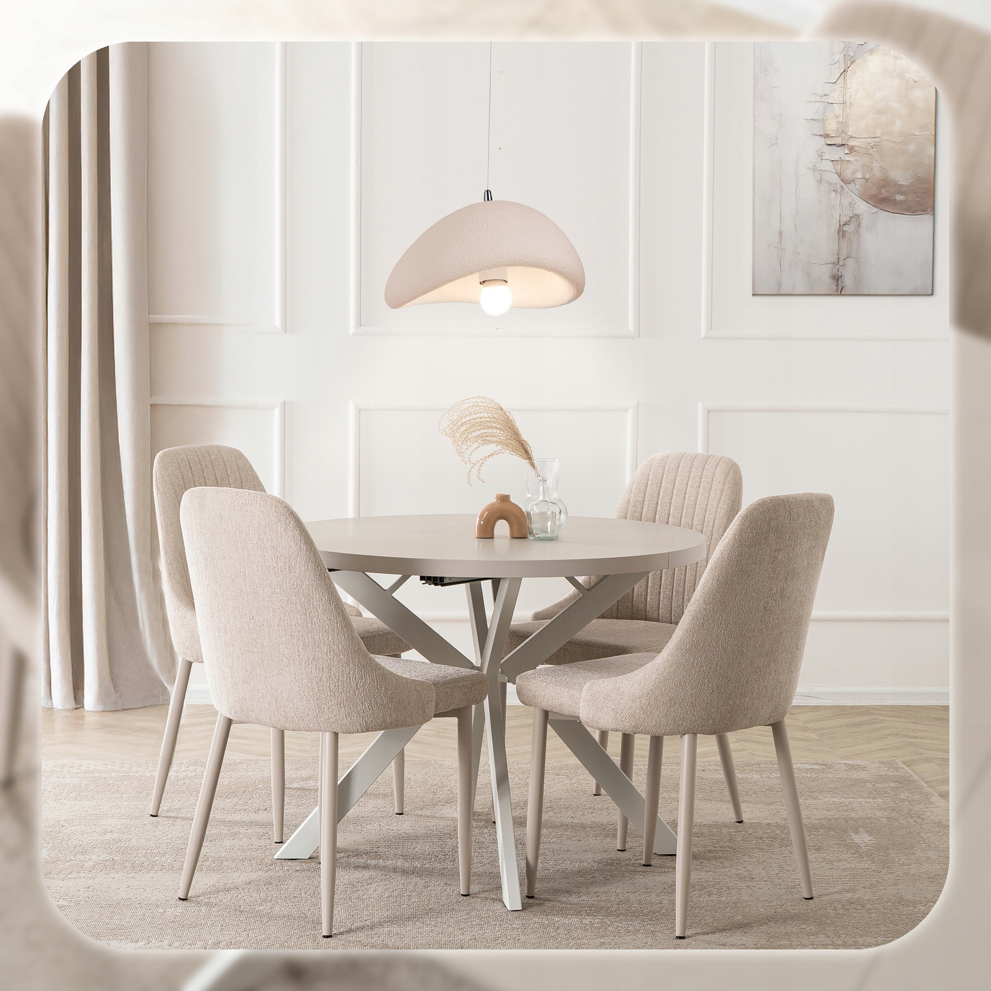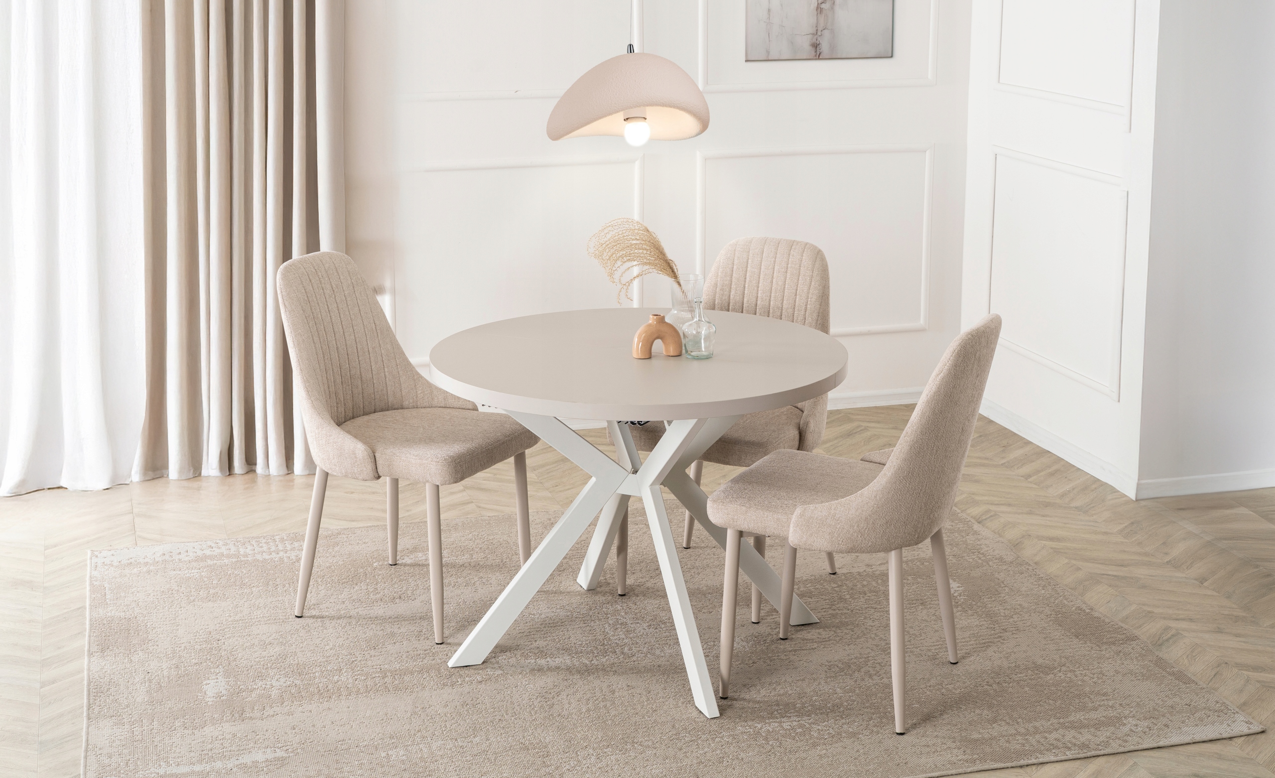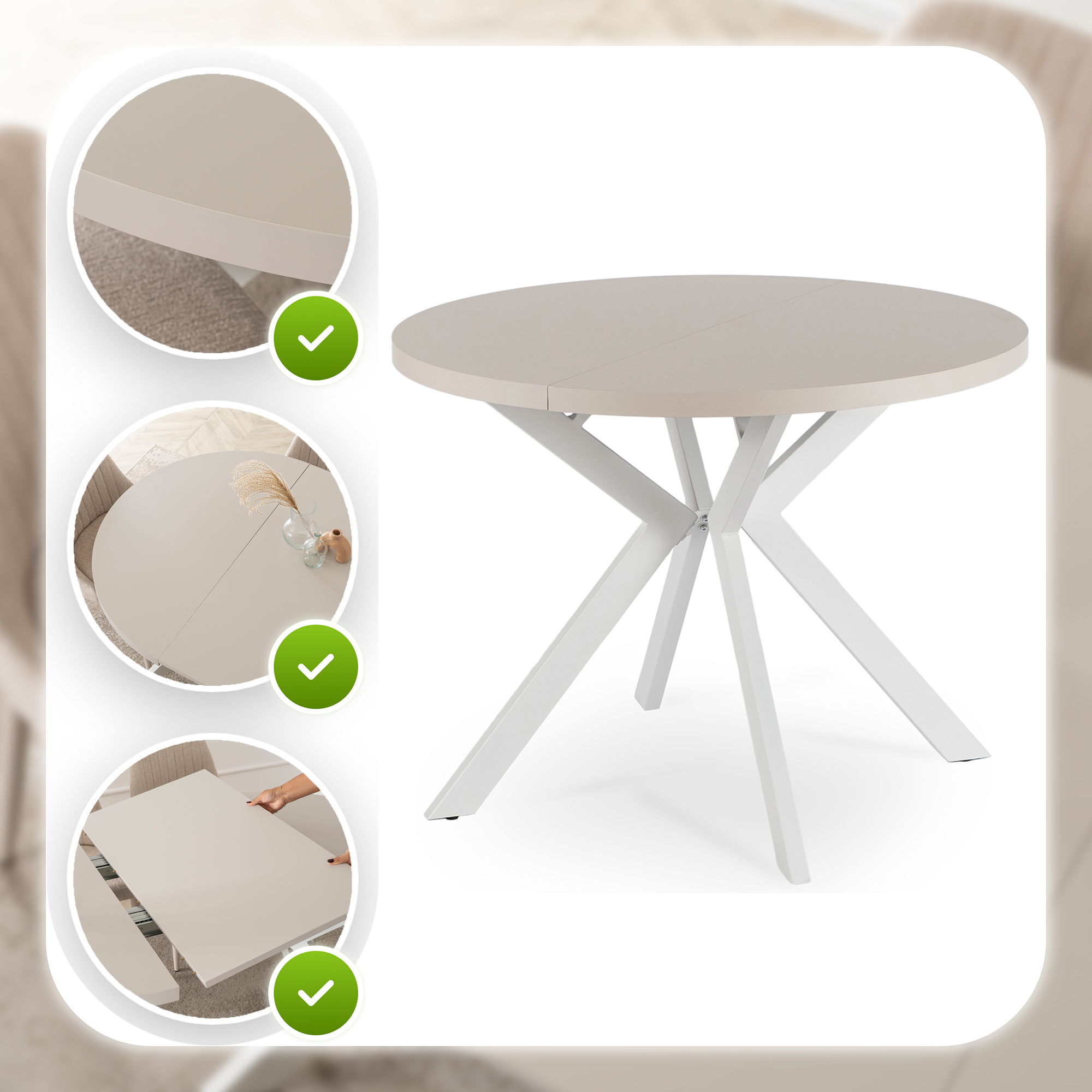Jego rozsuwany, okrągły blat w kolorze kaszmiru zachwyca naturalnym nowoczesnym designem, doskonale komponując się z różnymi aranżacjami wnętrz.
