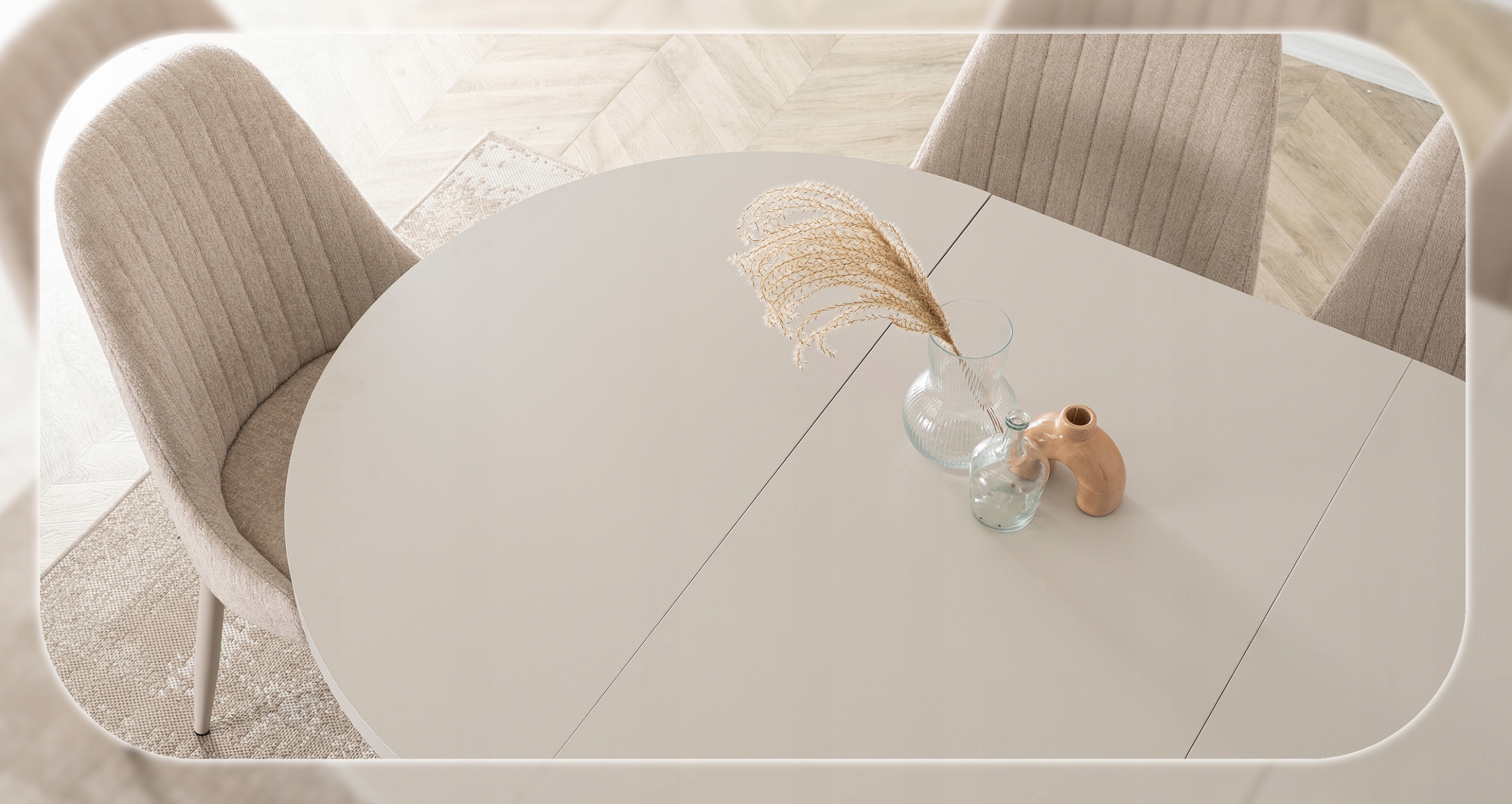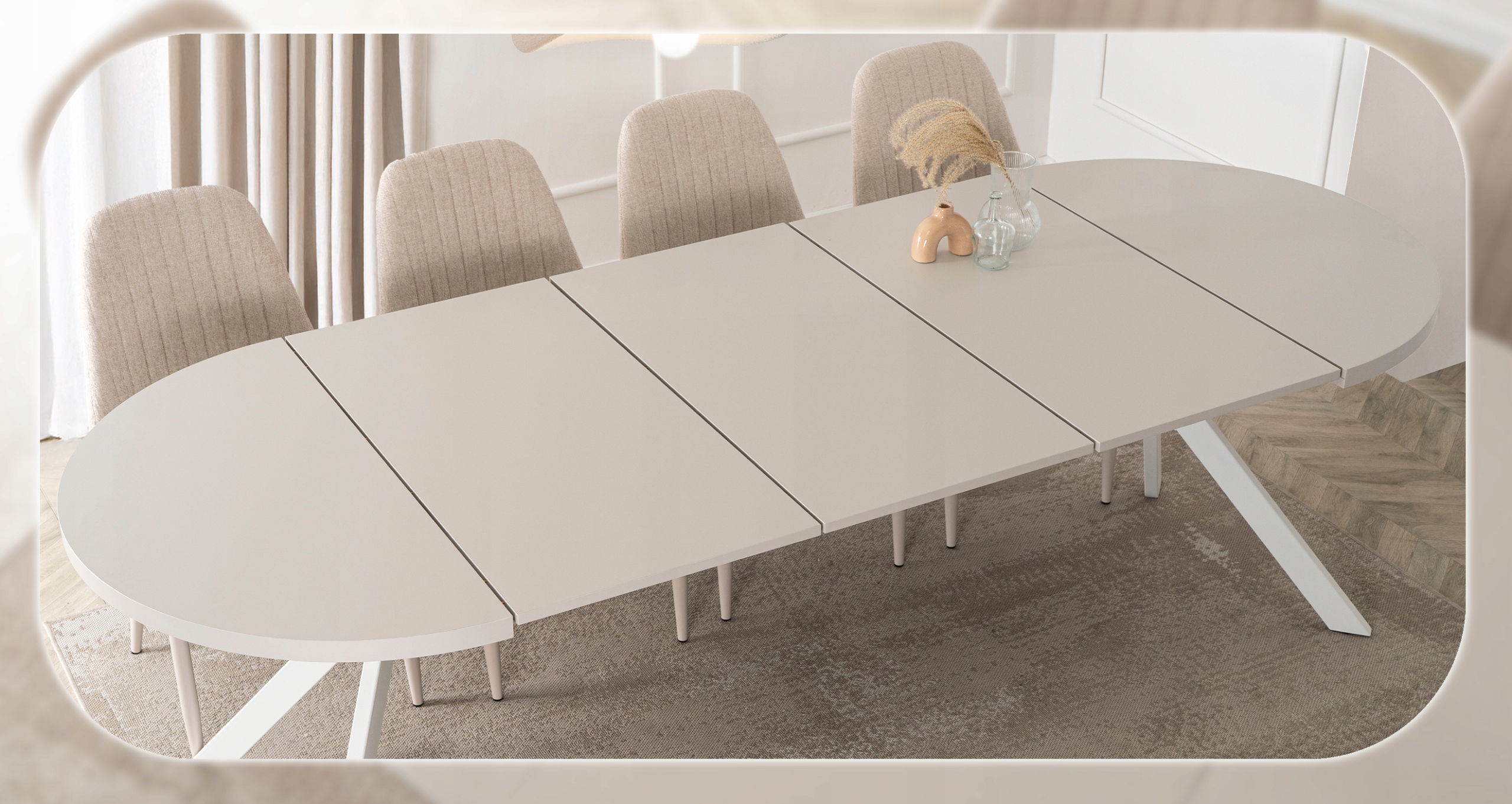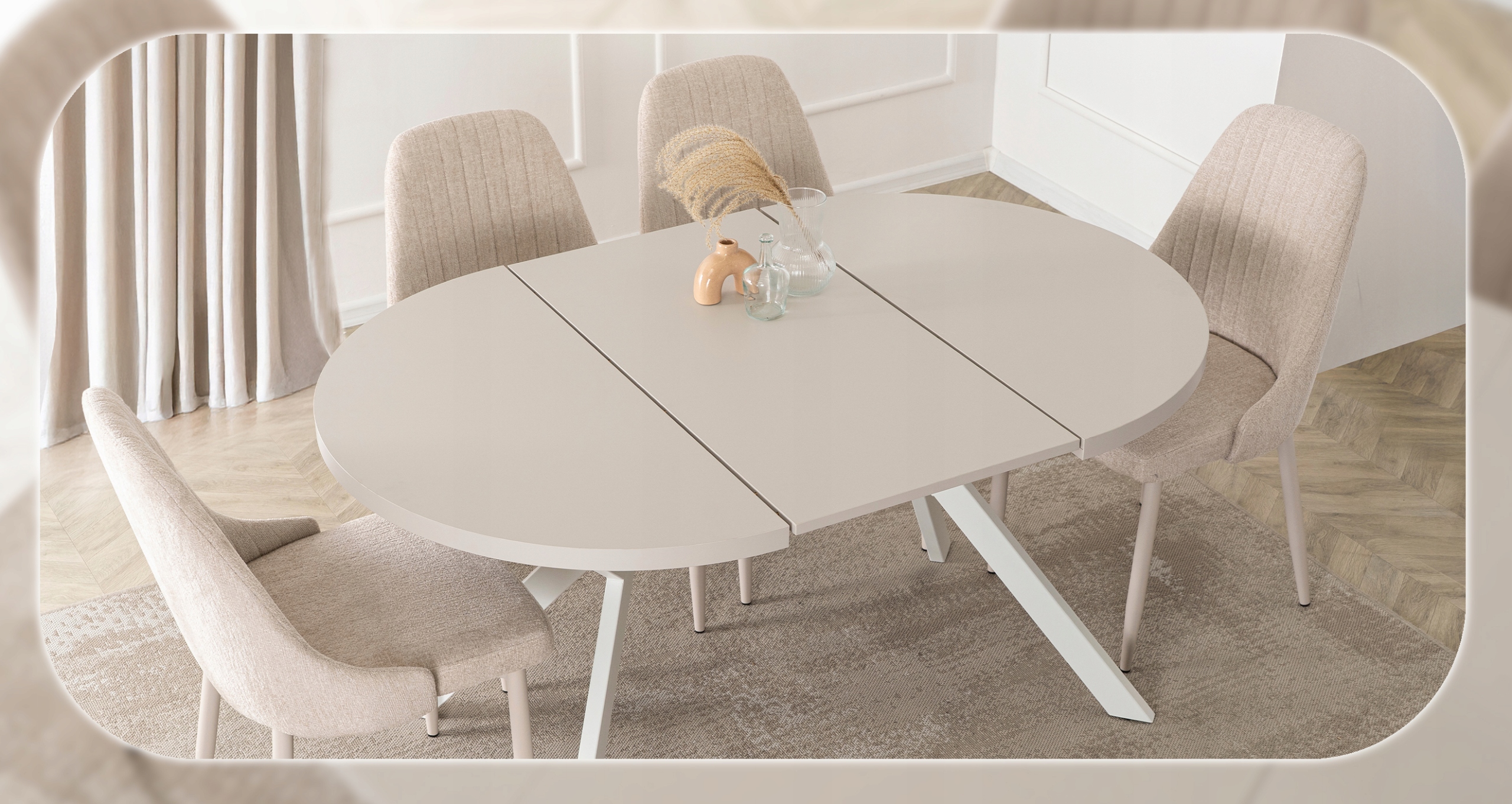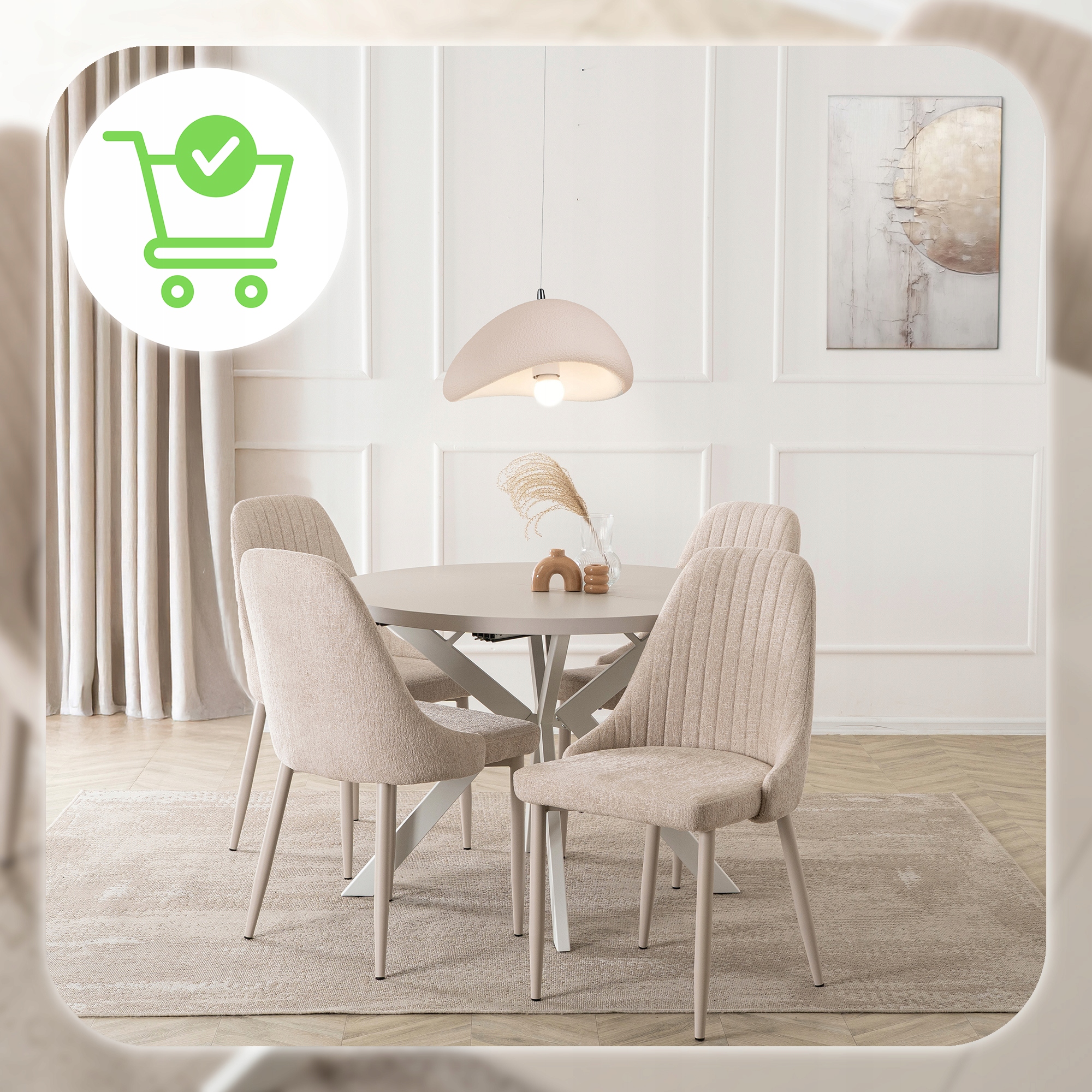 Jego rozsuwany, okrągły blat w kolorze kaszmiru zachwyca naturalnym nowoczesnym designem, doskonale komponując się z różnymi aranżacjami wnętrz.