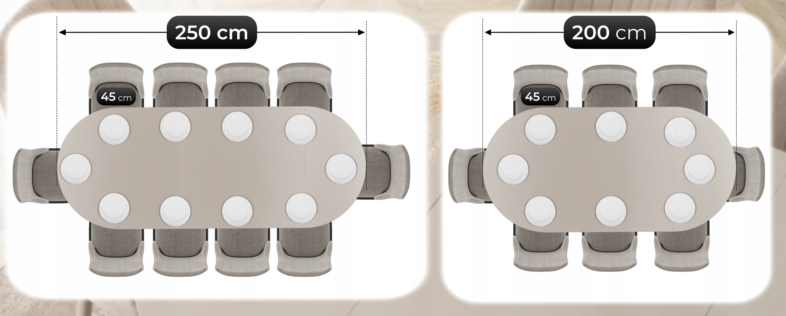 - Stół z trzema wkładkami (250 cm) – bez problemu zmieści nawet 10 krzeseł, zapewniając komfort podczas dużych przyjęć i spotkań z przyjaciółmi.