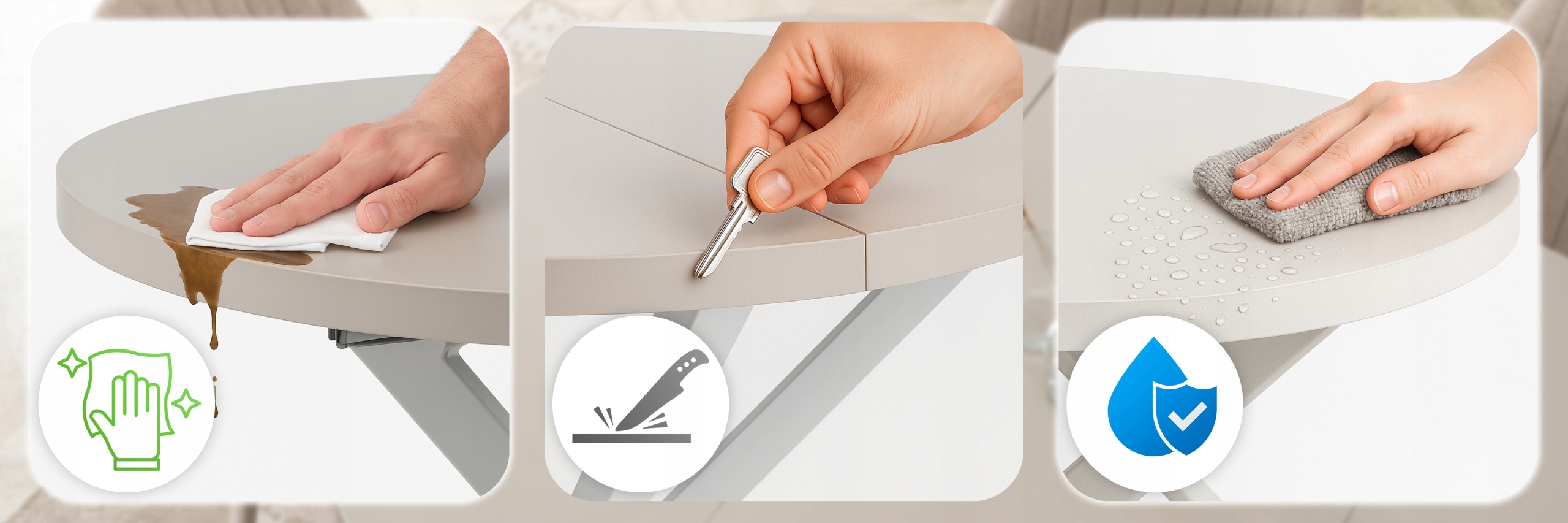 - Bezpieczny wybór do domu z dziećmi – gładka, wytrzymała powierzchnia nie ulega łatwo pęknięciom ani wgnieceniom.