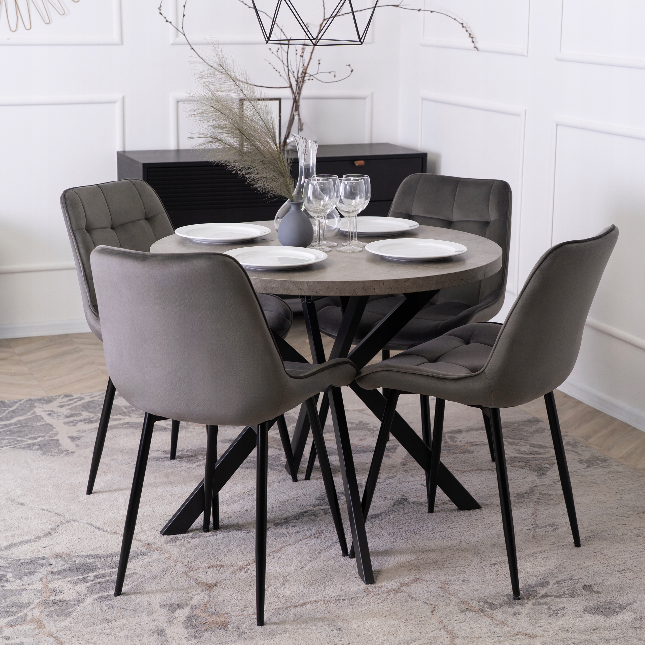 Stół o wymiarach 90 x 90 x 75,5 cm to idealny wybór do jadalni, kuchni lub salonu. Jego okrągły blat w odcieniu betonu prezentuje się wyjątkowo stylowo i surowo, nawiązując do estetyki industrialnej i loftowej. Stabilna podstawa w formie czarnych metalowych nóg krzyżowych dodaje mu charakteru i lekkości.