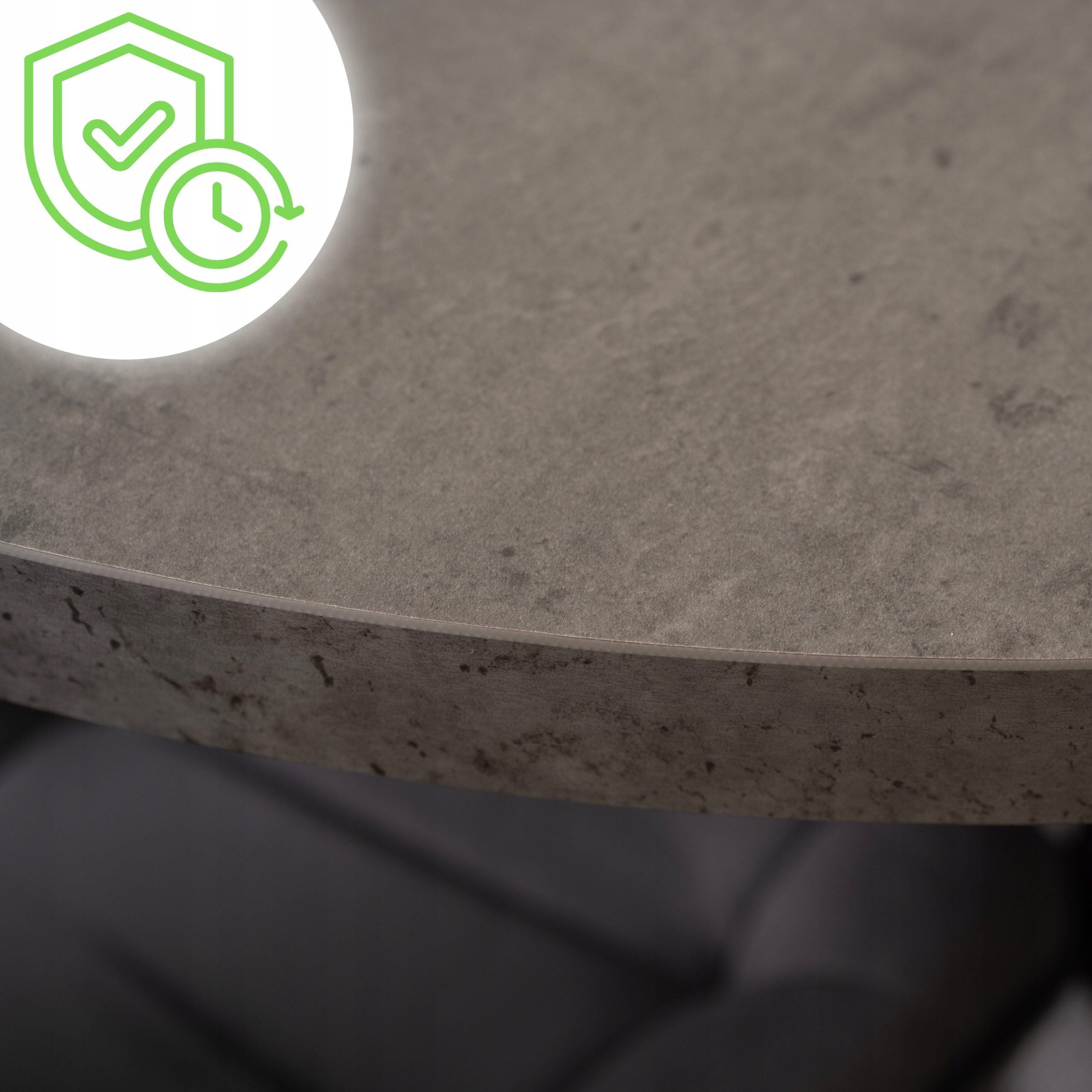 Blat stołu LUGO wykonany jest z płyty MDF pokrytej dekoracyjną warstwą imitującą beton architektoniczny, co zapewnia mu wyjątkowy wygląd i praktyczność w codziennym użytkowaniu.