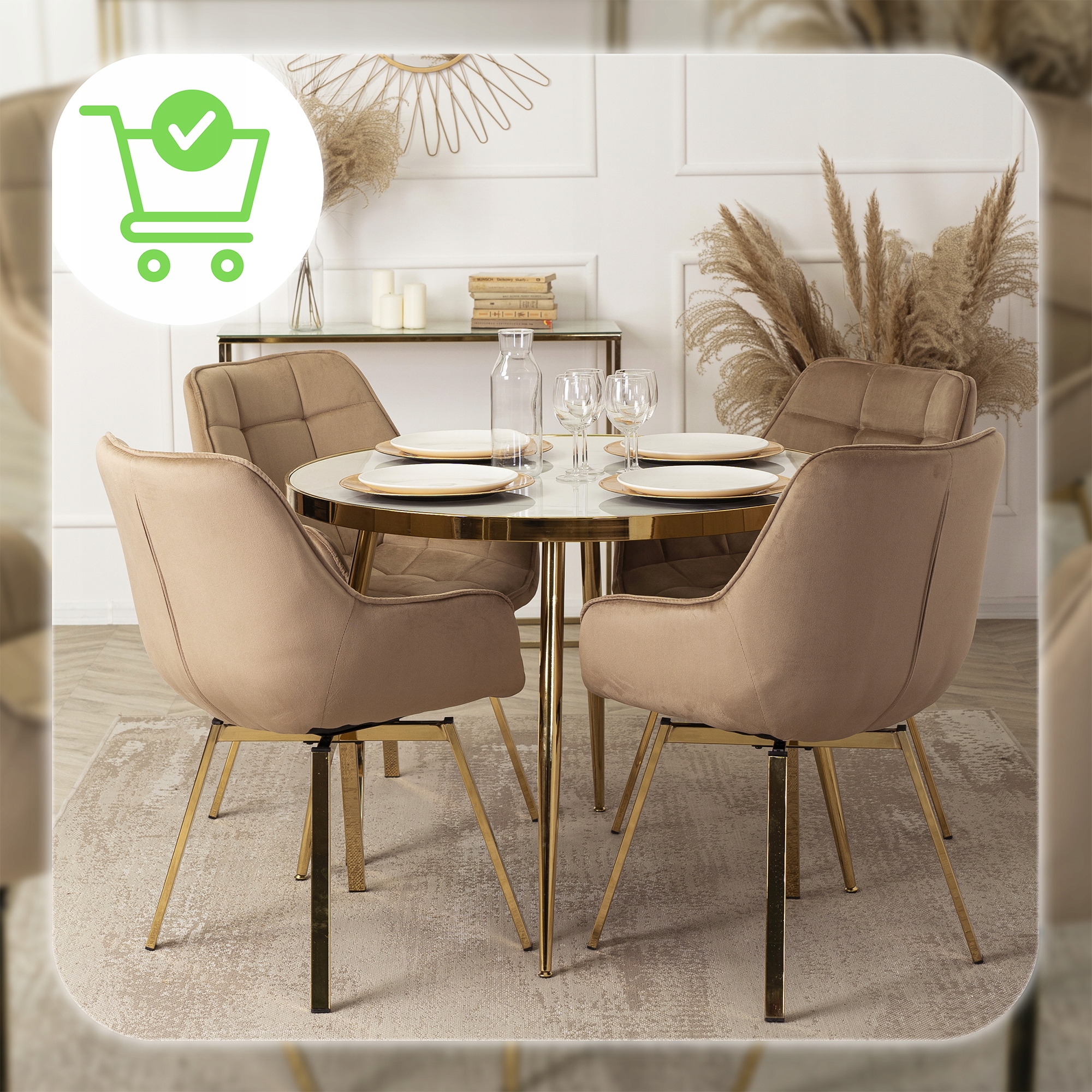 - Chromowane nogi i obręcz w złotym wykończeniu – stabilna konstrukcja, która jednocześnie dodaje wnętrzu luksusowego charakteru.