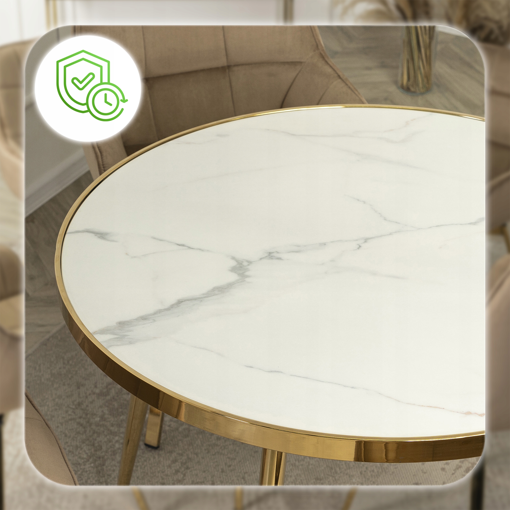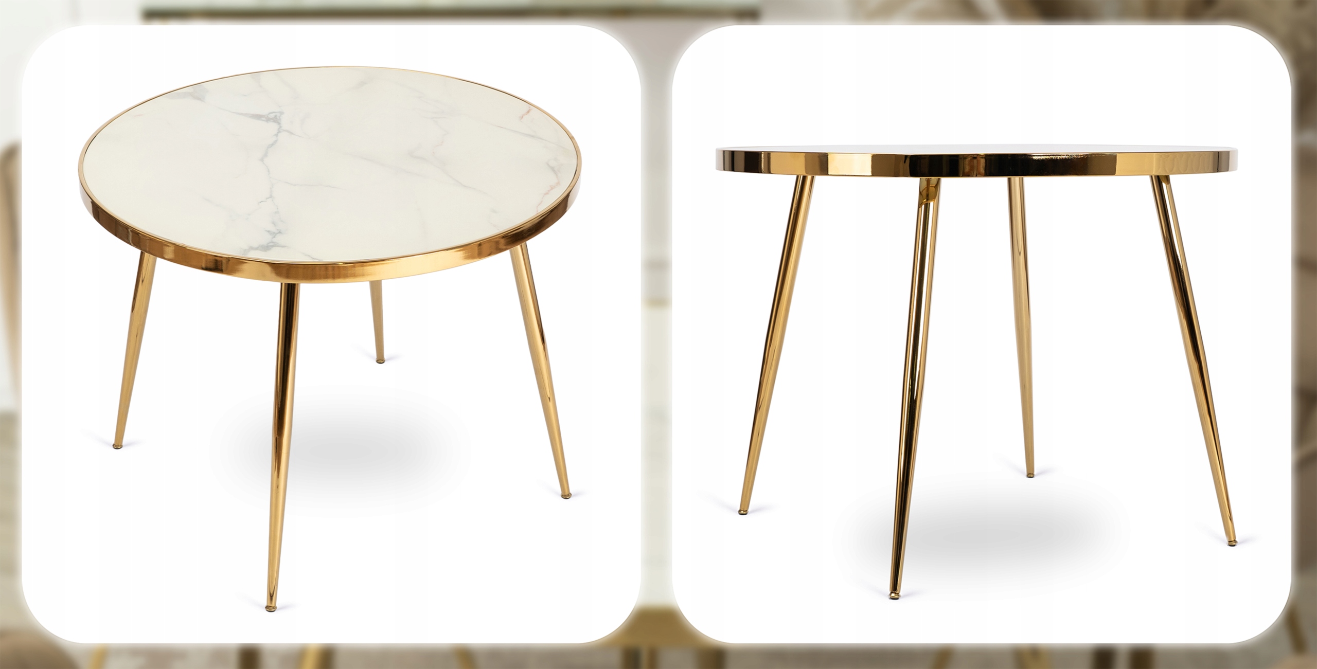 - Chromowany metal w złotym kolorze – nogi i obręcz stołu zostały pokryte elegancką powłoką, która dodaje wnętrzu luksusowego charakteru.