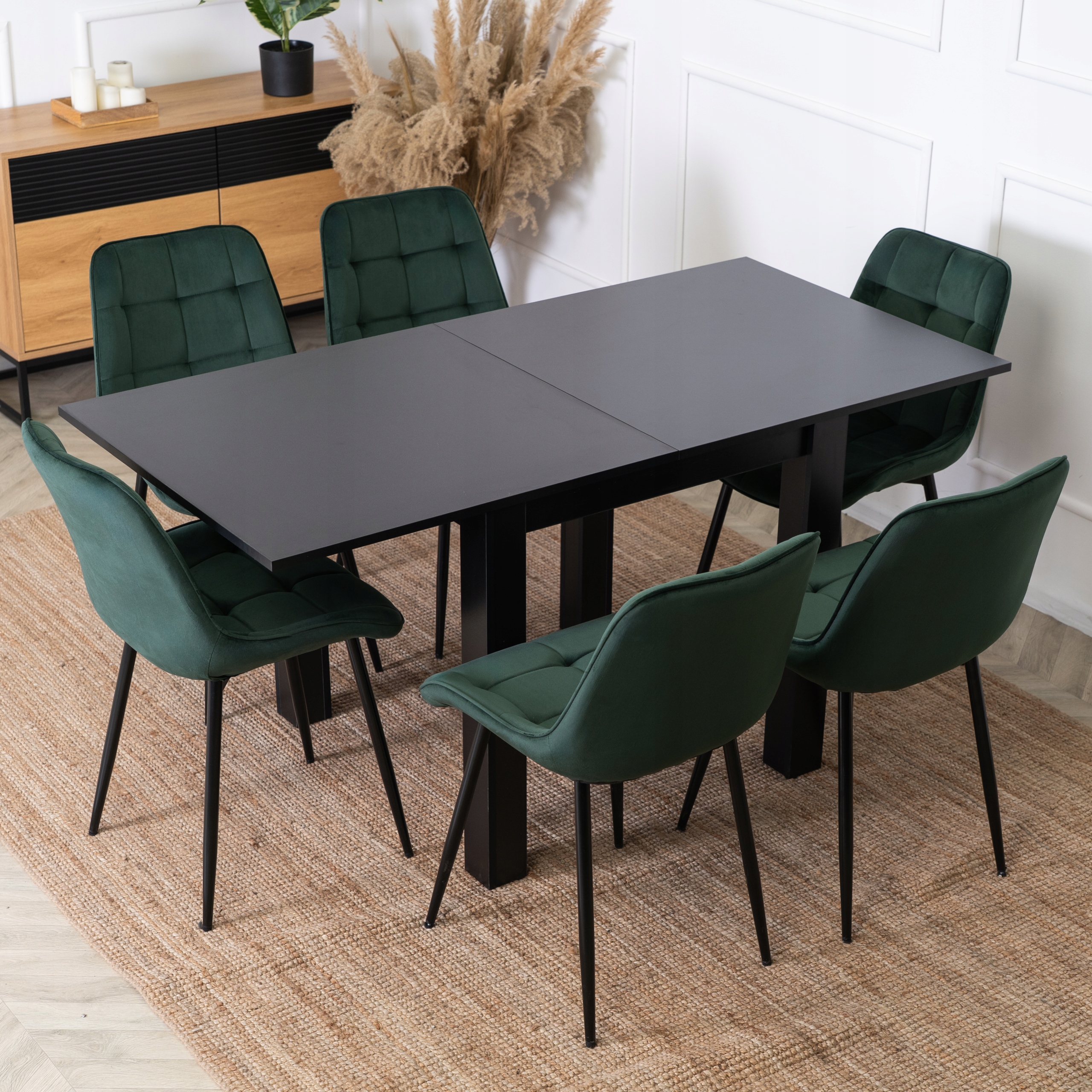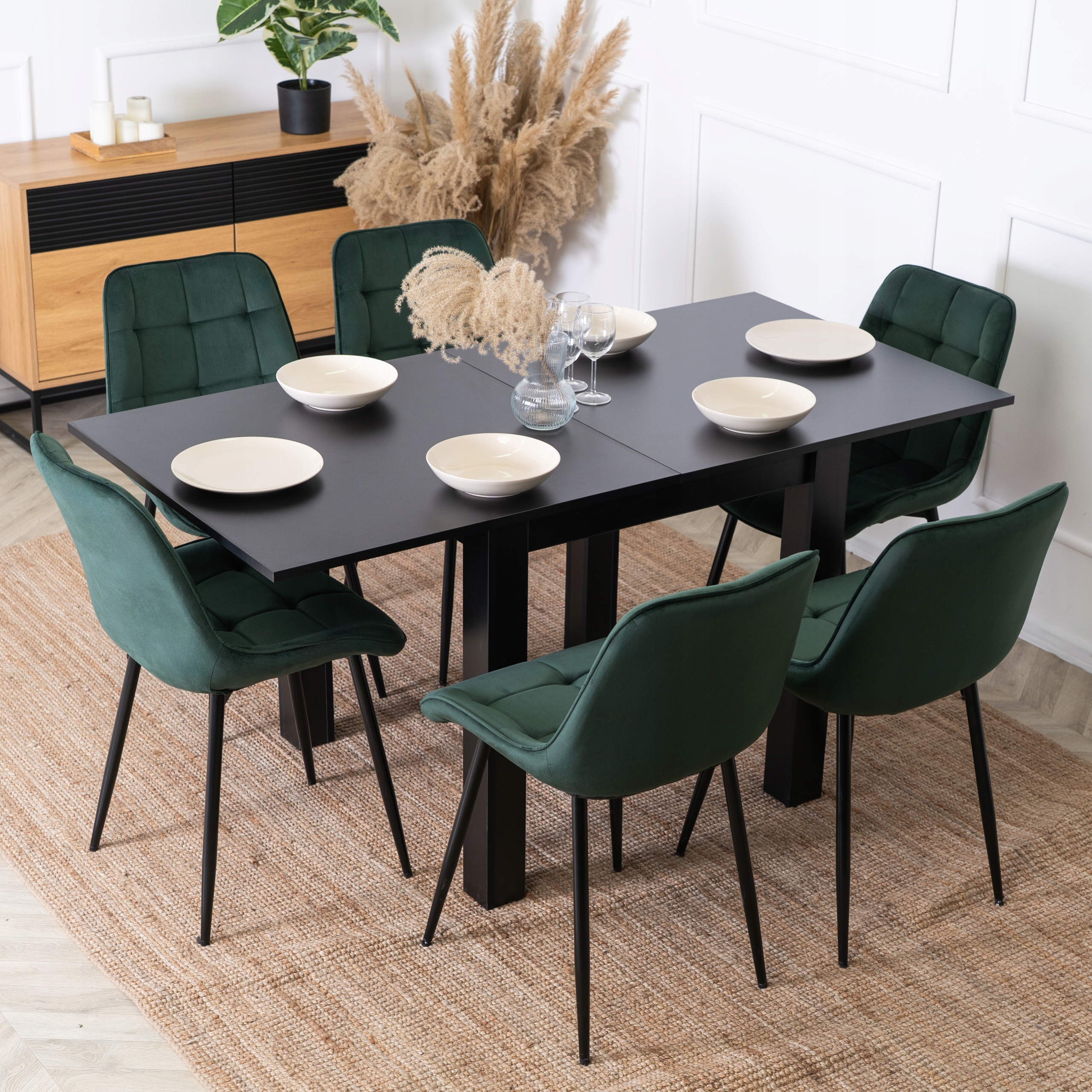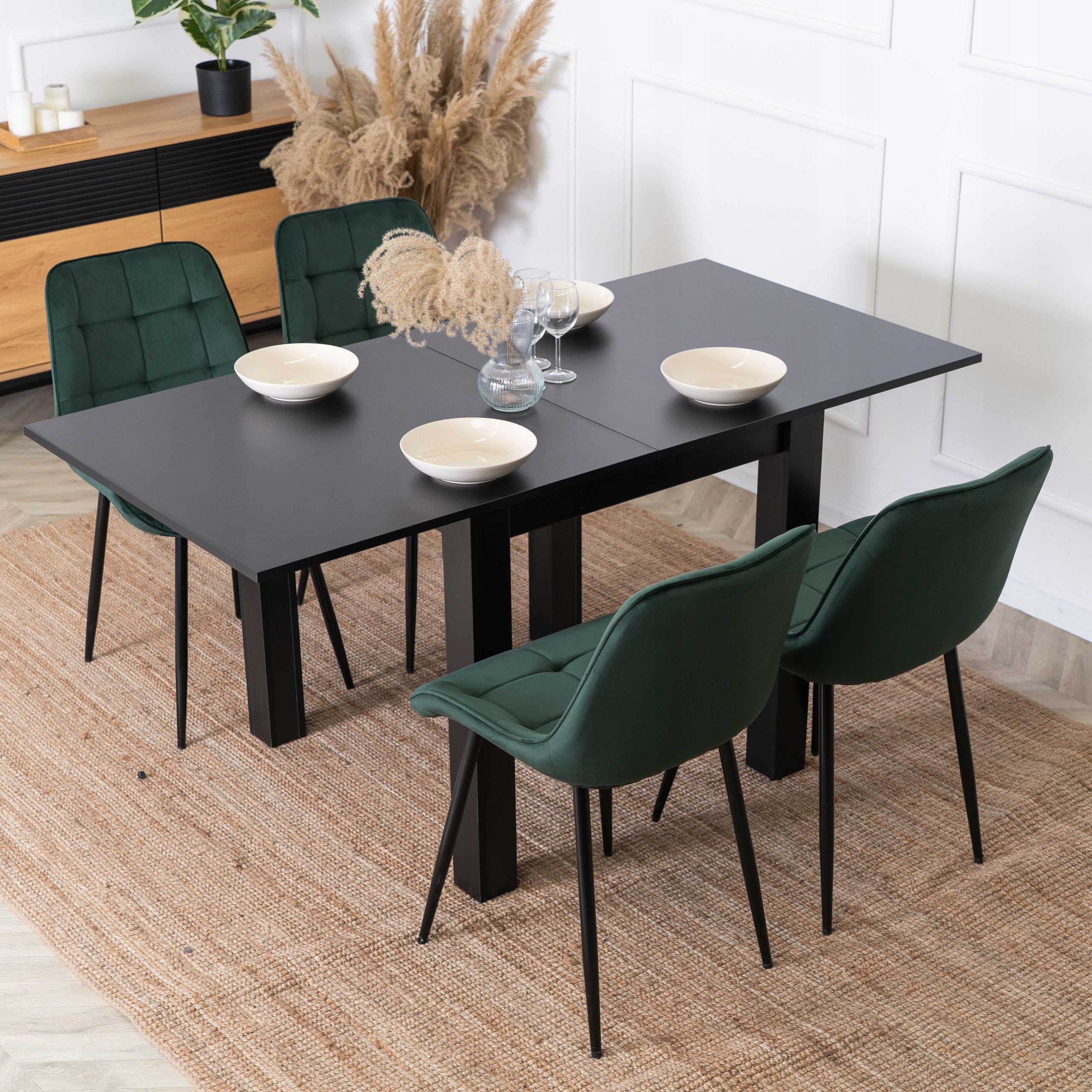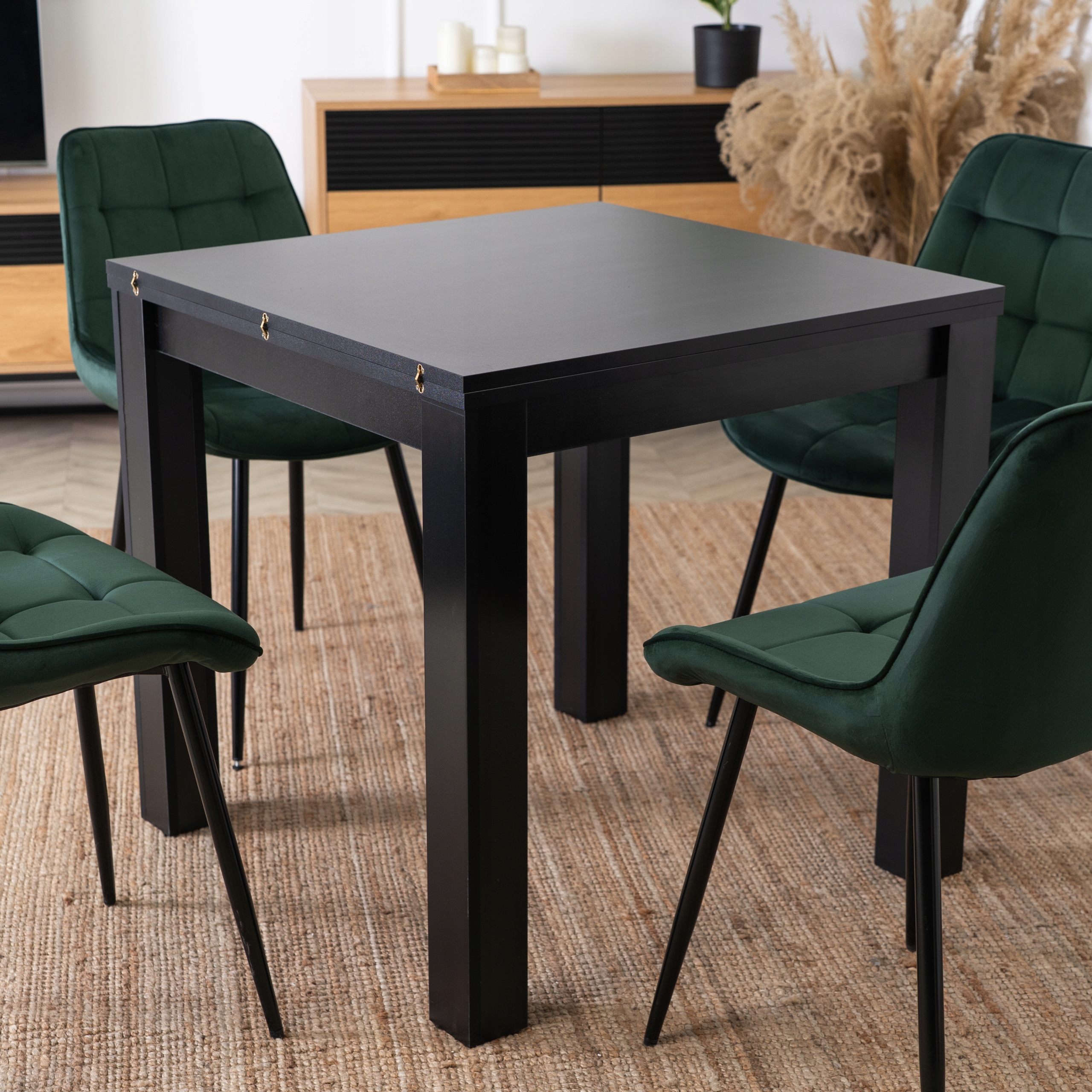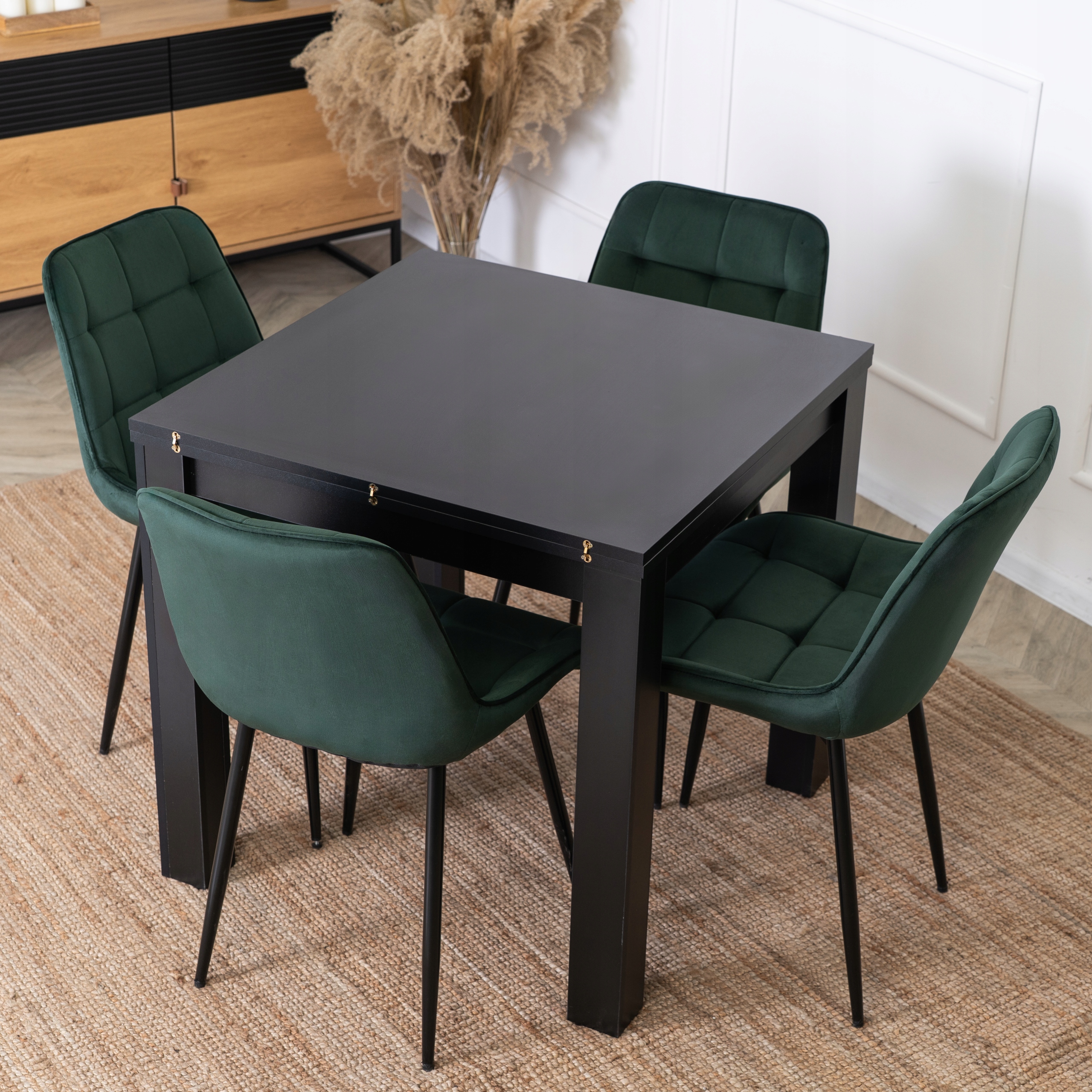 ⭐ Jego modny czerni nadaje elegancji i lekkości. Stół można rozłożyć, zyskując dodatkowe miejsce dla gości.