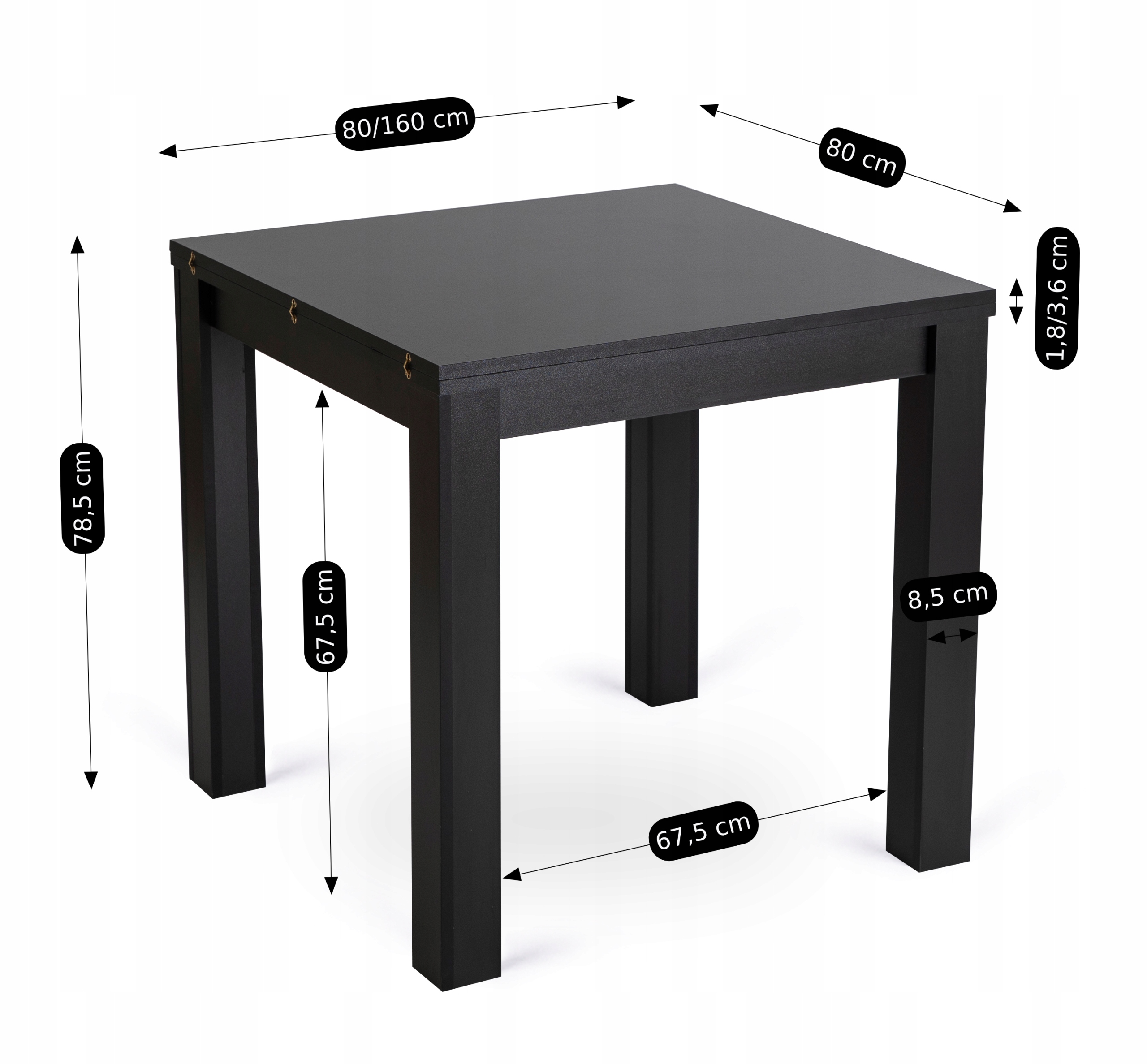 Stół o wymiarach 80/160 x 80 x 78,5 cm to piękny mebel idealny do kuchni, jadalni, salonu. Ma kwadratowy, rozkładany blat w eleganckim czarnym kolorze.