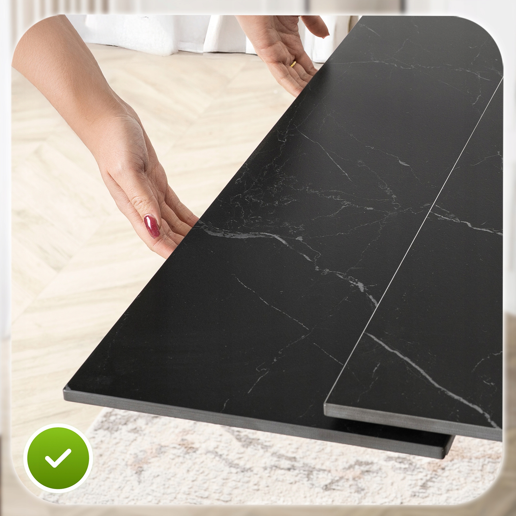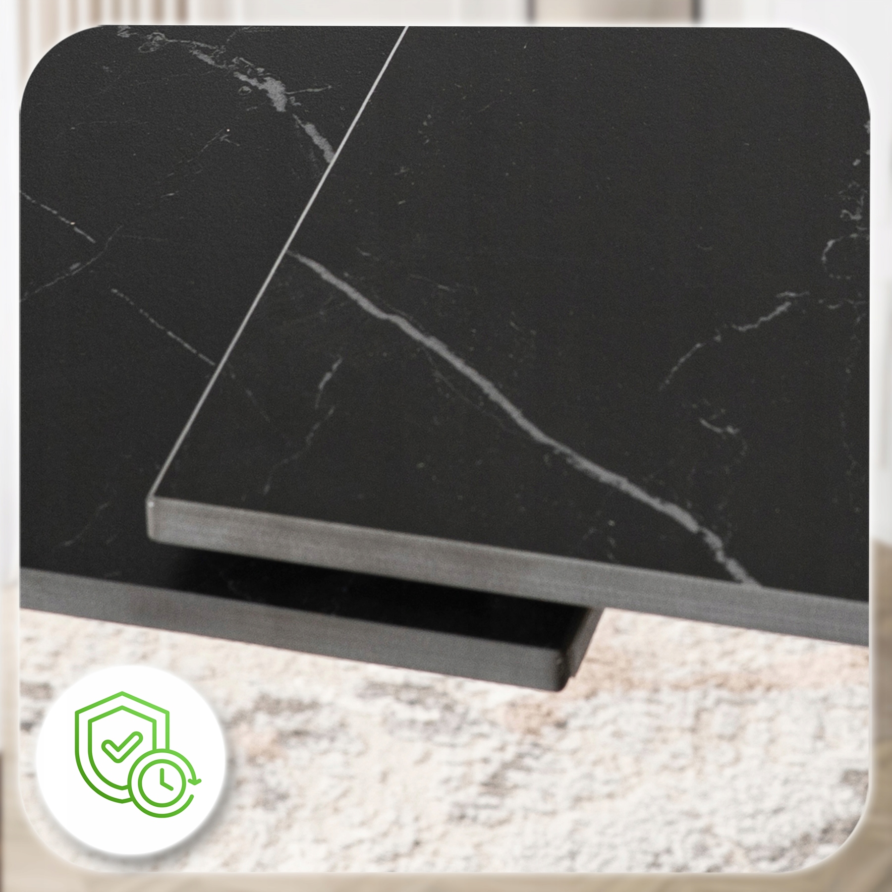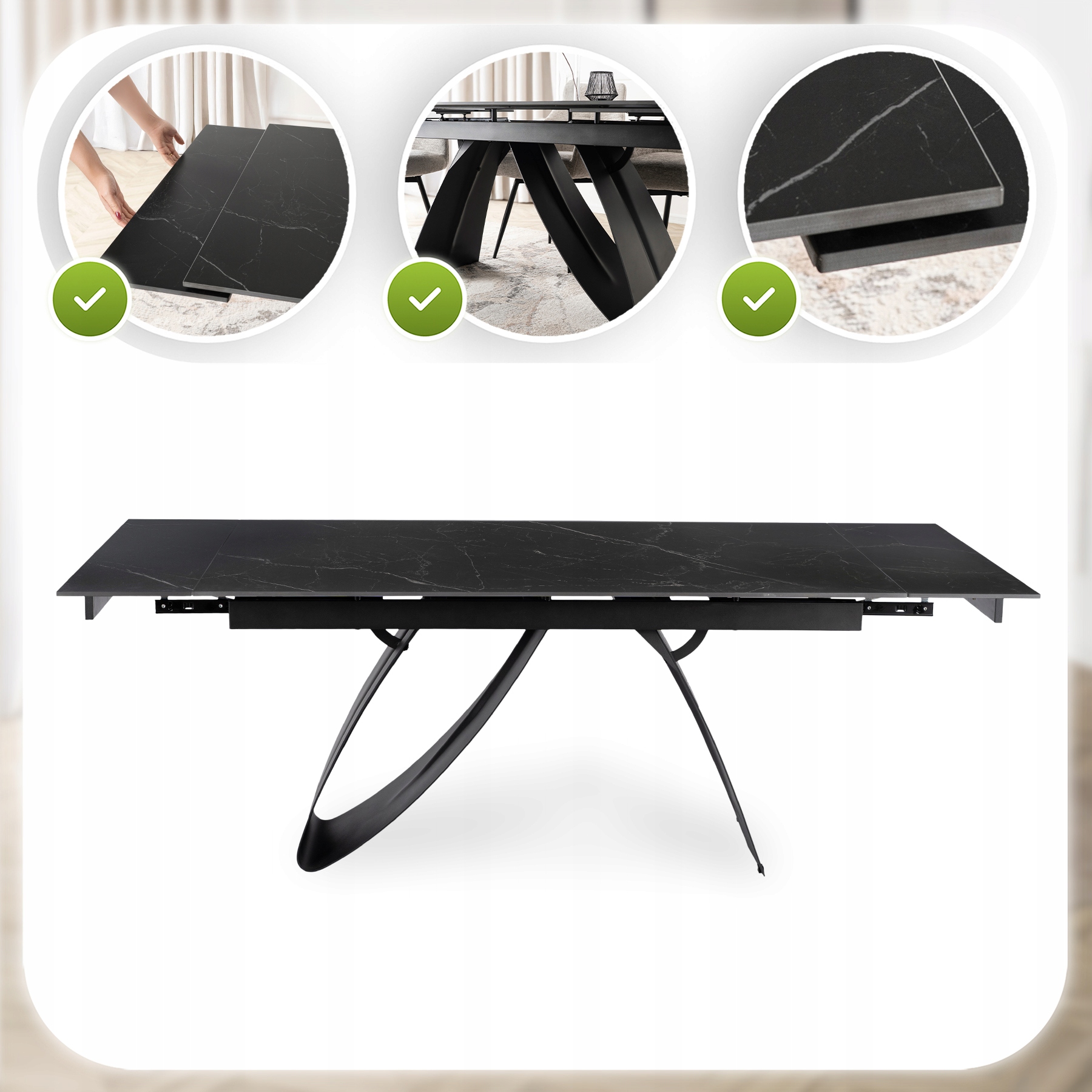 - Ceramika klasy premium – blat stołu jest niezwykle trwały, odporny na zarysowania i wysokie temperatury.