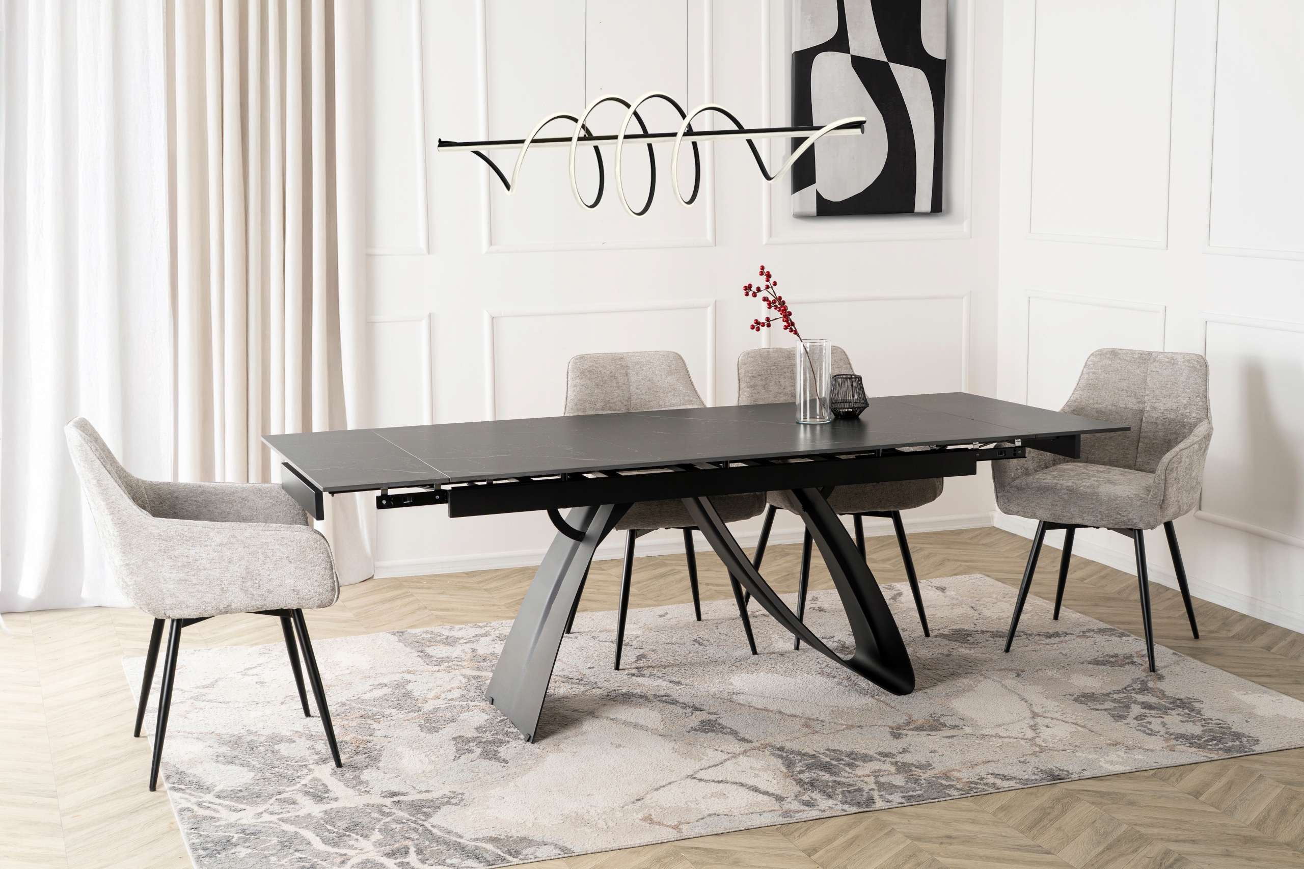 - Mechanizm rozkładania do 220 cm – stół wyposażono w dwie dyskretnie ukryte wkładki, które płynnie wysuwają się na prowadnicach po obu stronach blatu.