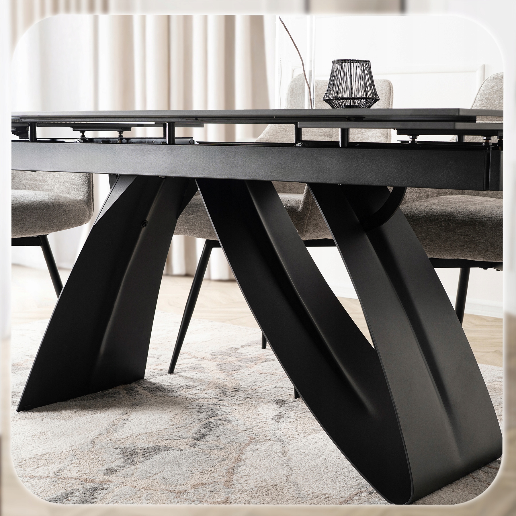 Stylowa podstawa stołu wykonana z wysokiej jakości metalu w kolorze czarnym. Jej nowoczesny, geometryczny design nie tylko zachwyca wyglądem, ale również zapewnia stabilność i trwałość całej konstrukcji.