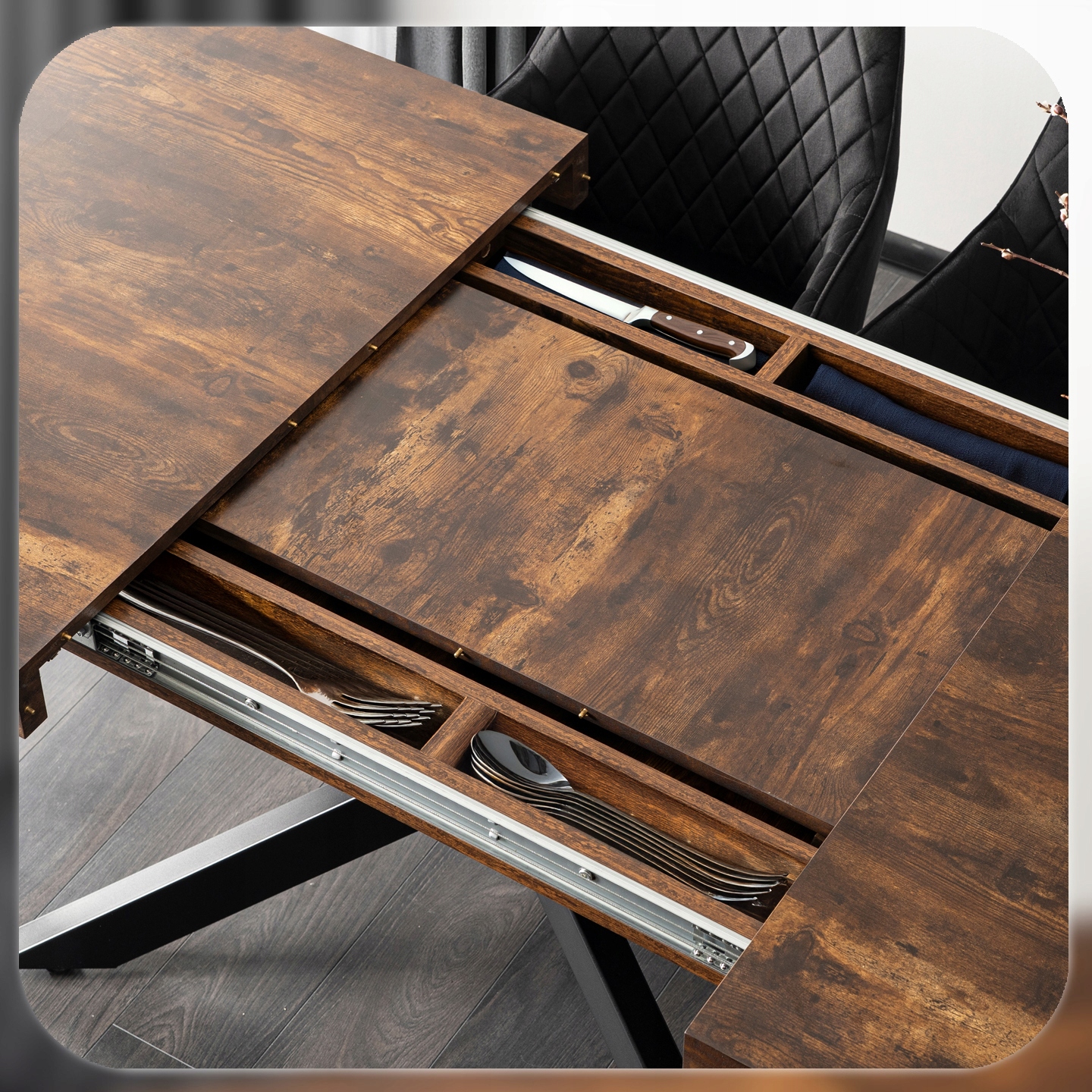 Pod blatem stołu znajdują się prostokątne schowki, które idealnie sprawdzą się do przechowywania sztućców, serwetek czy innych niezbędnych akcesoriów stołowych.