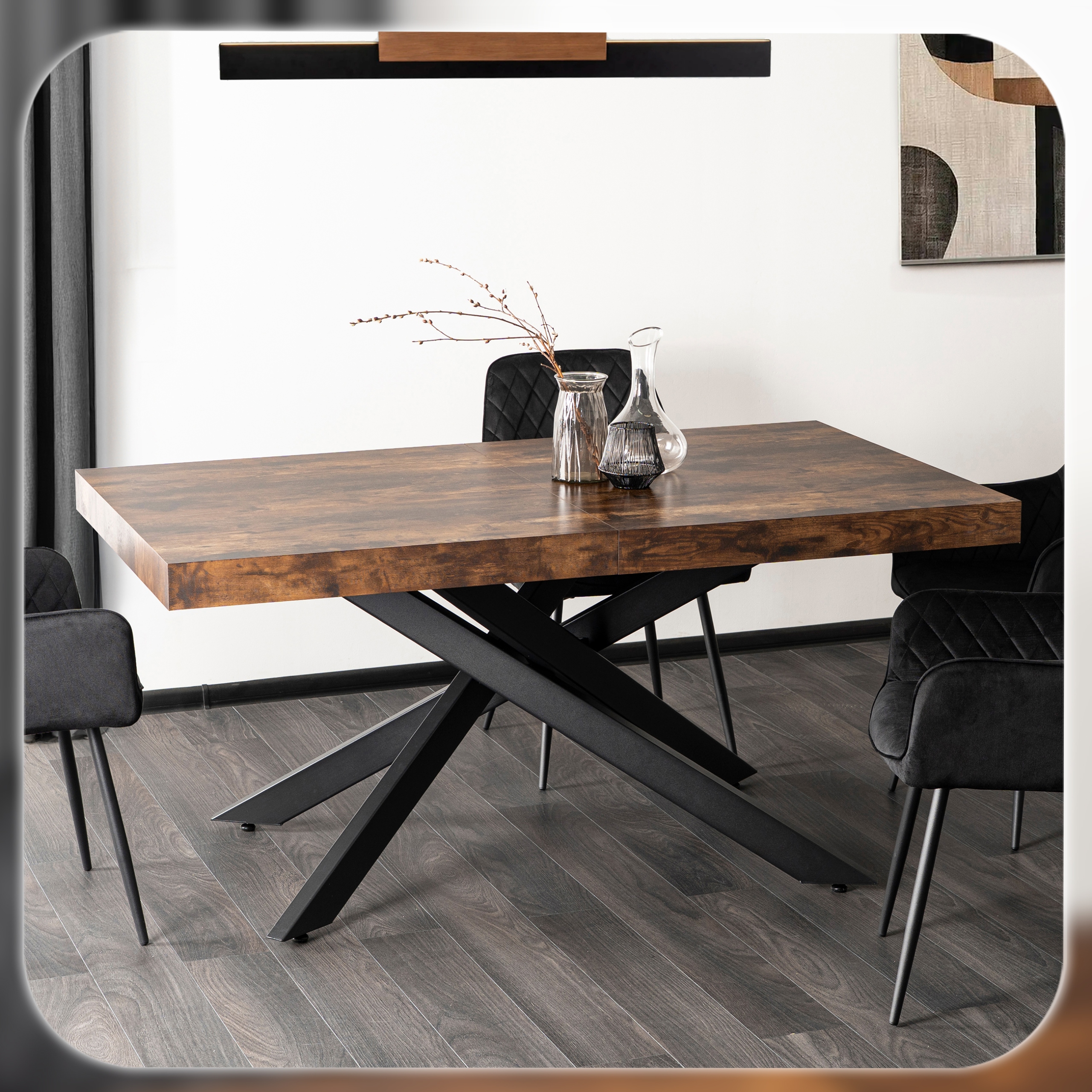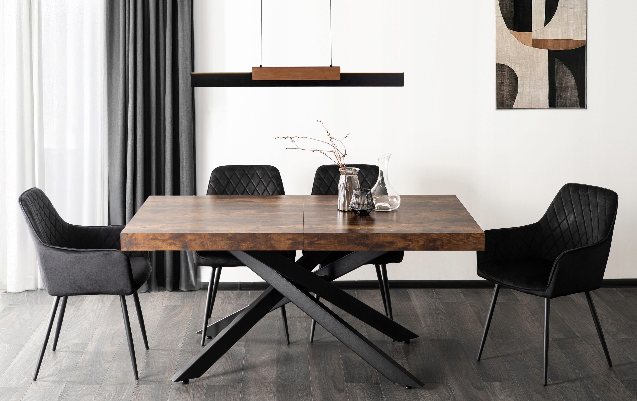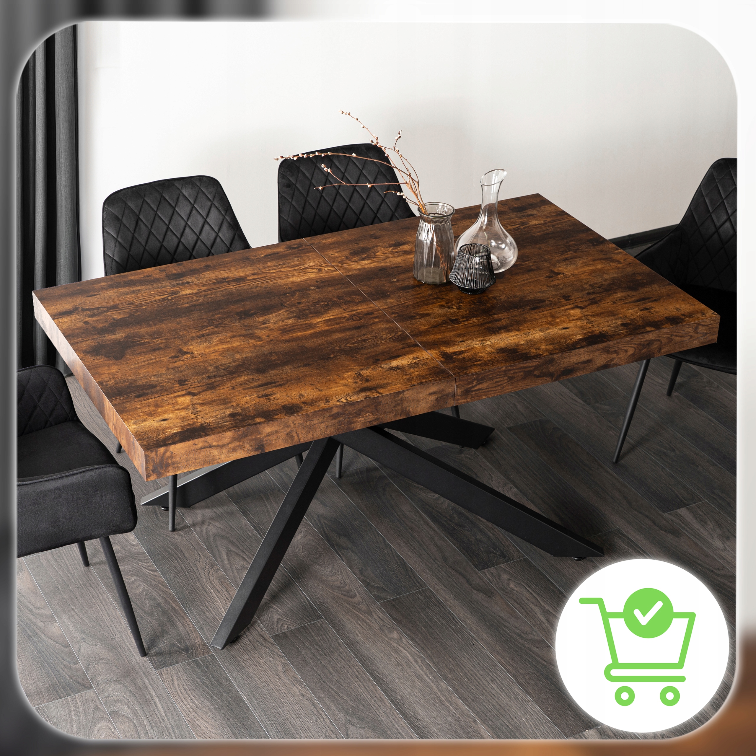 Stół HAMPTON to funkcjonalny i elegancki wybór do jadalni, salonu lub kuchni. Jego rozkładany blat w kolorze rustykalnego dębu zachwyca naturalnym nowoczesnym designem, doskonale komponując się z różnymi aranżacjami wnętrz. Stabilna podstawa w formie czarnych metalowych nóg nadaje mu wyjątkowego charakteru, a jednocześnie zapewnia trwałość i stabilność nawet przy maksymalnym rozłożeniu.