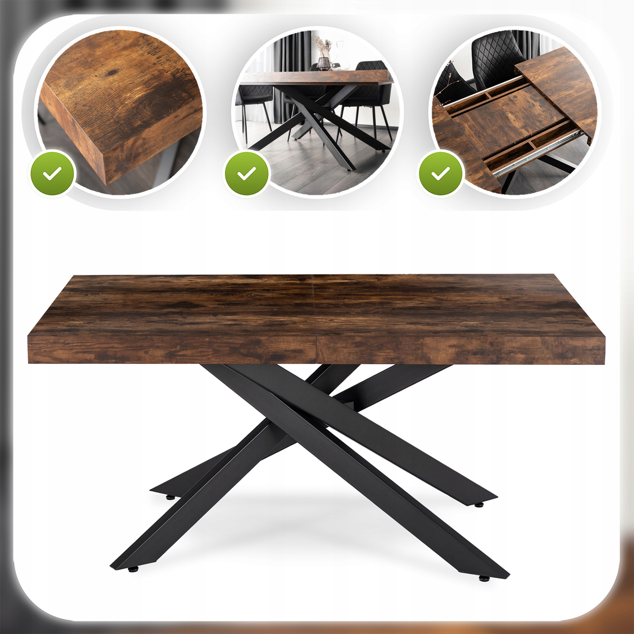 ✨ Stół Rozkładany Do Jadalni Salonu Kuchni Rustykalny Czarny HAMPTON 160-240