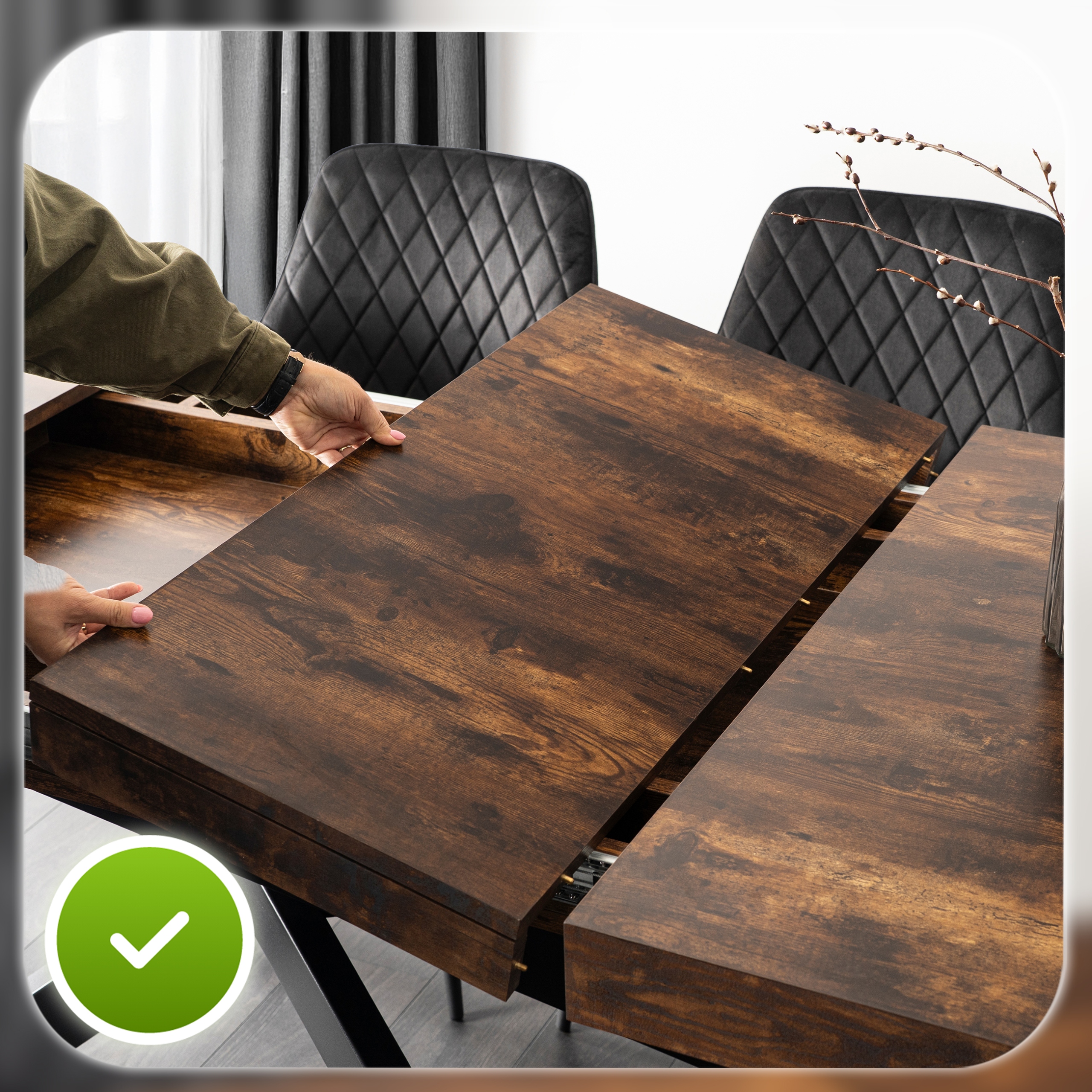 - Rozkładany blat – pozwala w kilka chwil powiększyć powierzchnię stołu, zapewniając wygodę podczas spotkań z rodziną i przyjaciółmi.