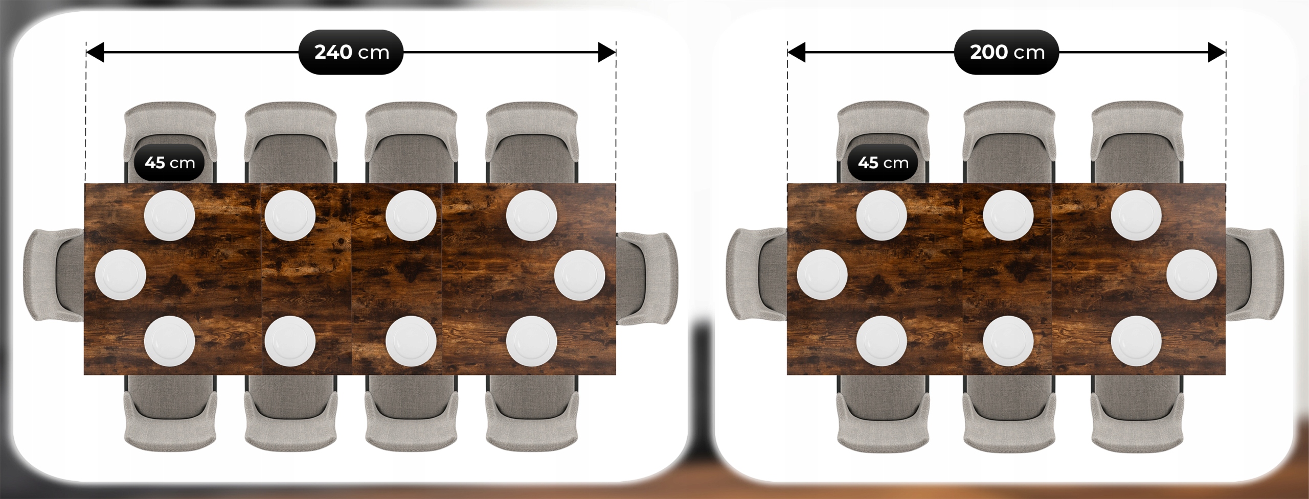 - Stół rozłożony (240 cm) – zalecana przestrzeń z krzesłami: 340 cm x 190 cm