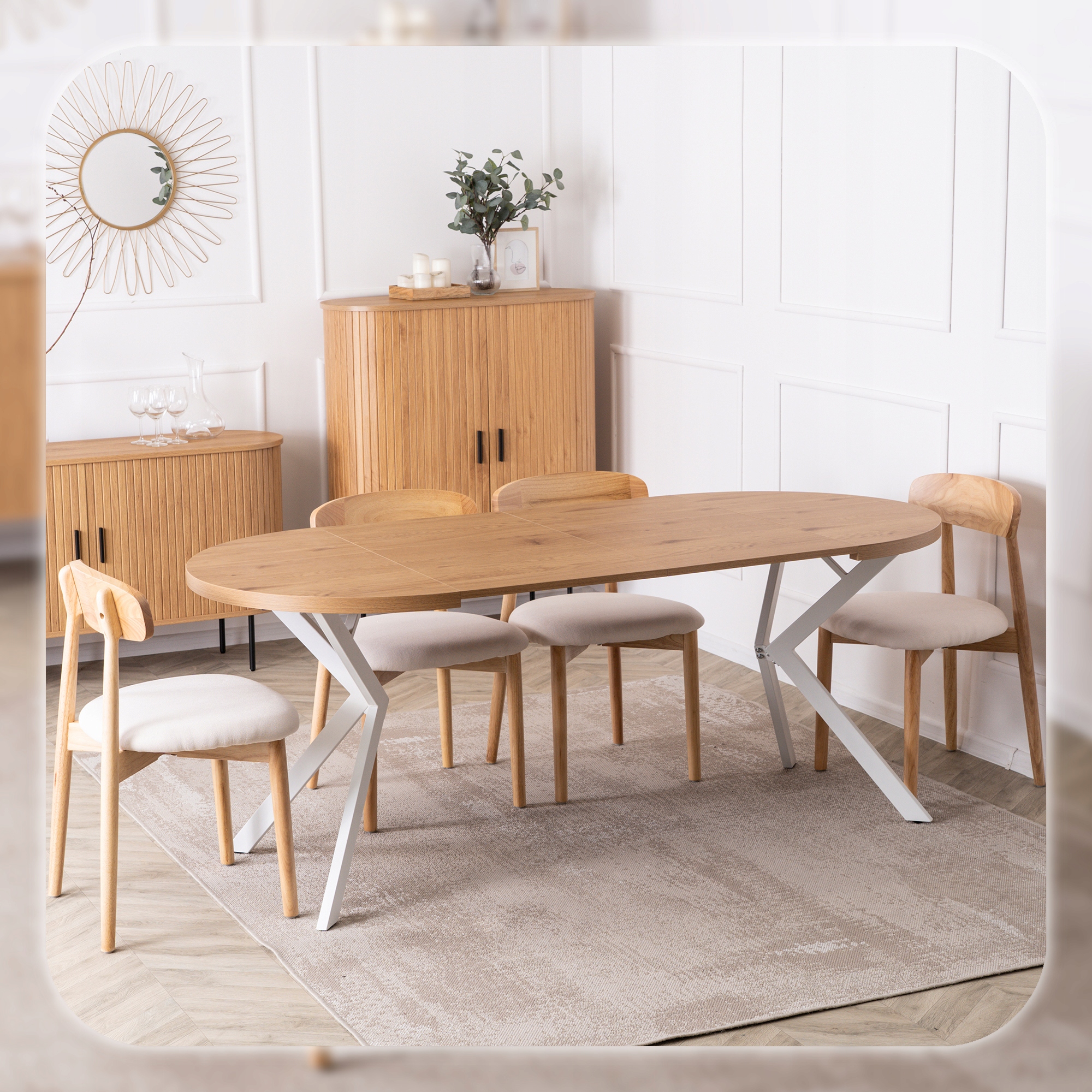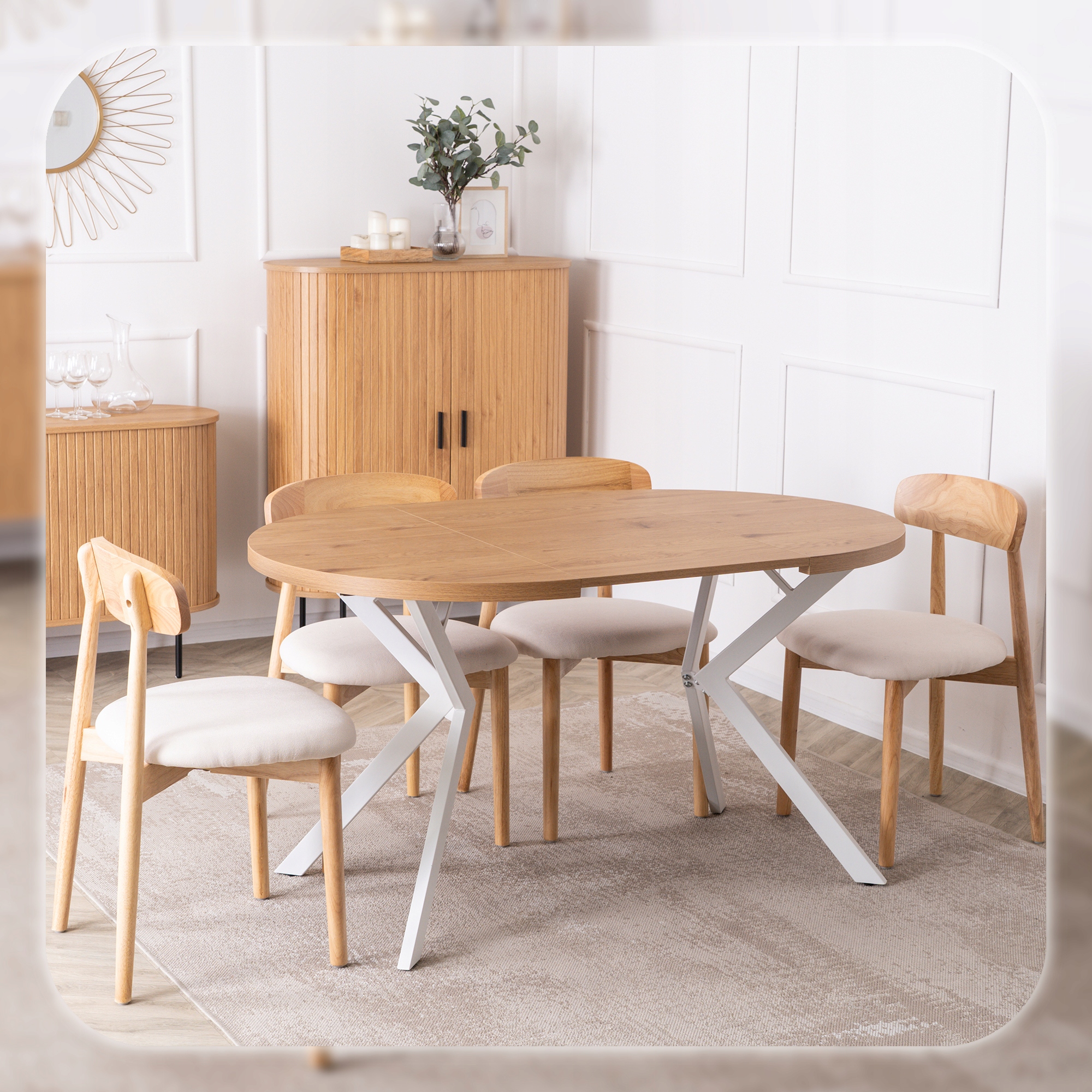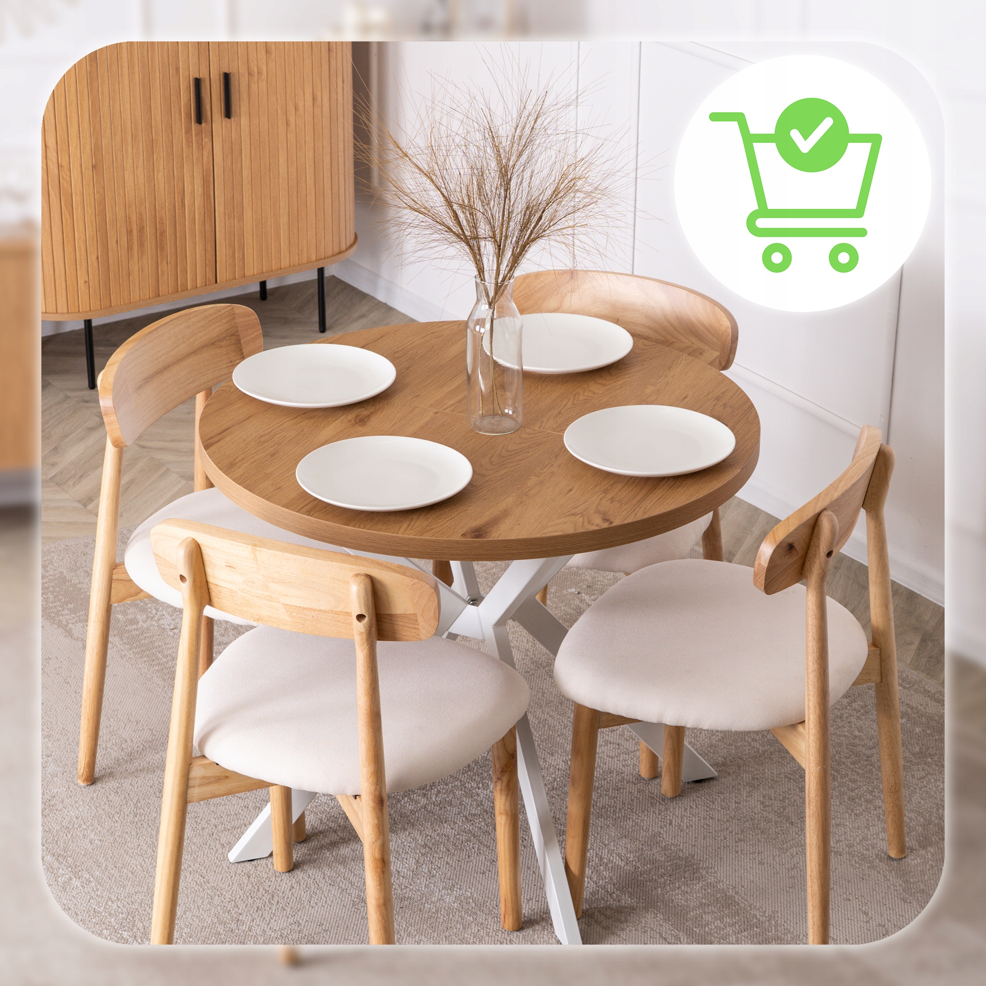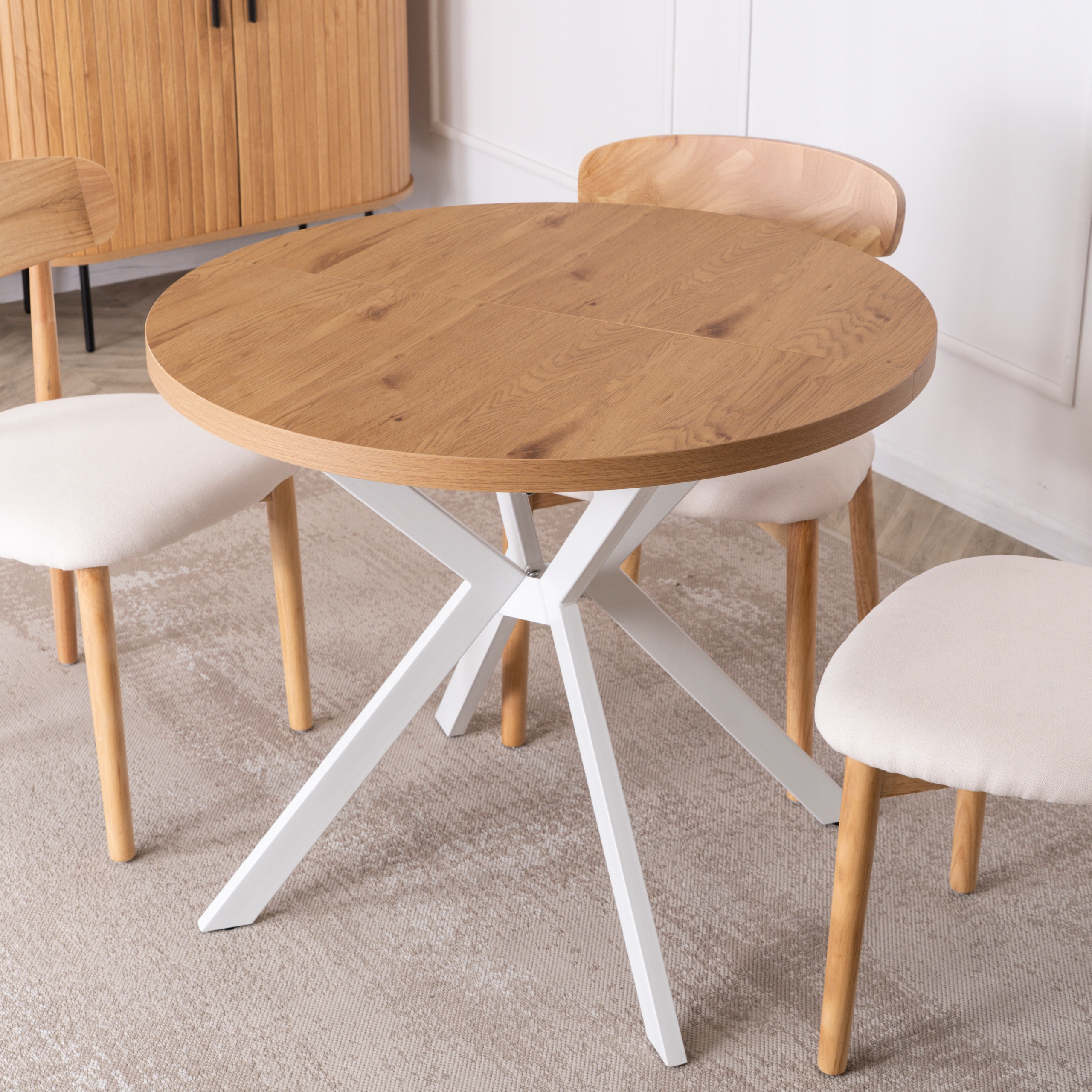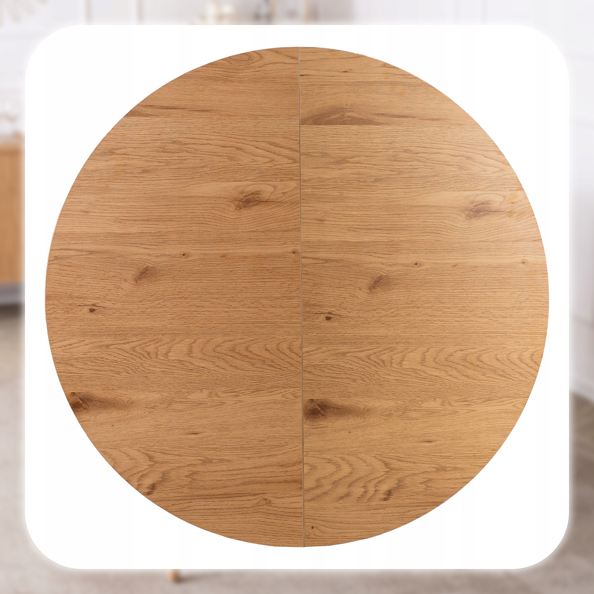 Jego rozsuwany, okrągły blat w kolorze dębu prezentuje się niezwykle elegancko i nowocześnie.
