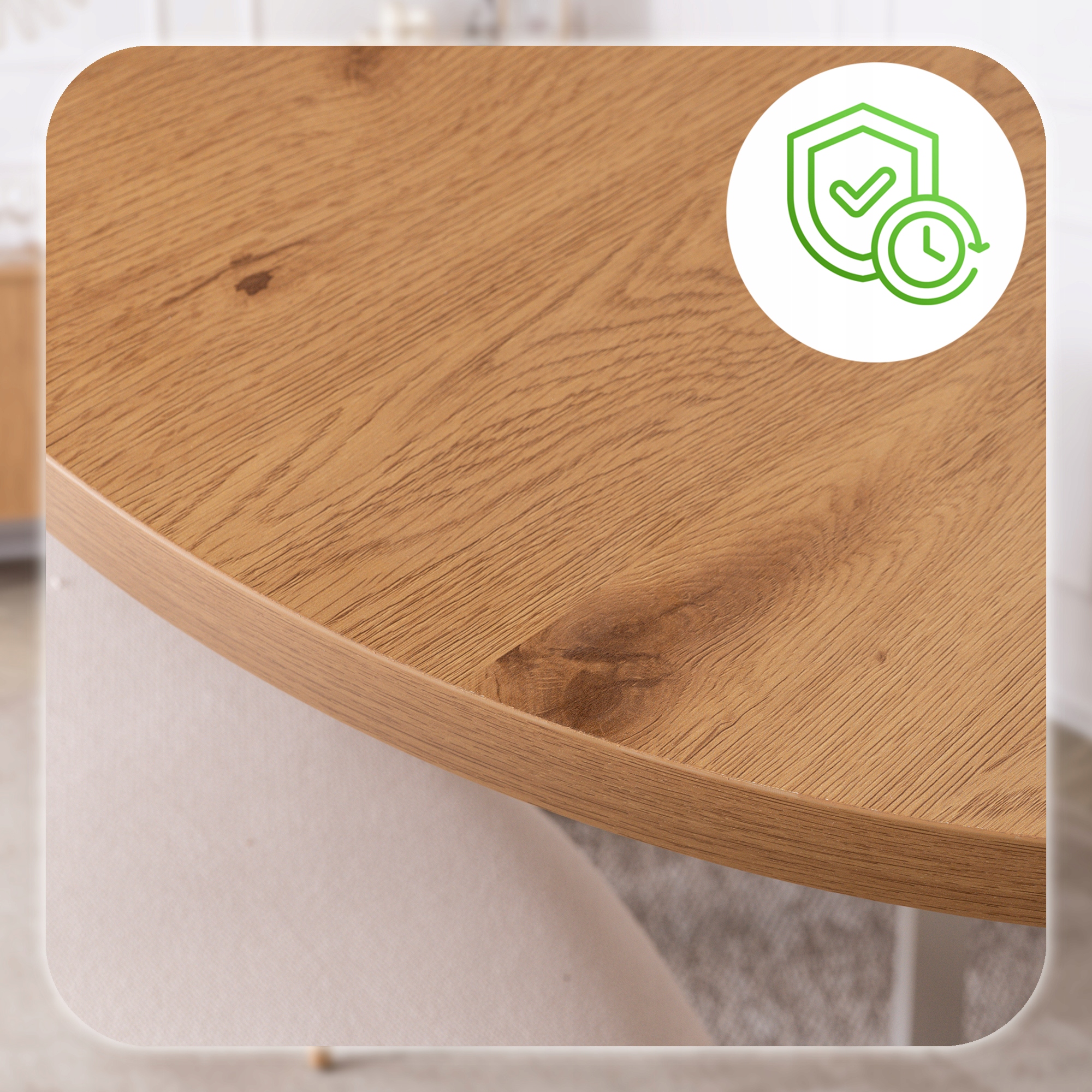 Blat stołu DORIAN został wykonany z wysokiej jakości płyty MDF w kolorze dębu, wykończonej trwałą i elegancką powłoką.