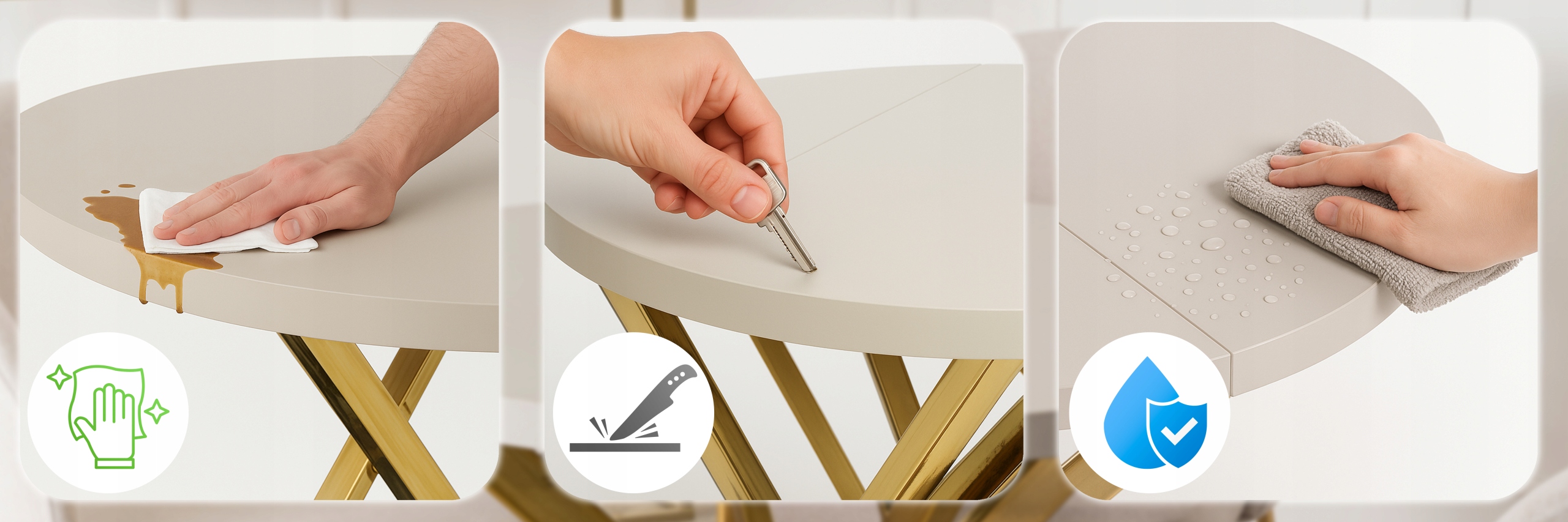 Blat wykonano z wytrzymałej płyty MDF w kolorze kaszmiru. Powierzchnia jest odporna na zarysowania i zabrudzenia, a jednocześnie bardzo łatwa w pielęgnacji – wystarczy przetrzeć wilgotną ściereczką.