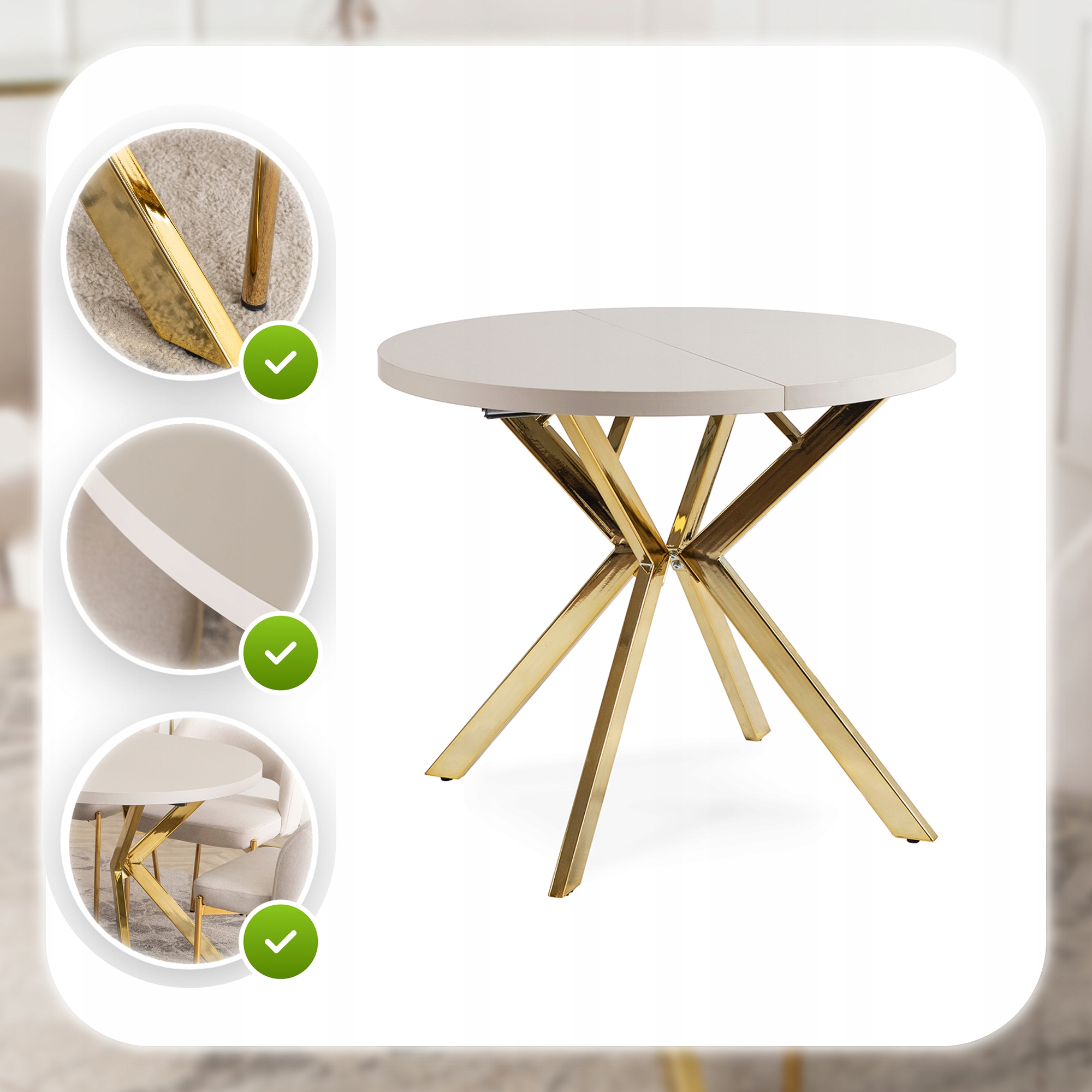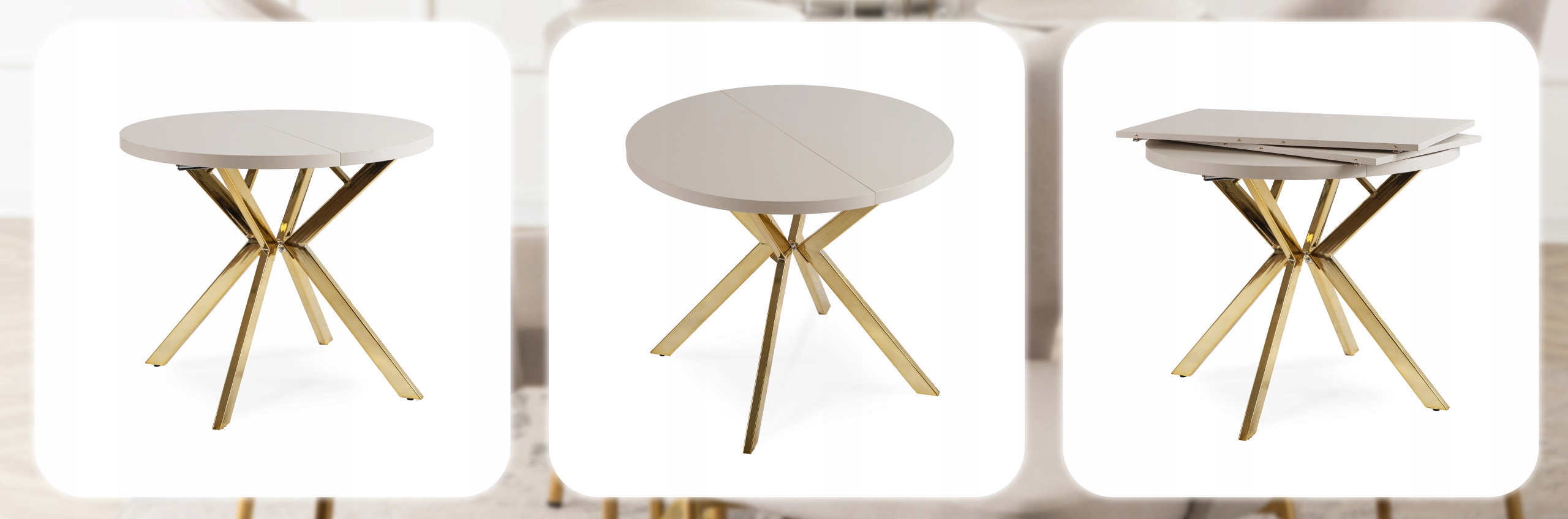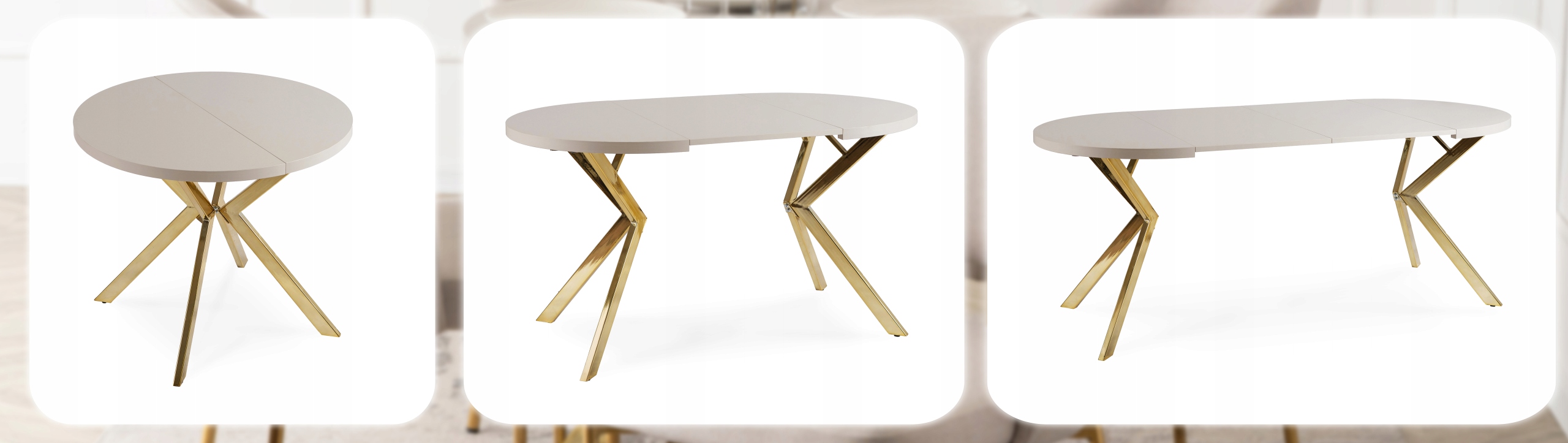Dzięki prostemu mechanizmowi rozkładania i solidnej konstrukcji ze złotymi nogami, stół jest nie tylko praktyczny, ale również stabilny i elegancki w każdej konfiguracji.