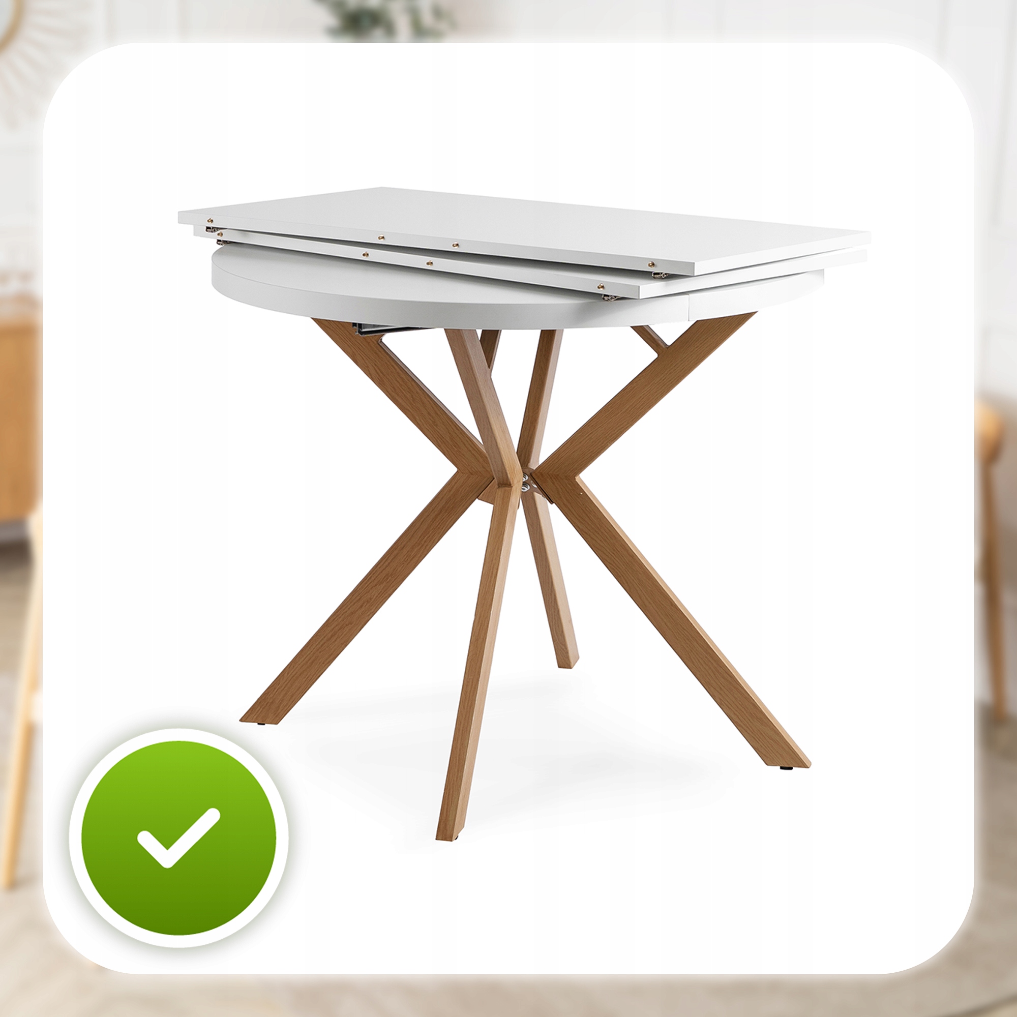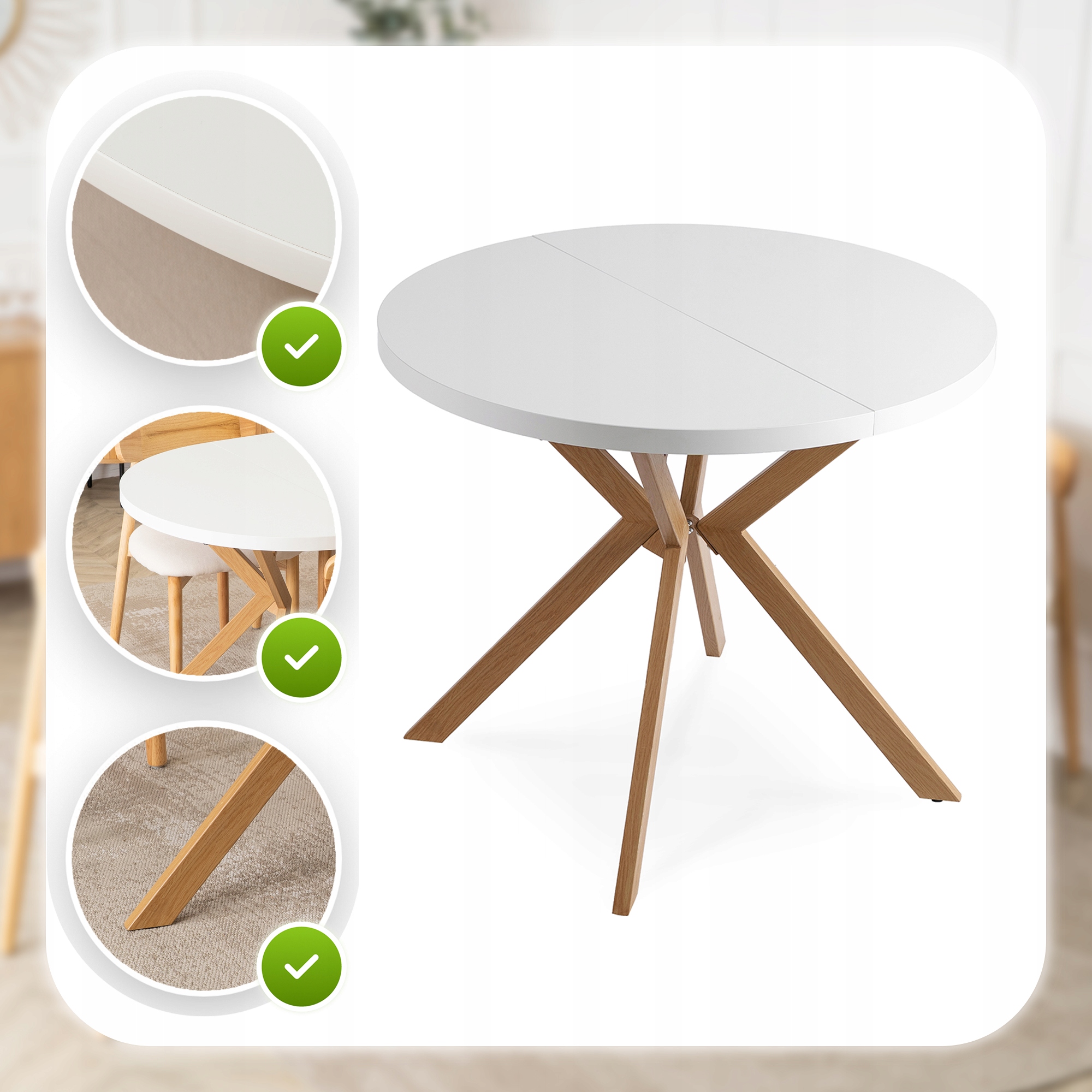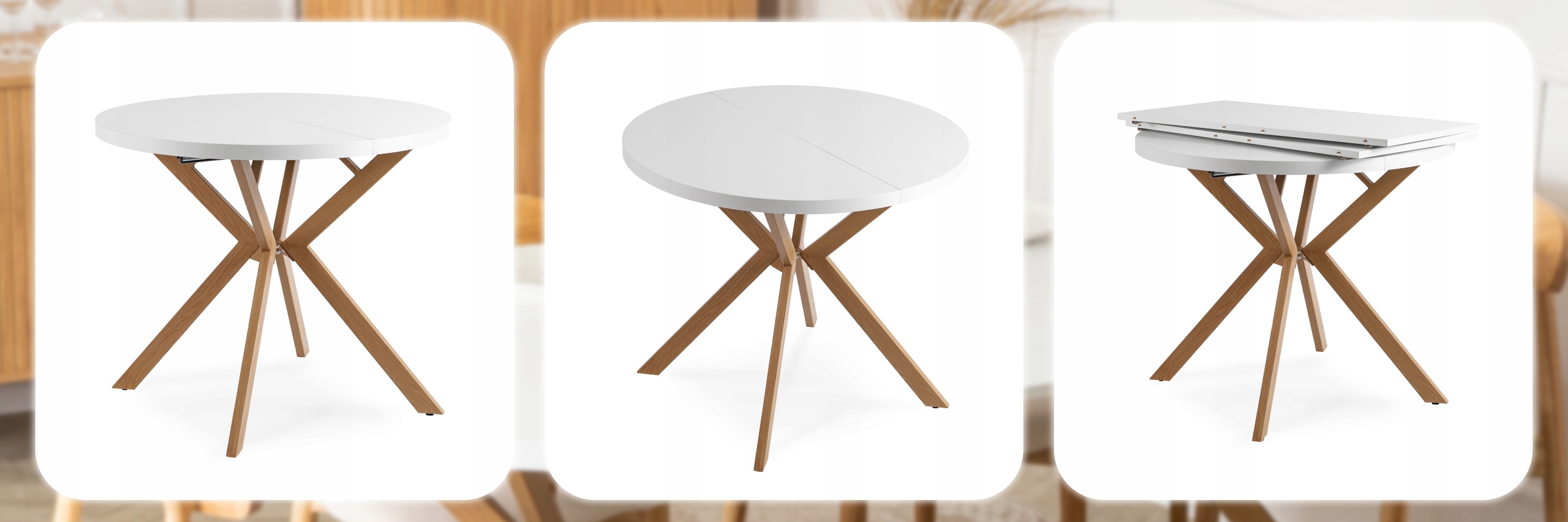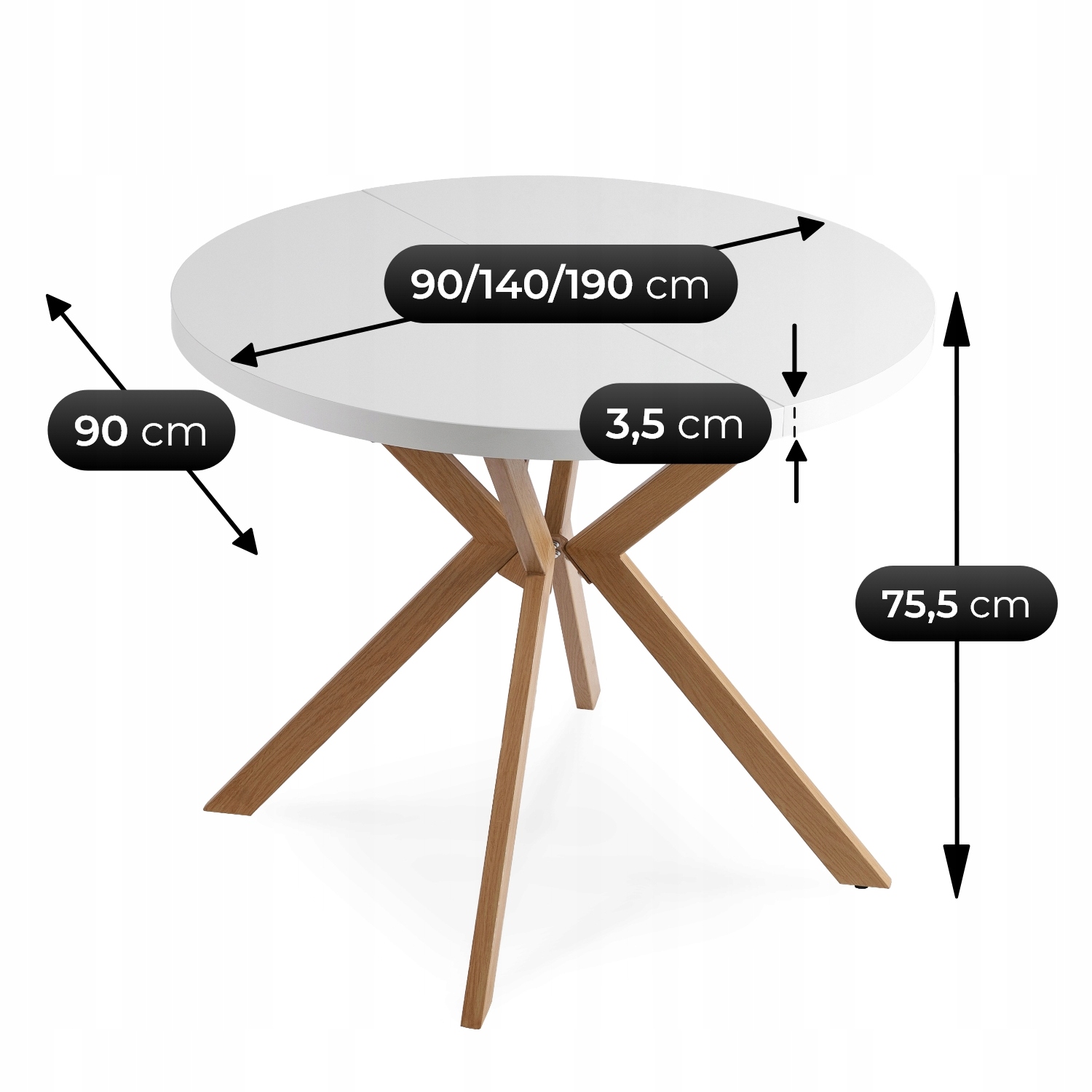 Jego rozsuwany, okrągły blat w kolorze białym prezentuje się niezwykle elegancko i nowocześnie.