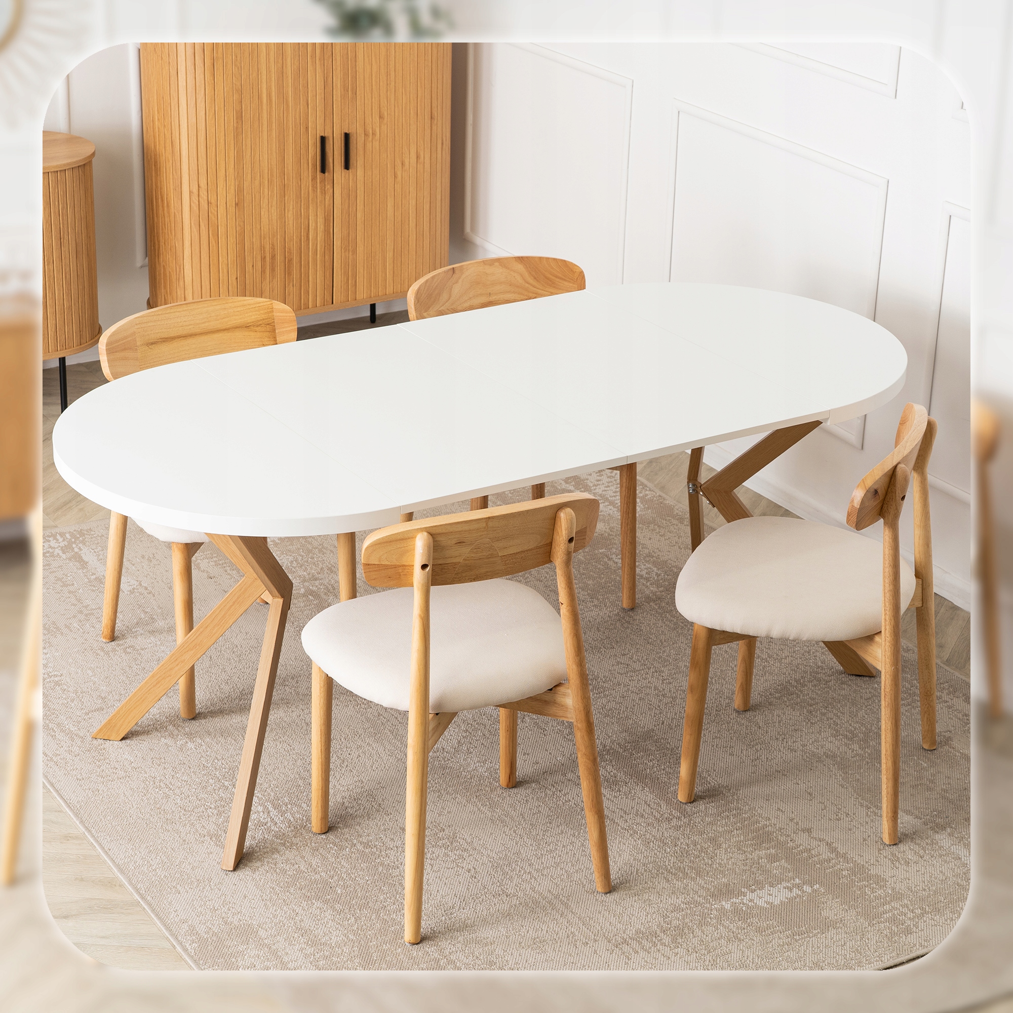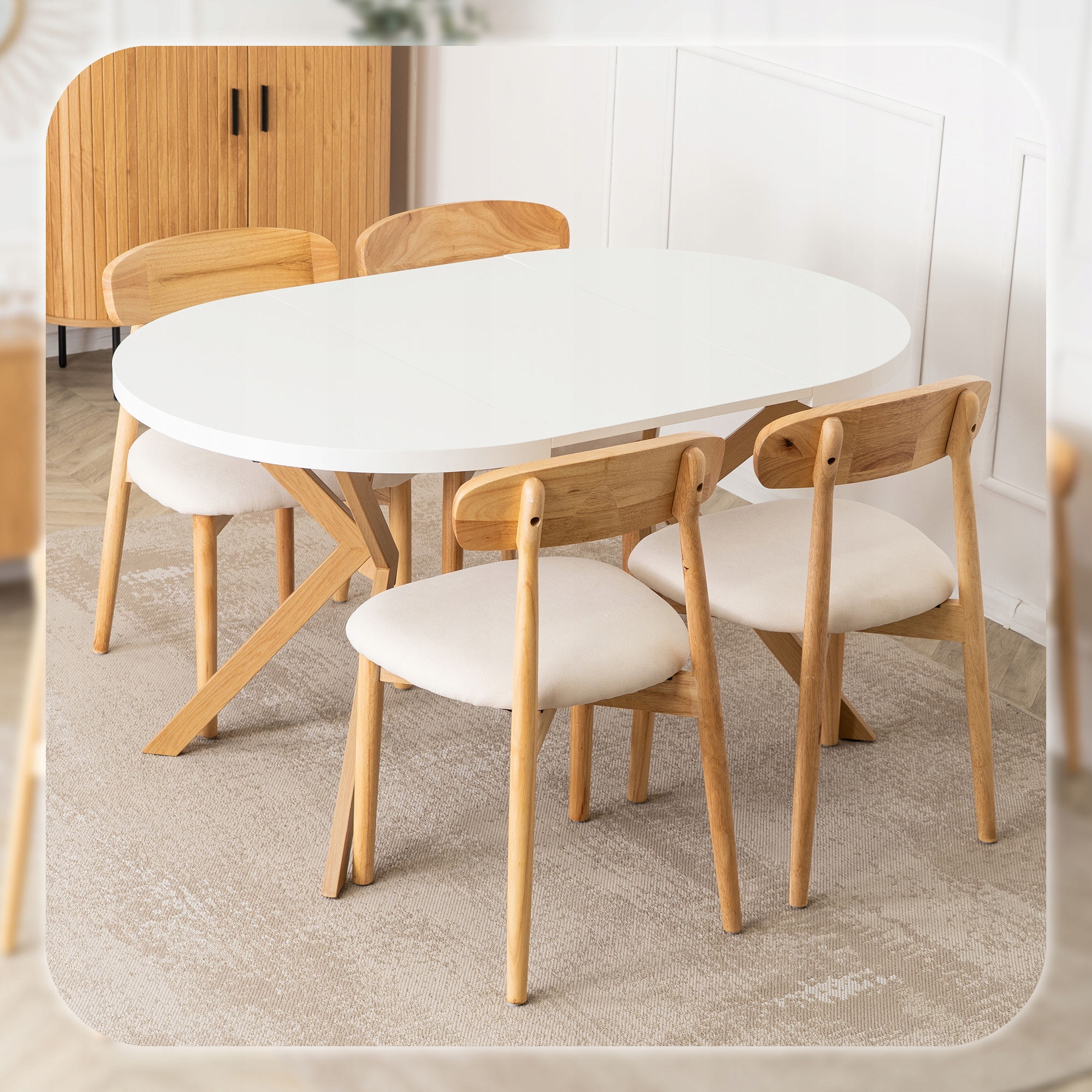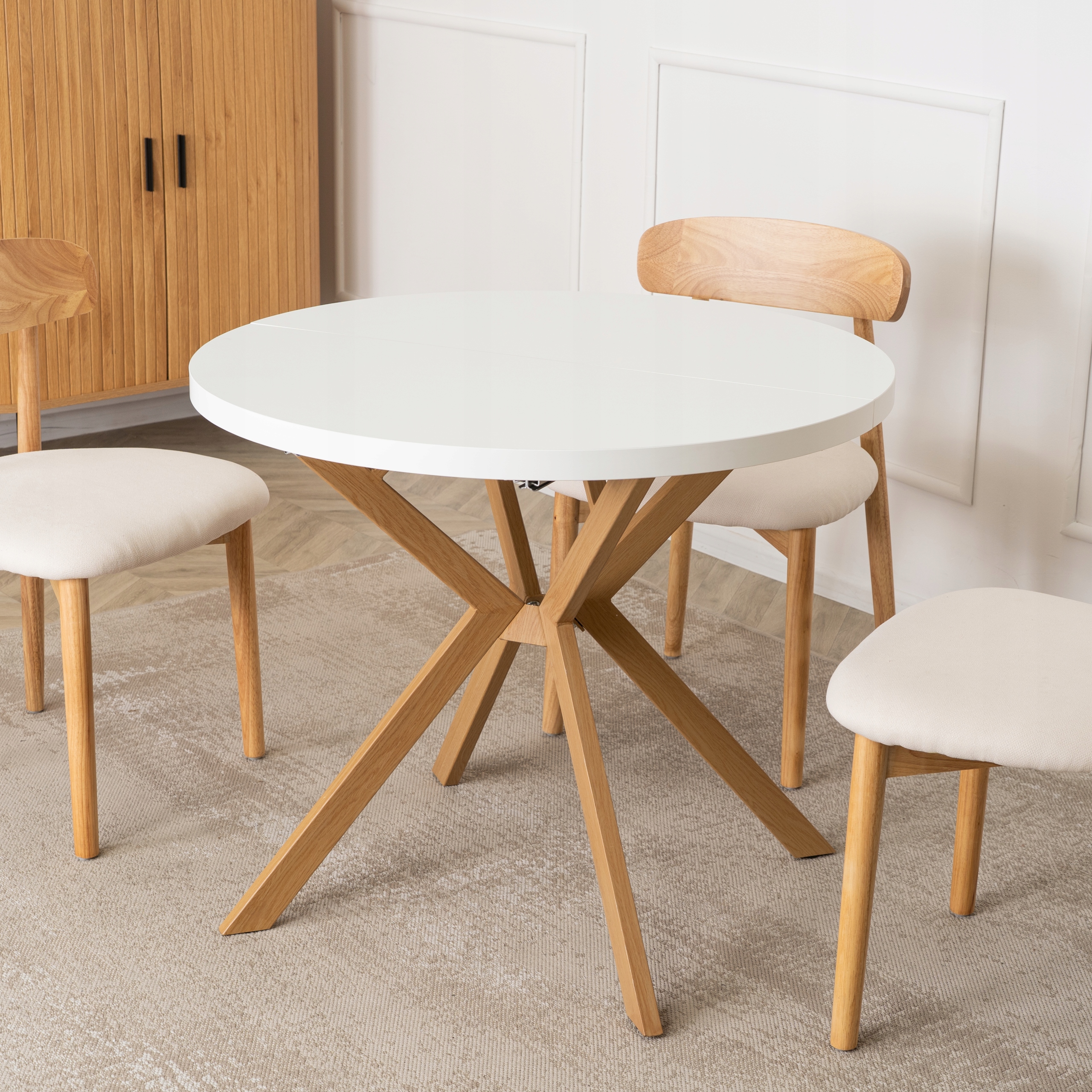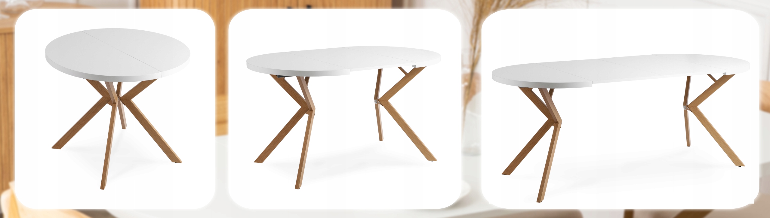 Jego rozsuwany, okrągły blat w kolorze białym prezentuje się niezwykle elegancko i nowocześnie.
