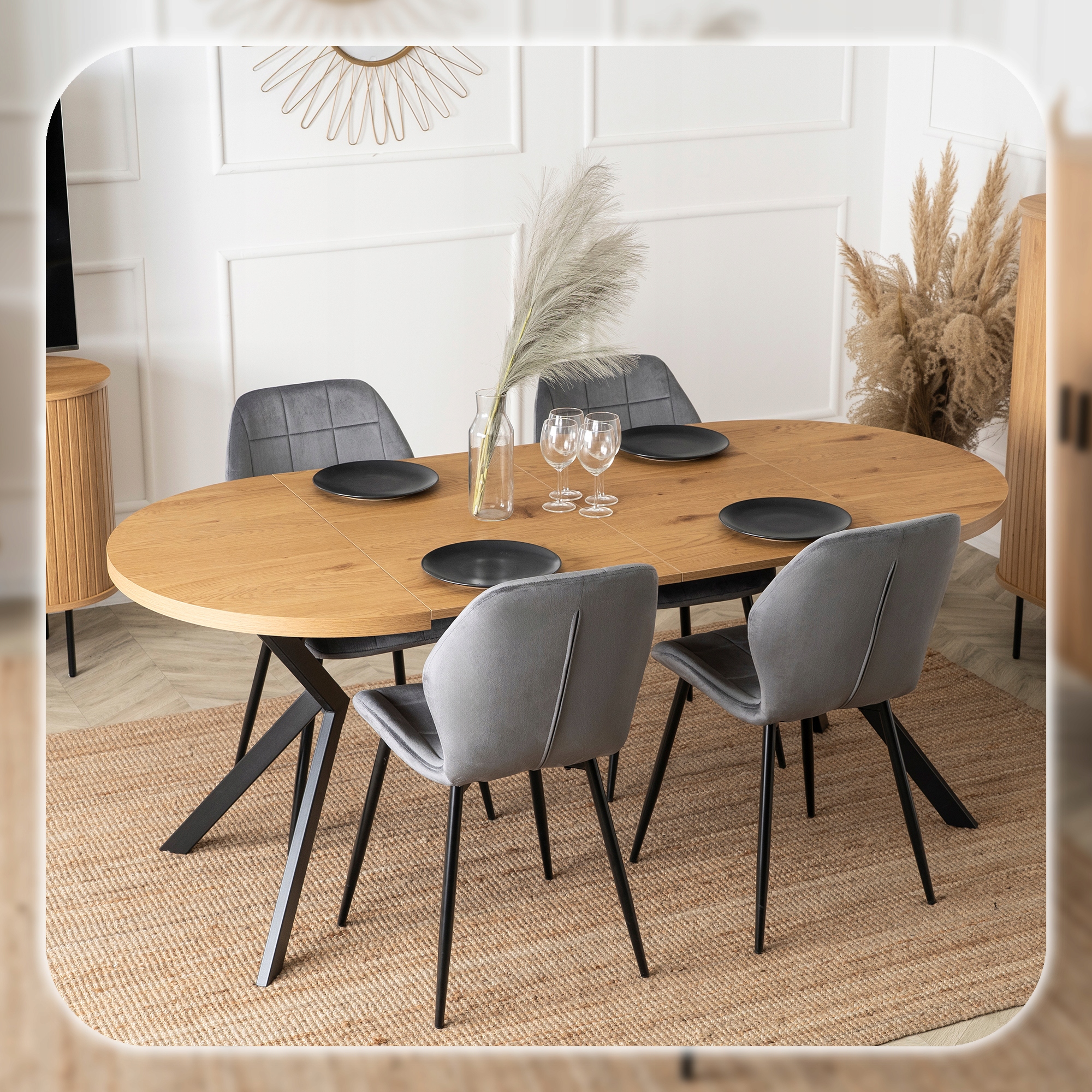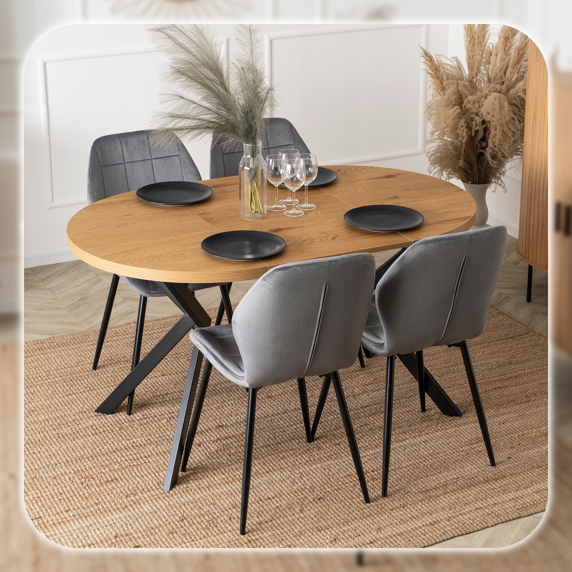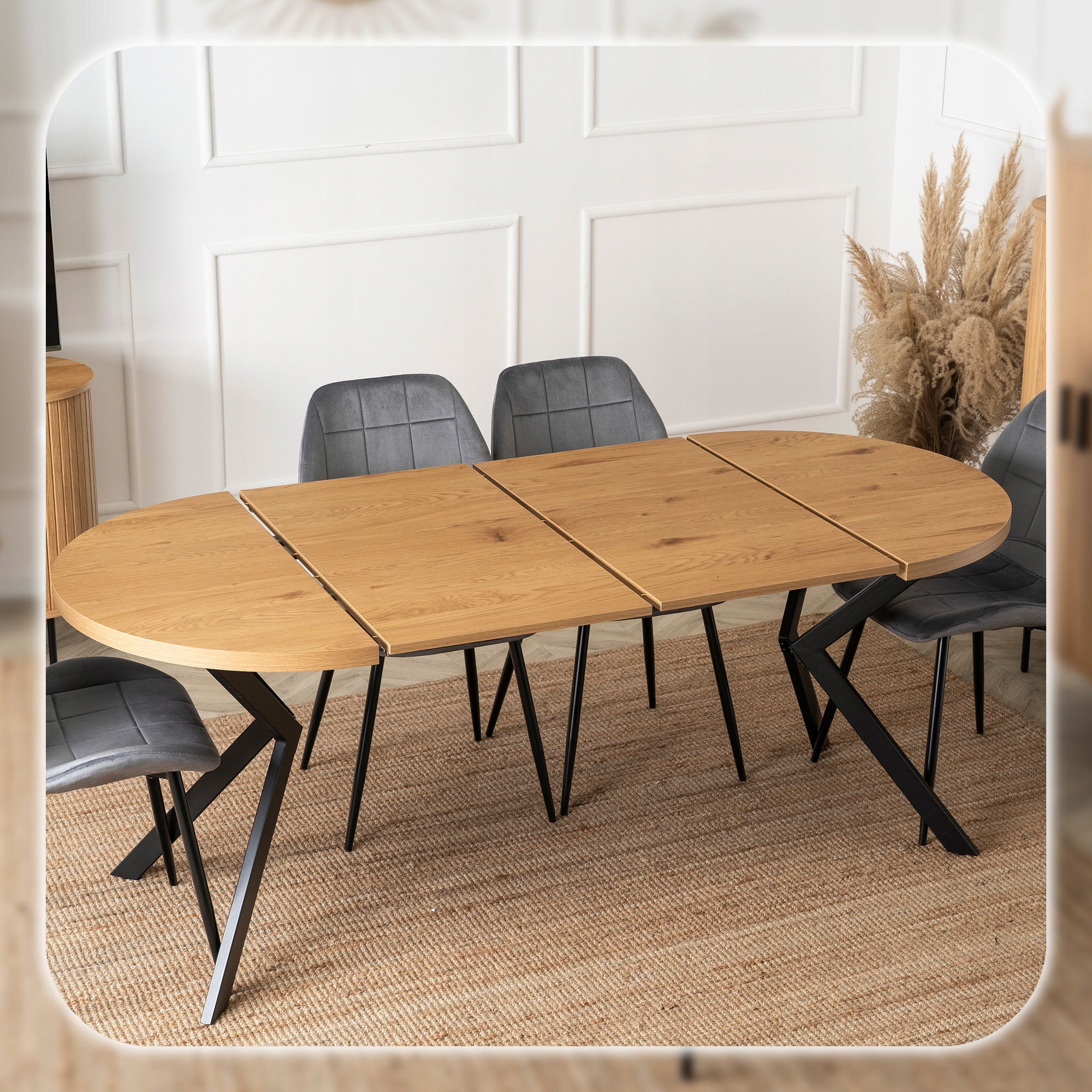 Jego rozsuwany, okrągły blat w kolorze kaszmiru prezentuje się niezwykle elegancko i nowocześnie.