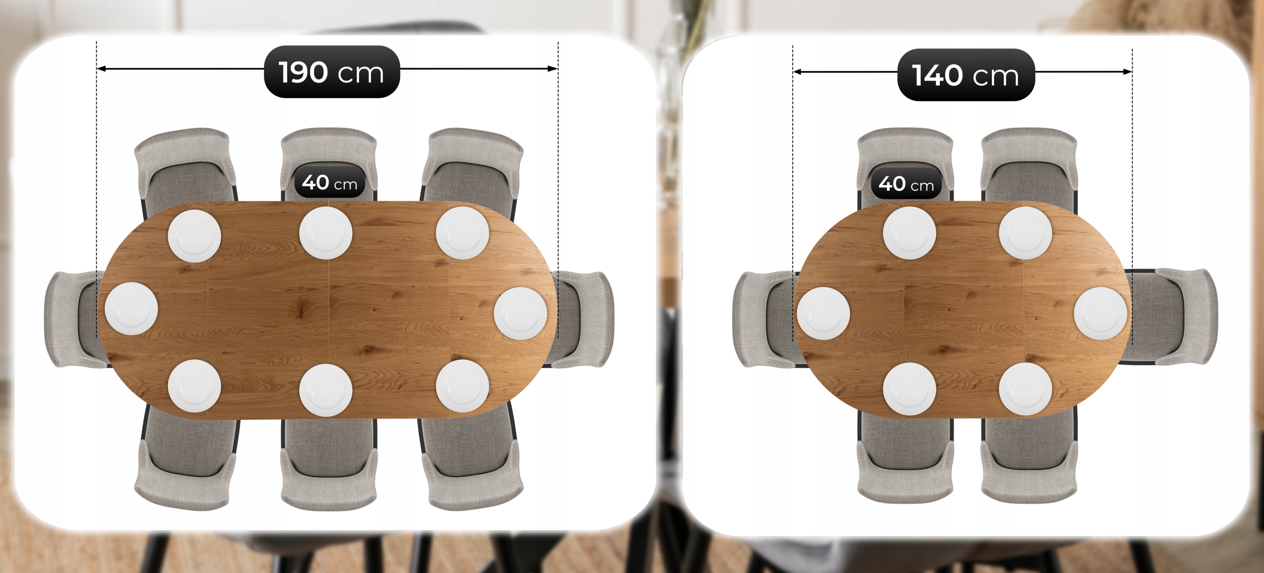- Stół z dwiema wkładkami (190 cm) – bez problemu ustawisz przy nim 8 krzeseł, co czyni go doskonałym rozwiązaniem na większe uroczystości i przyjęcia.