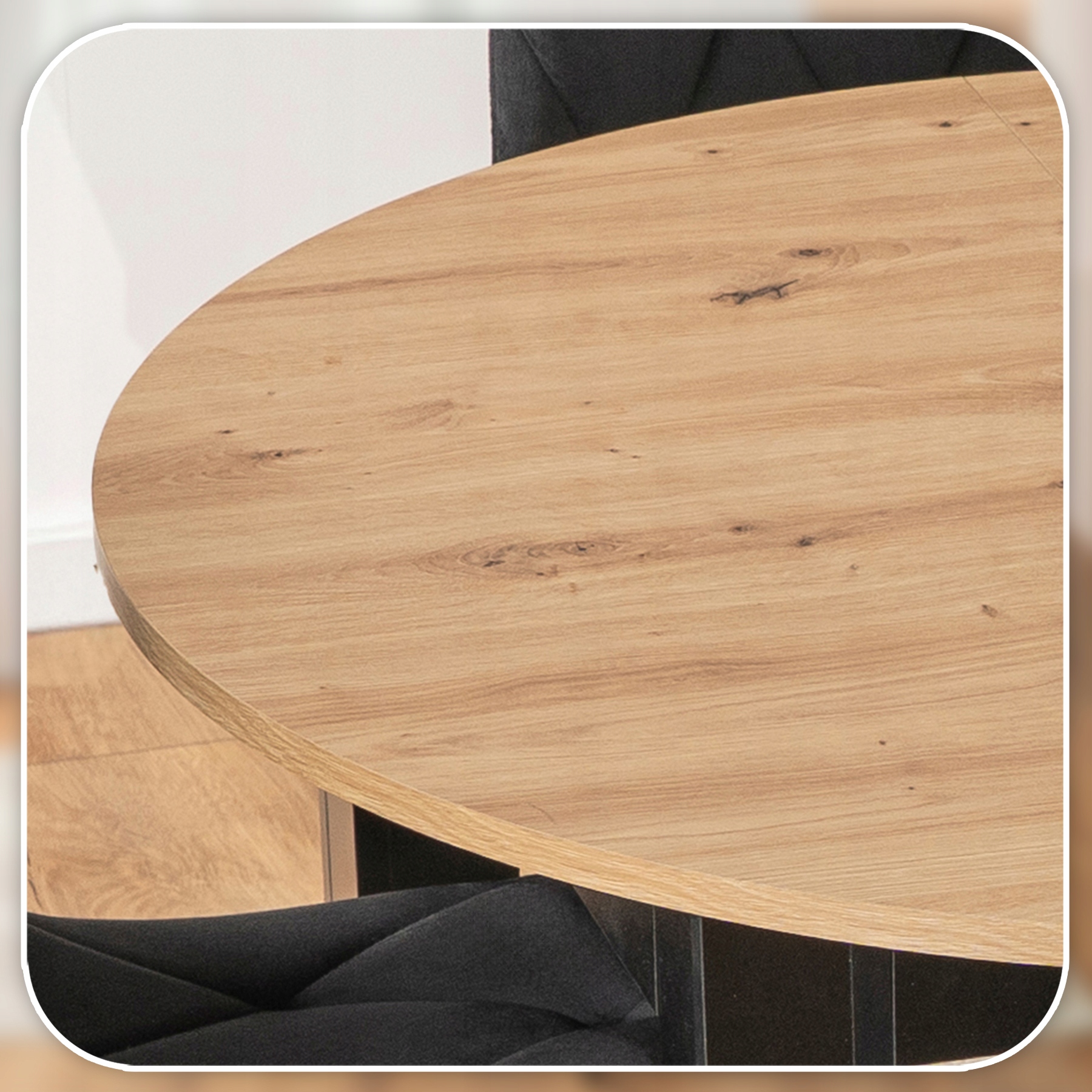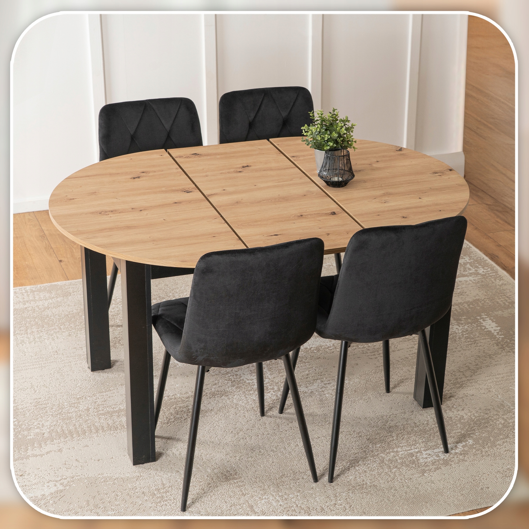 Zestaw składa się z rozkładanego stołu HARRY Dąb Craft/Czarny oraz czterech czarnych krzeseł ROBIN. Całość prezentuje się nowocześnie, elegancko i spójnie, idealnie pasując do wnętrz w stylu loftowym i minimalistycznym. Głęboka czerń oraz dębowe wykończenie nadają aranżacji wyrazisty, a zarazem ponadczasowy charakter.
