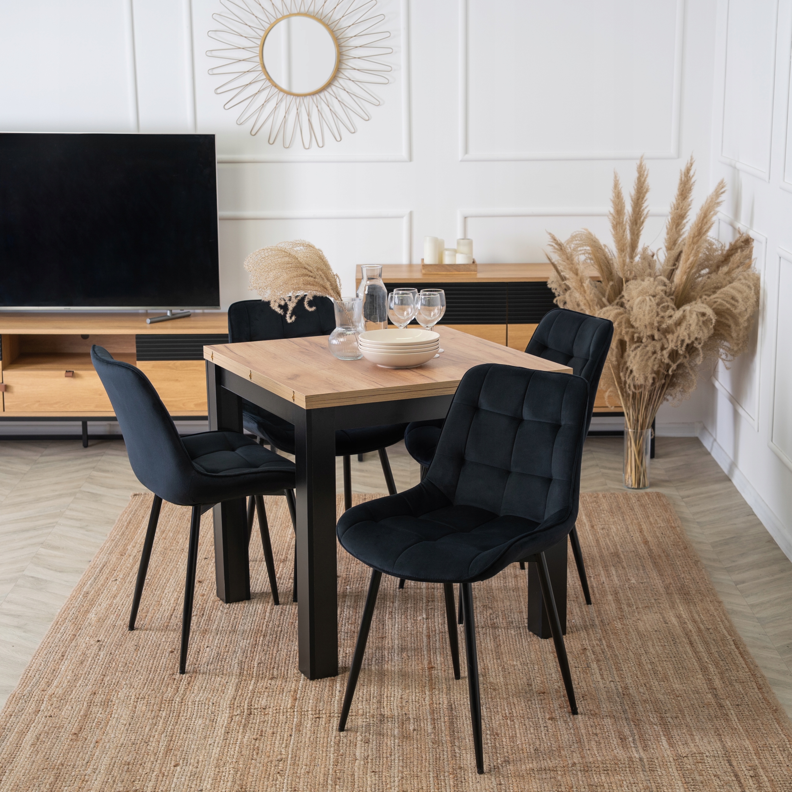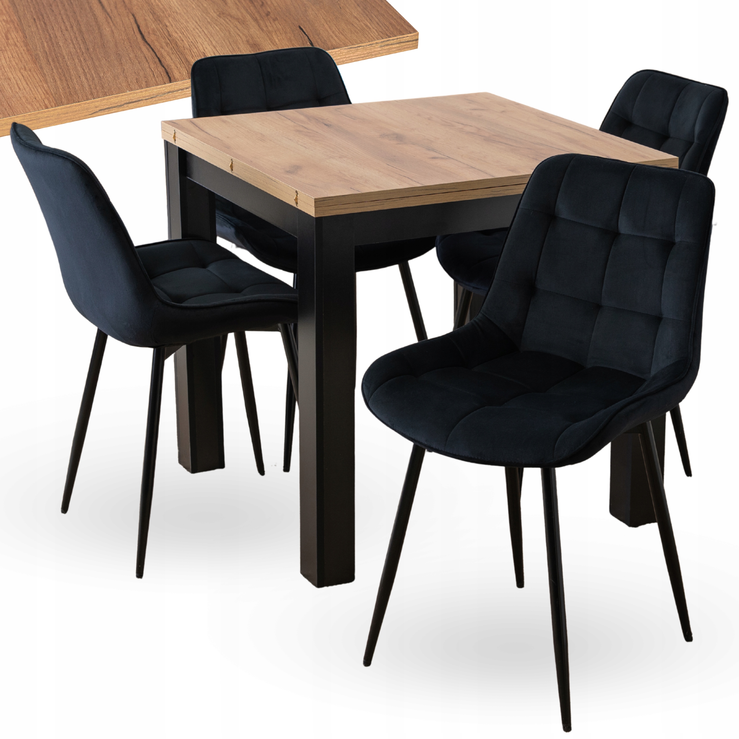 Zestaw składa się z kwadratowego rozkładanego stołu w kolorze dąb craft oraz czterech tapicerowanych krzeseł w czarnym kolorze. Całość prezentuje się lekko, nowocześnie i elegancko.