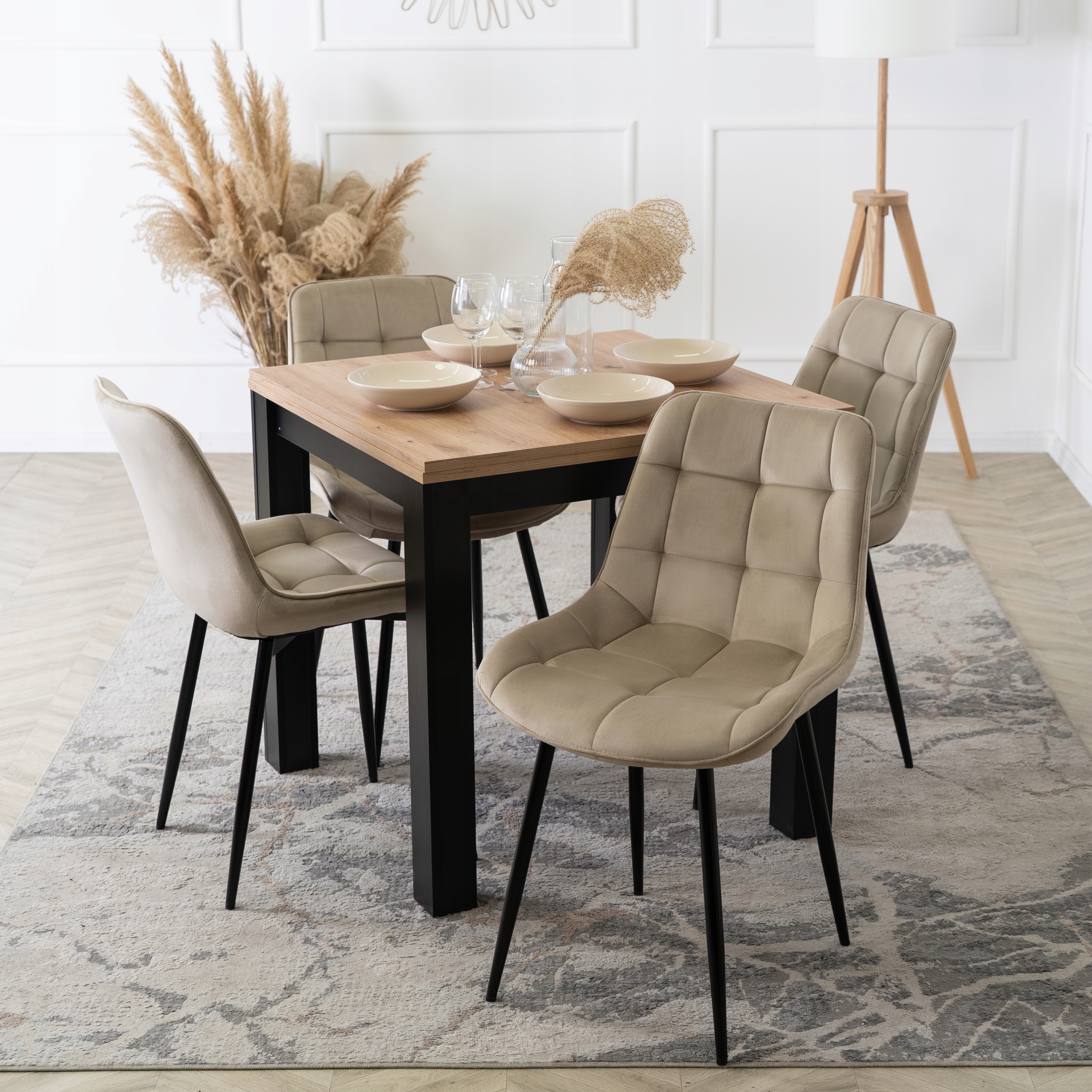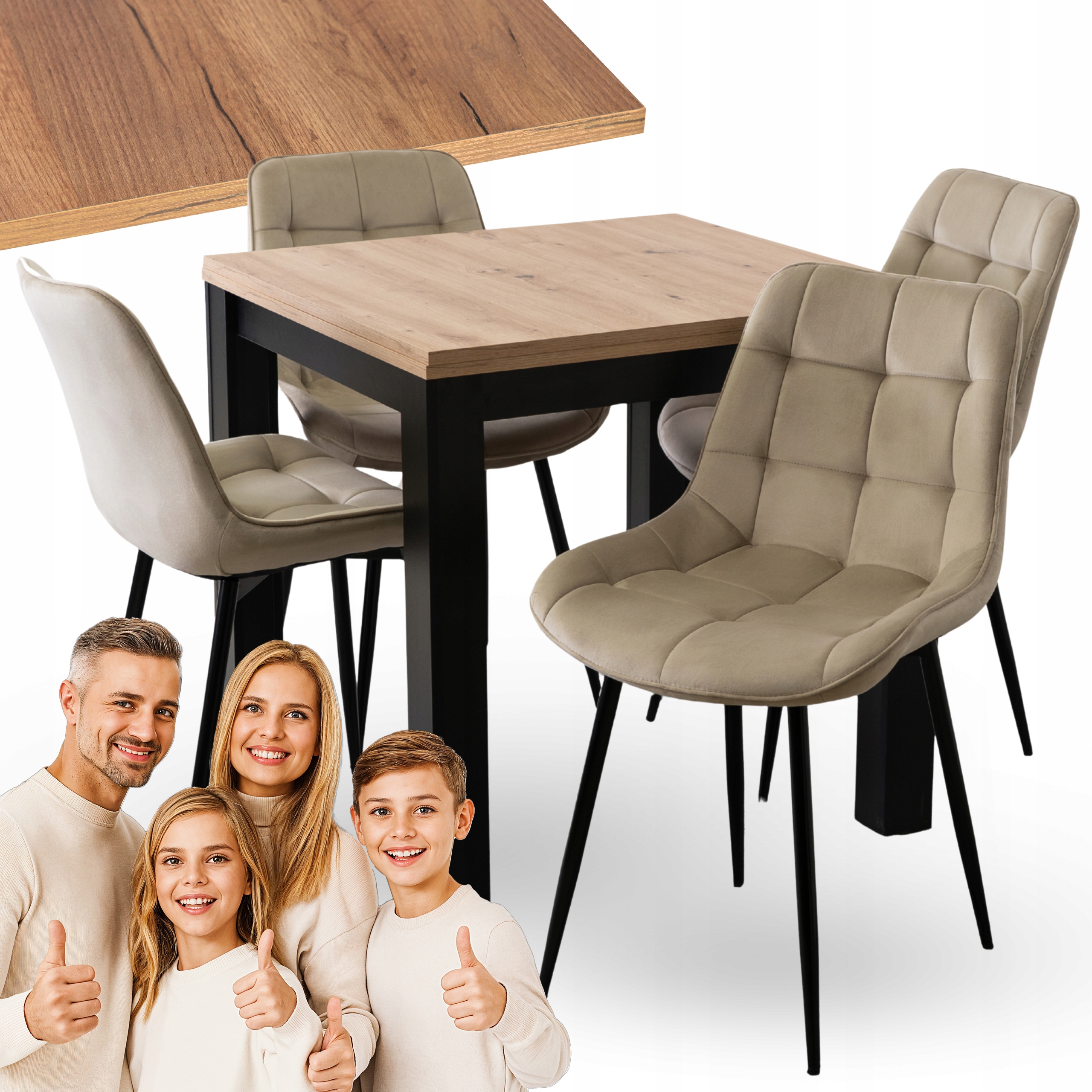Zestaw składa się z kwadratowego rozkładanego stołu w kolorze dąb craft oraz czterech tapicerowanych krzeseł w kolorze beżowym. Całość prezentuje się lekko, nowocześnie i elegancko.