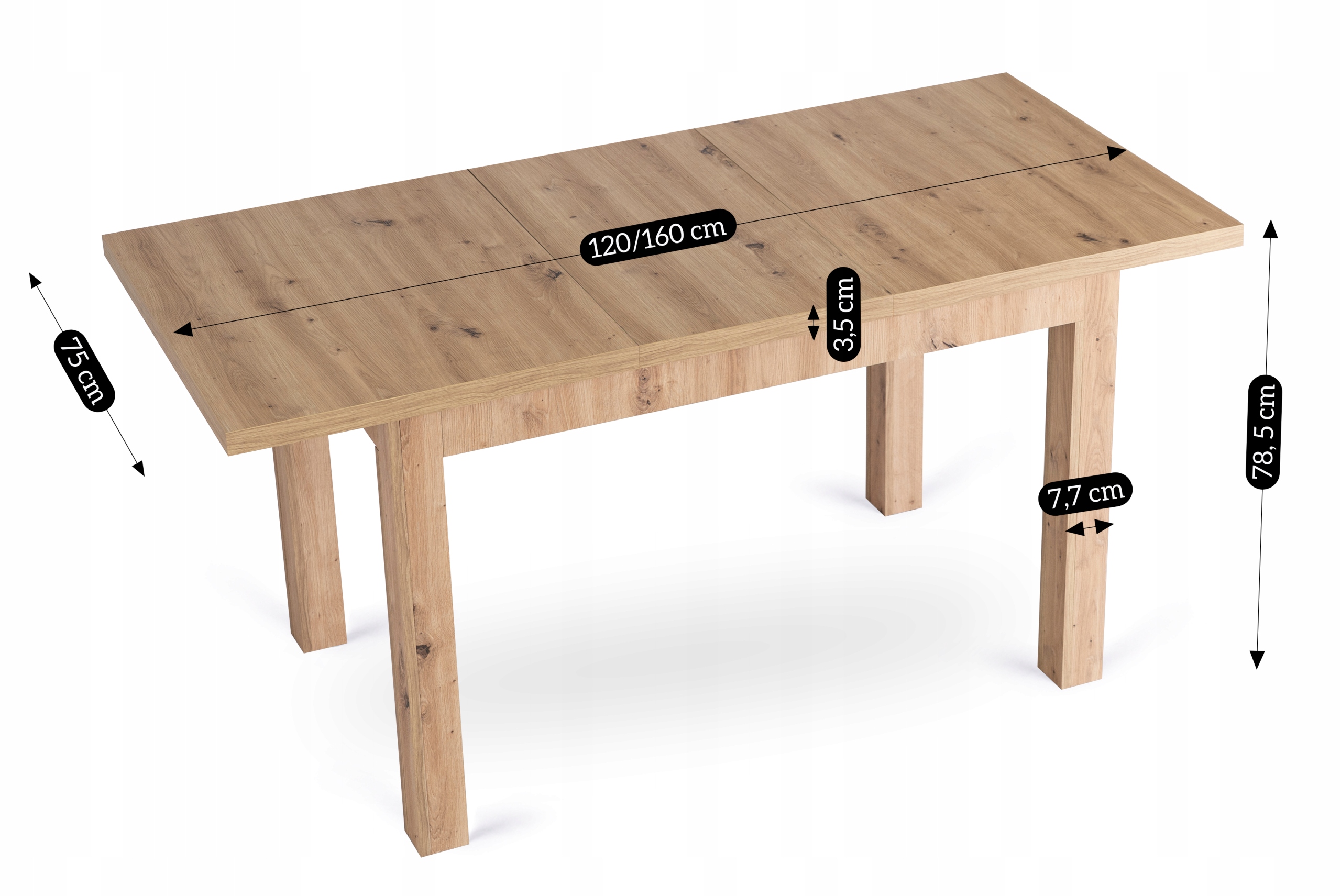 Stół o wymiarach 120/160 x 75 x 78 cm to piękny mebel idealny do kuchni, jadalni, salonu. Ma prostokątny blat w modnym kolorze dębu artisan, który wygląda bardzo elegancko. Idealnie pasuje do wnętrz w stylu skandynawskim, nowoczesnym lub boho.