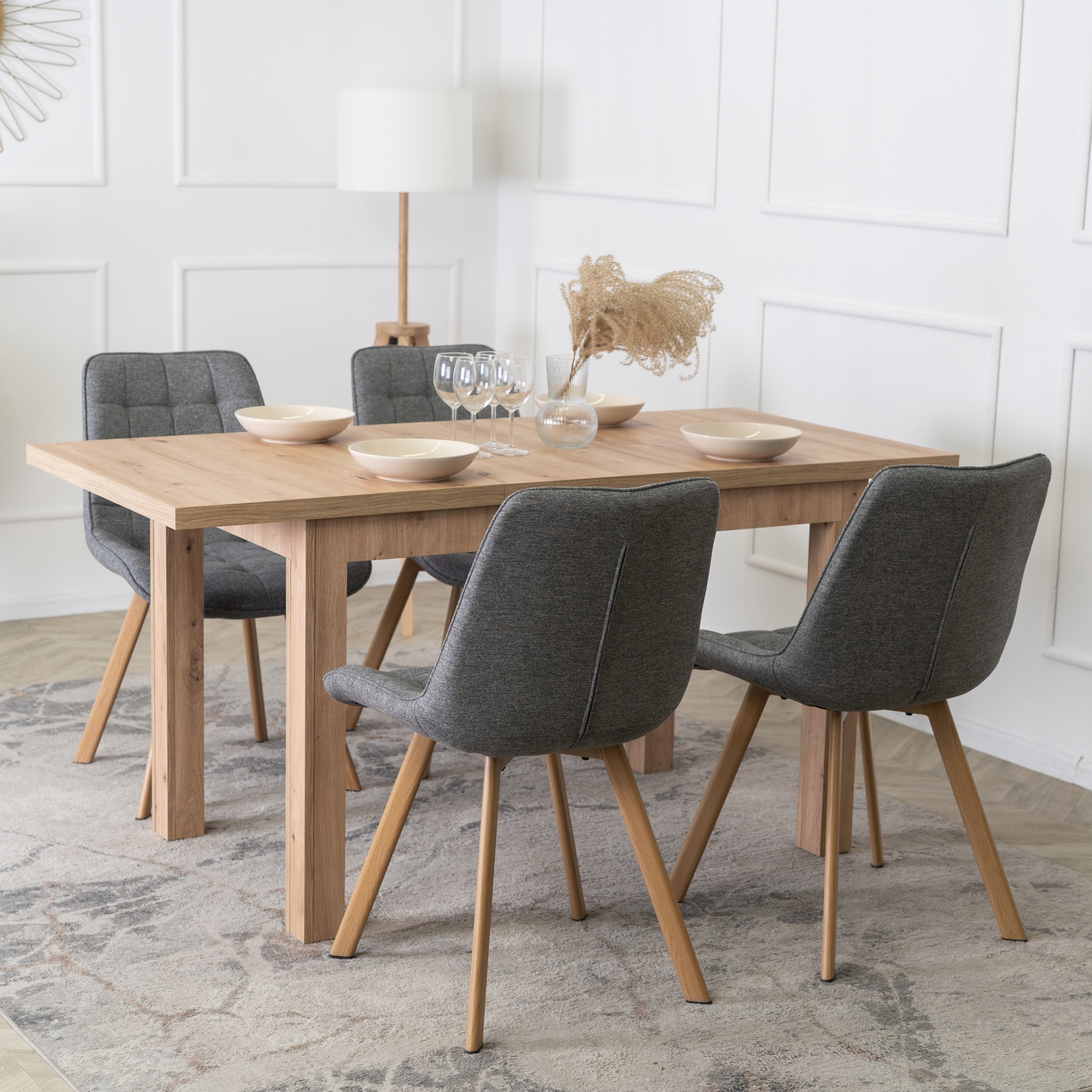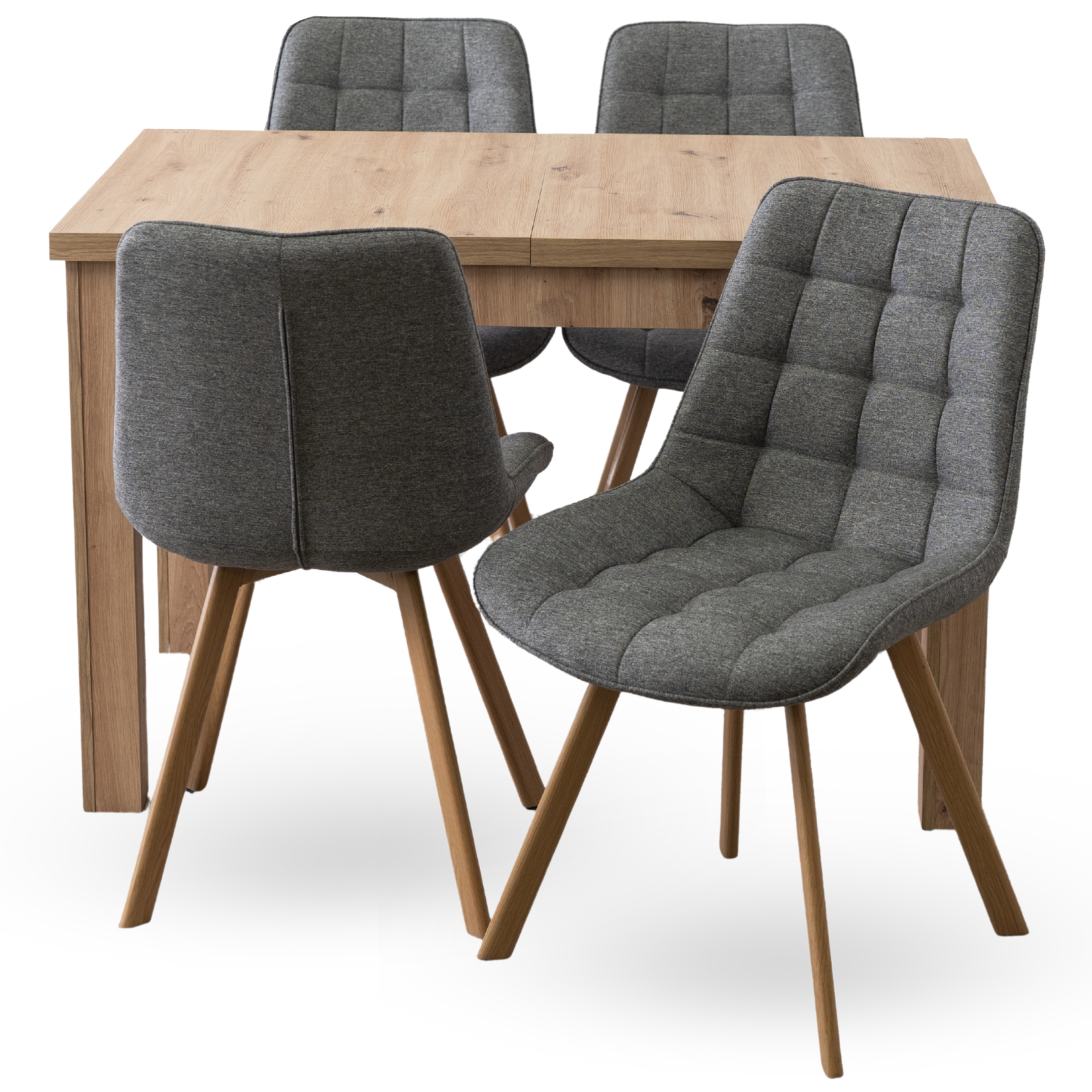 Zestaw składa się z prostokątnego stołu w kolorze dębu artisan oraz czterech krzeseł wykonanych z miękkiej, pikowanej tkaniny w szarym kolorze.