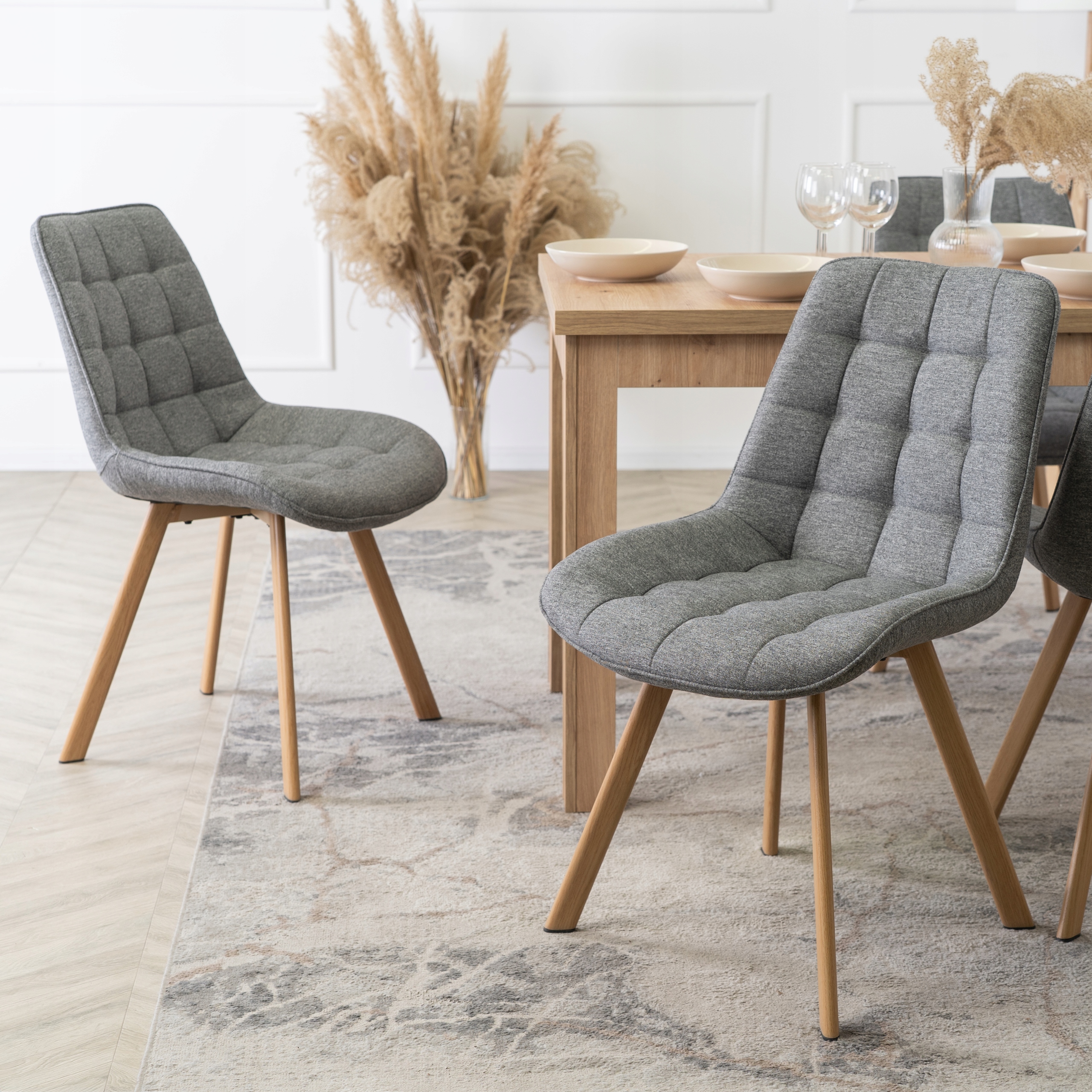 To krzesło to połączenie wygody, stylu i trwałości. Siedzisko oraz oparcie mają lekko wklęsły kształt, dzięki czemu dobrze dopasowują się do sylwetki podczas siedzenia. Krzesło jest pokryte pikowaną szarą tkaniną, która dodaje elegancji.