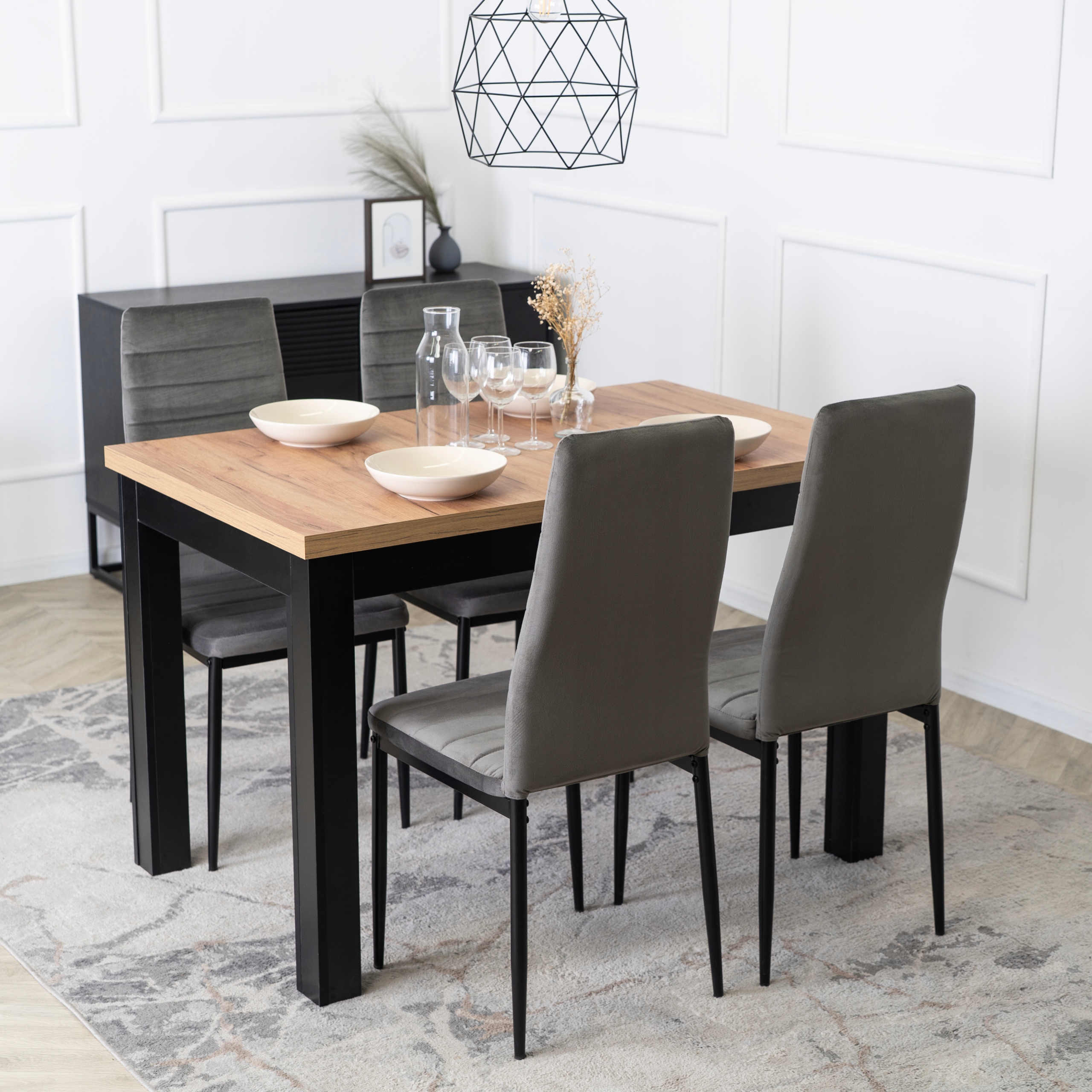 Zestaw dobrze sprawdzi się w kuchni, jadalni, salonie a nawet w biurze czy kawiarni. Loftowego charakteru nadają smukłe, metalowe nogi krzeseł w czarnym kolorze, nawiązując w tym do kolorystyki stołu i w efekcie tworząc spójną, harmonijną całość.