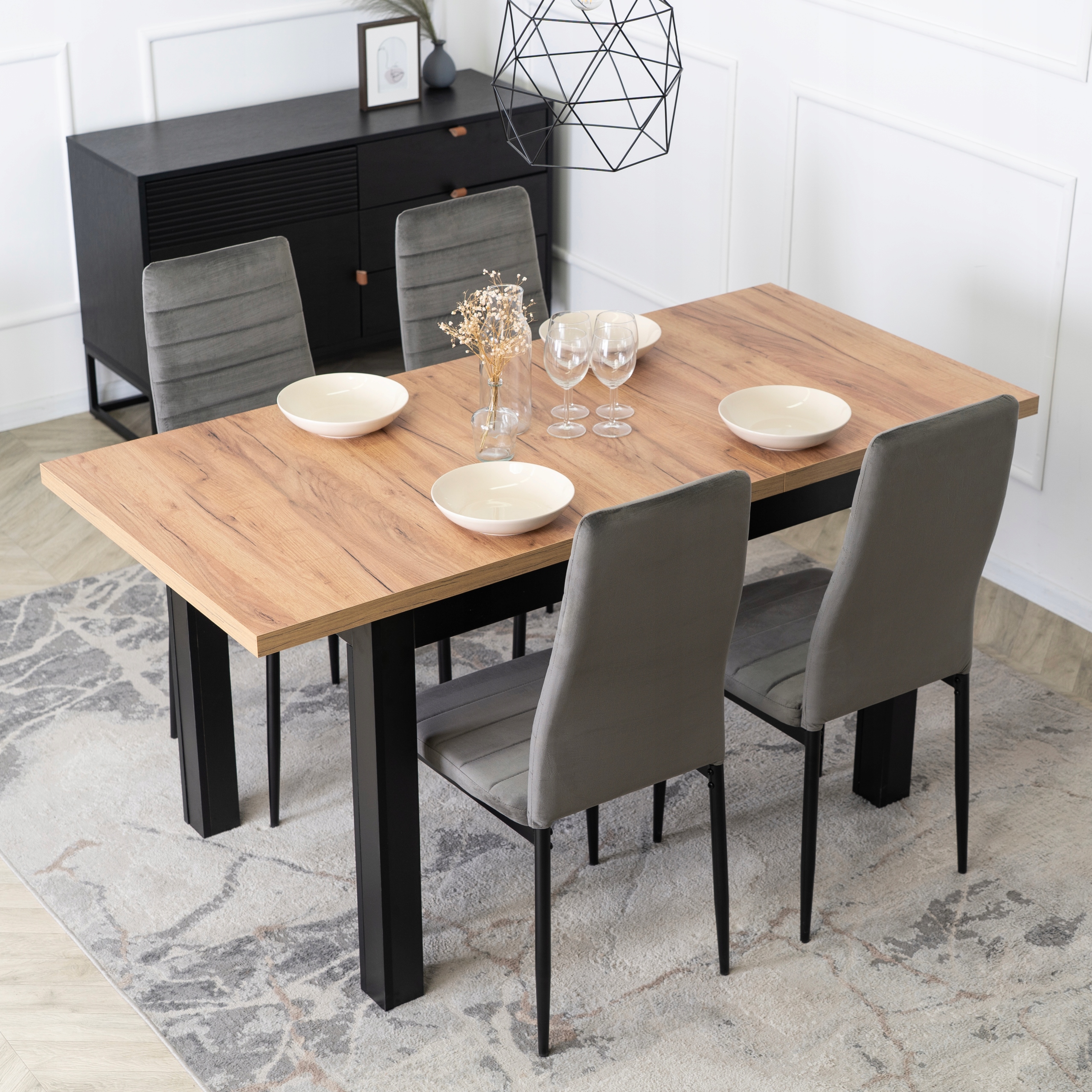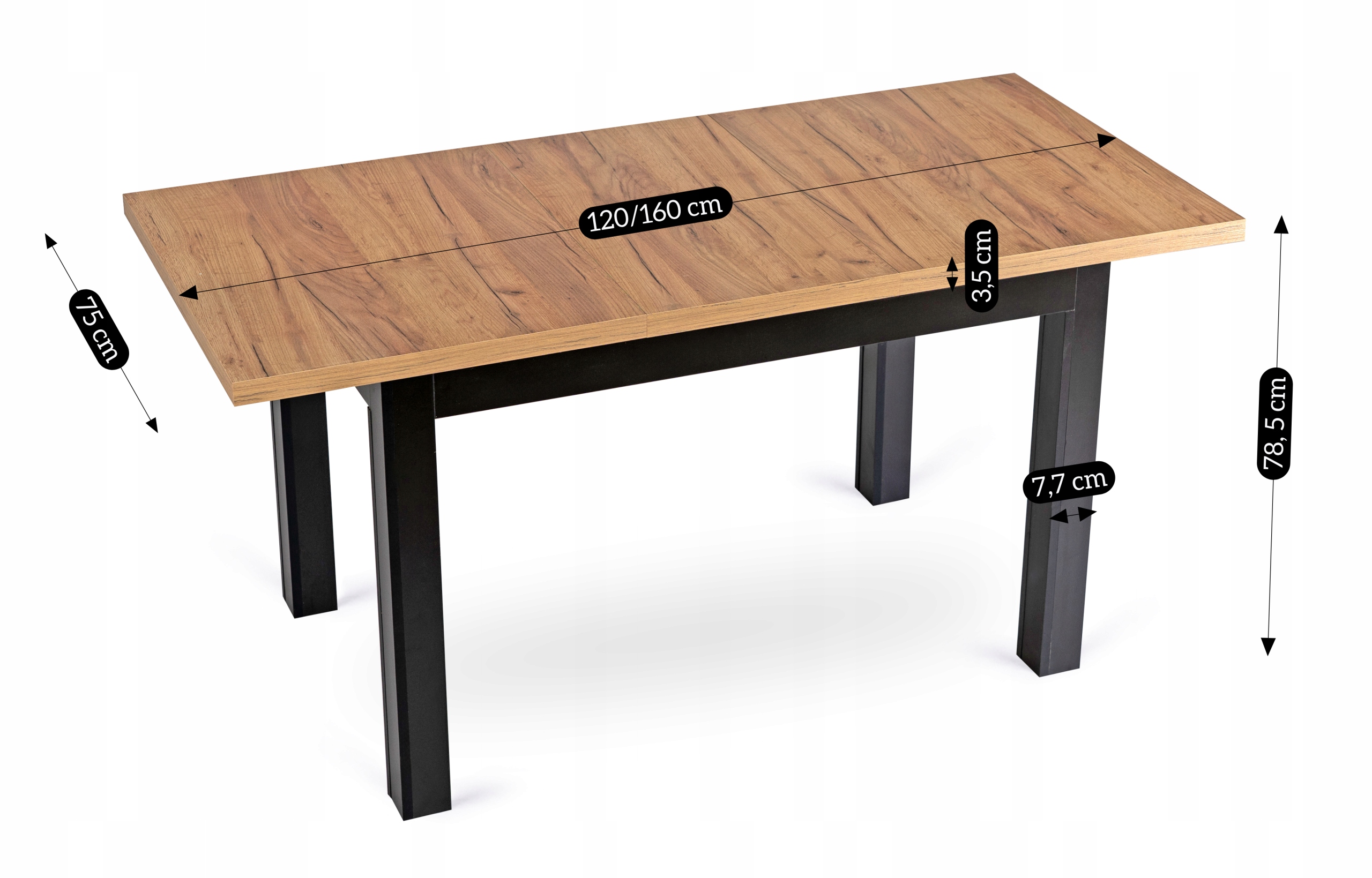 Stół o wymiarach 120/160 x 75 x 78 cm to piękny mebel idealny do kuchni, jadalni, salonu. Ma prostokątny blat w modnym kolorze dębu craft, który wygląda bardzo elegancko. Nogi wykonane są z drewnianej płyty malowanej na czarno. Idealnie pasuje do wnętrz w stylu skandynawskim, nowoczesnym lub boho.