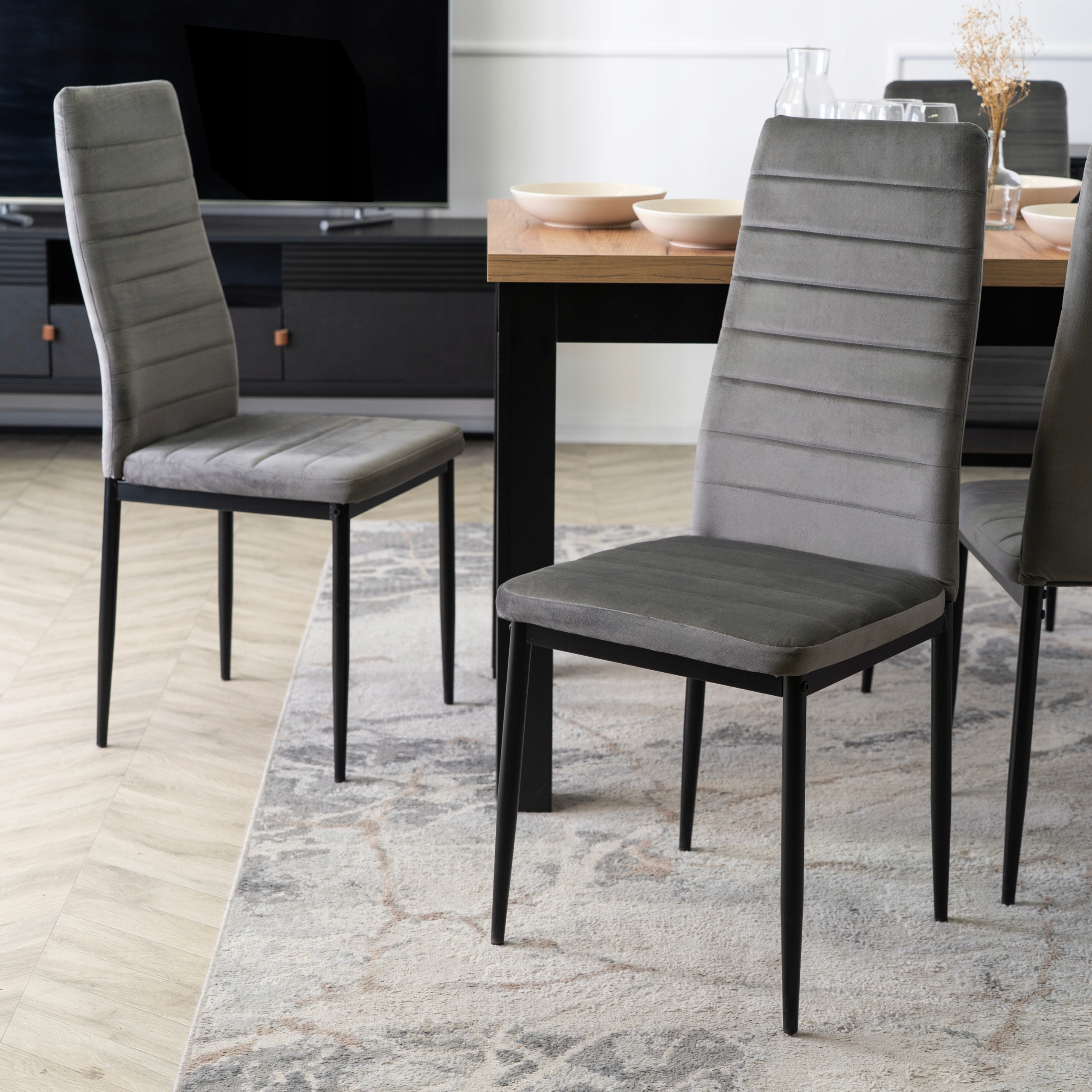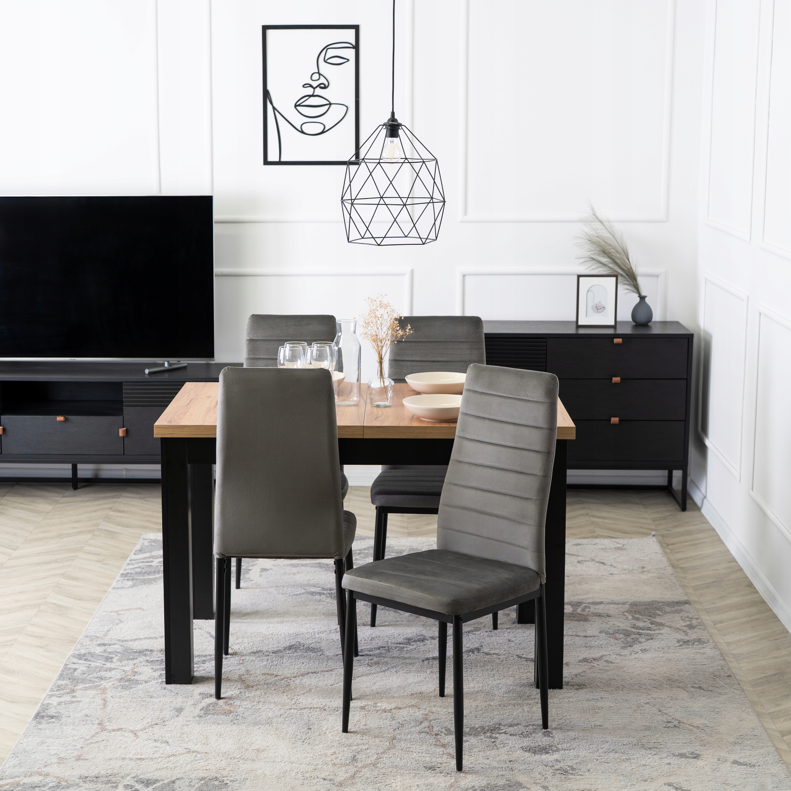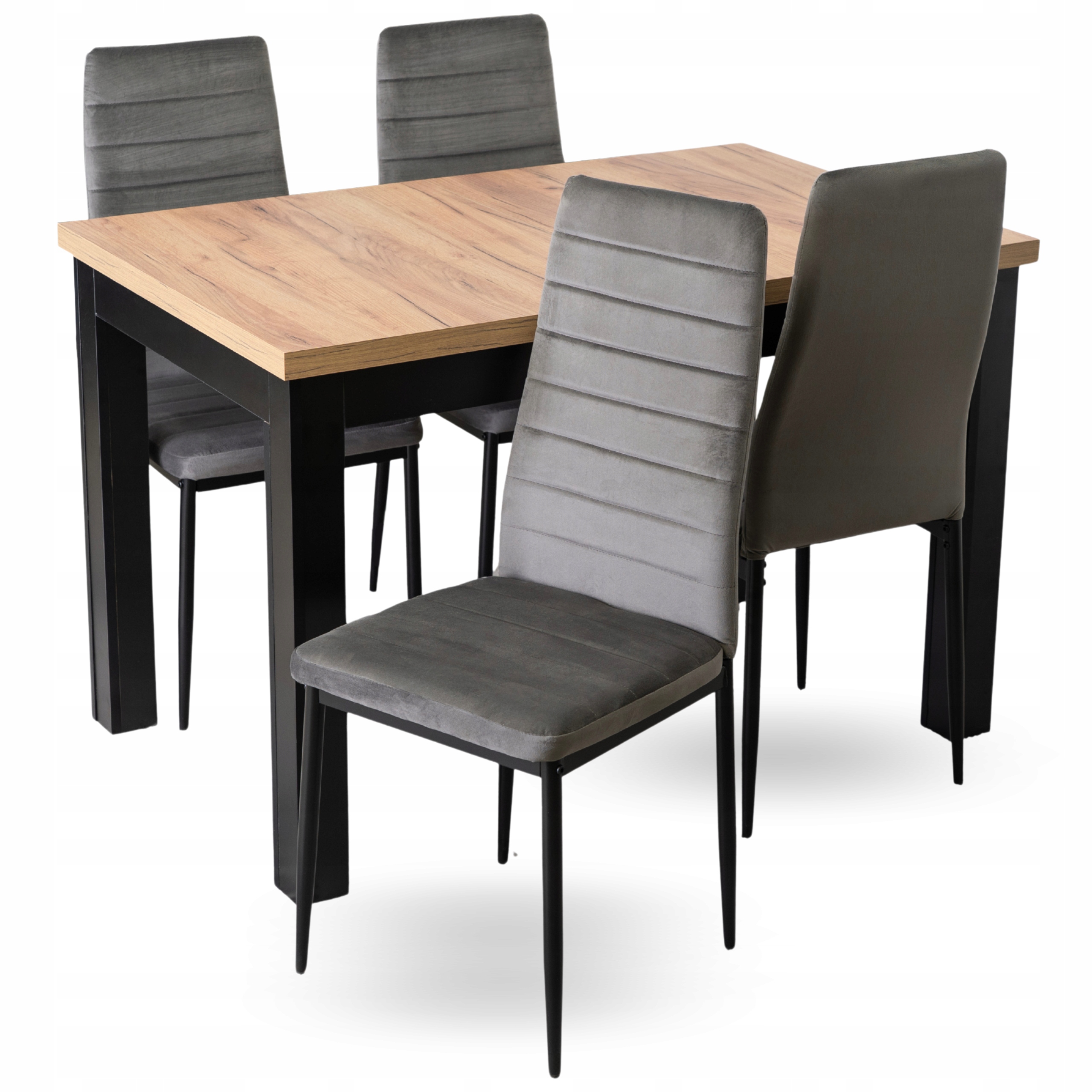 Zestaw składa się z prostokątnego stołu w kolorze dębu craft oraz czterech krzeseł wykonanych z miękkiej, pikowanej tkaniny welurowej w szarym kolorze.