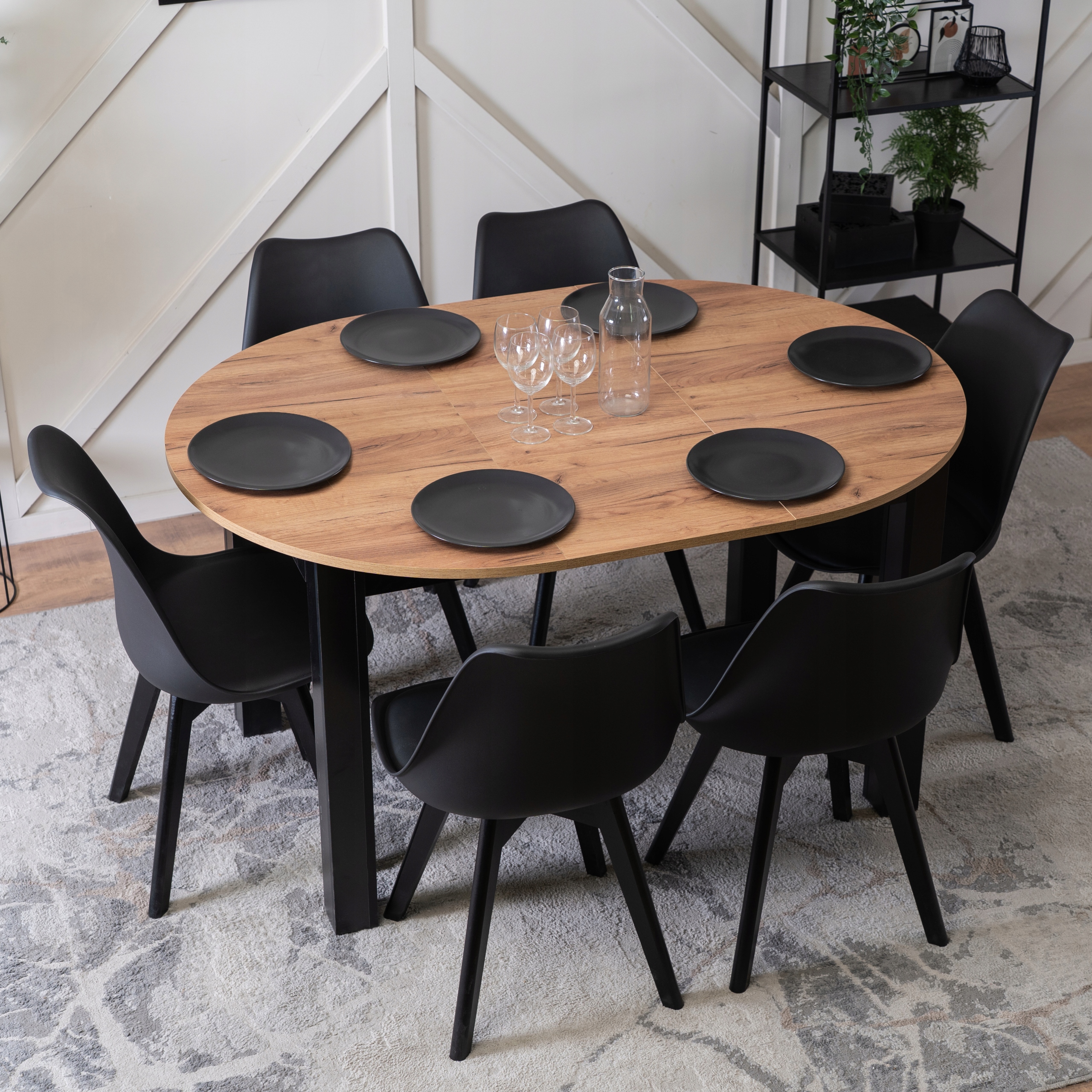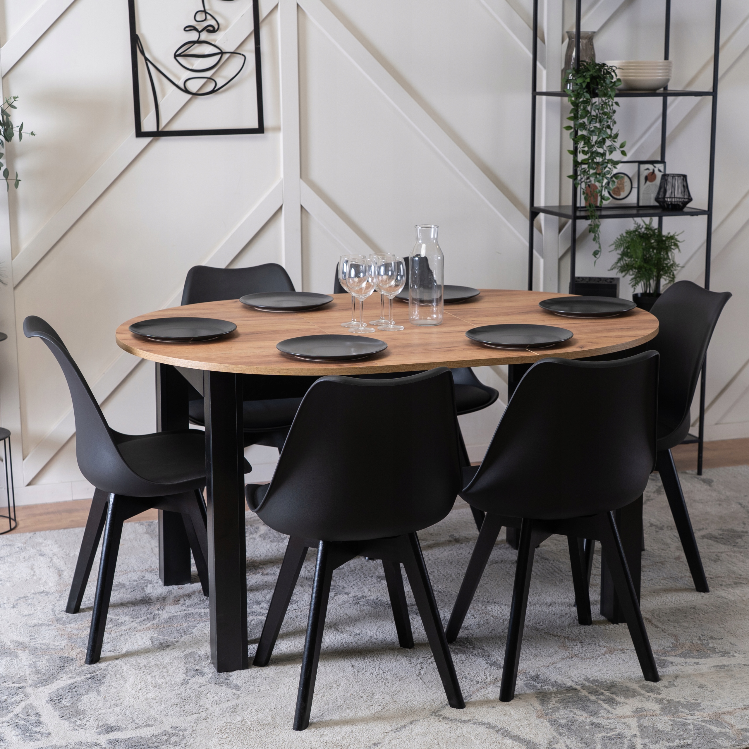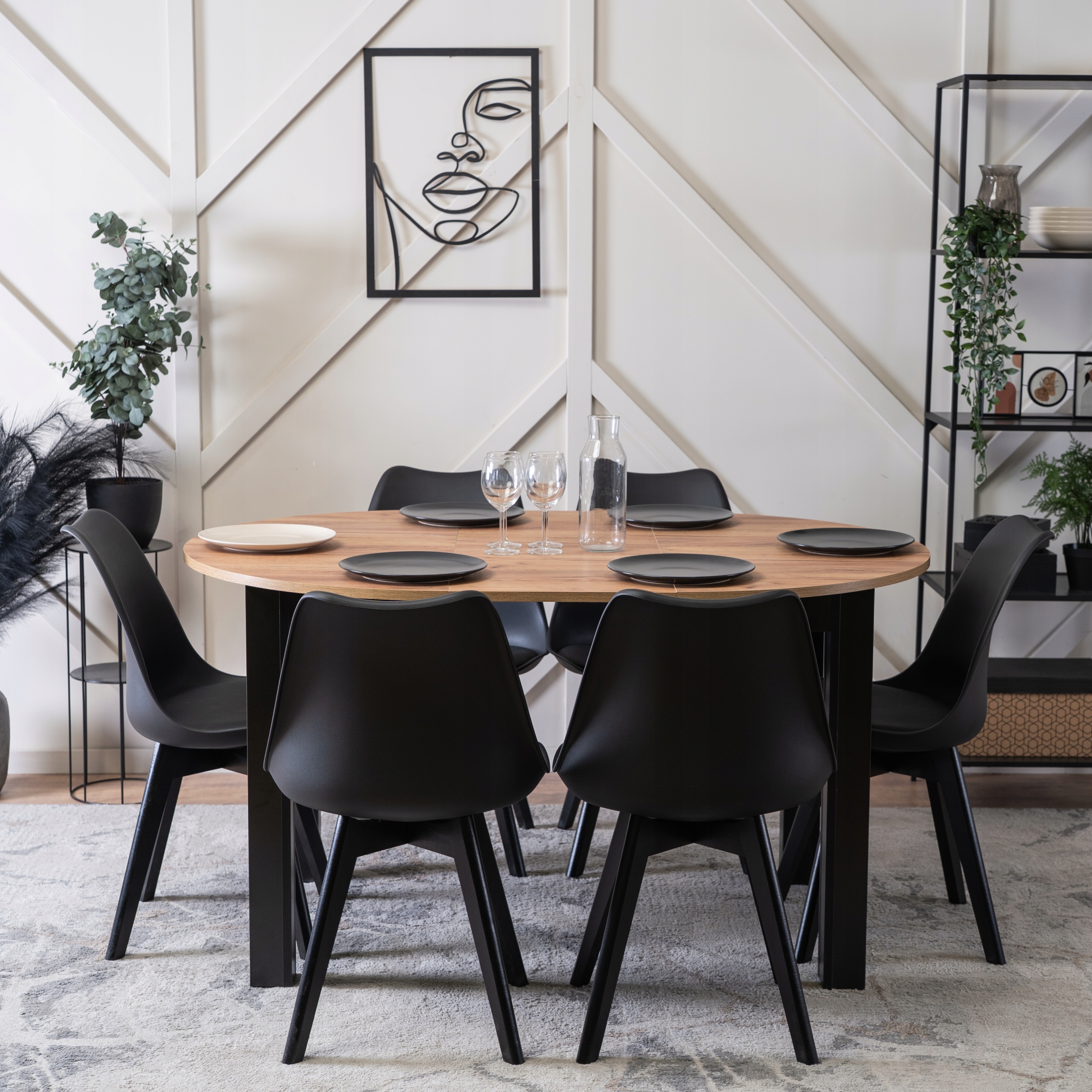 Zestaw składa się z okrągłego stołu w kolorze dąb craft oraz sześciu czarnych krzeseł na drewnianych nogach. Całość prezentuje się lekko, nowocześnie i elegancko.