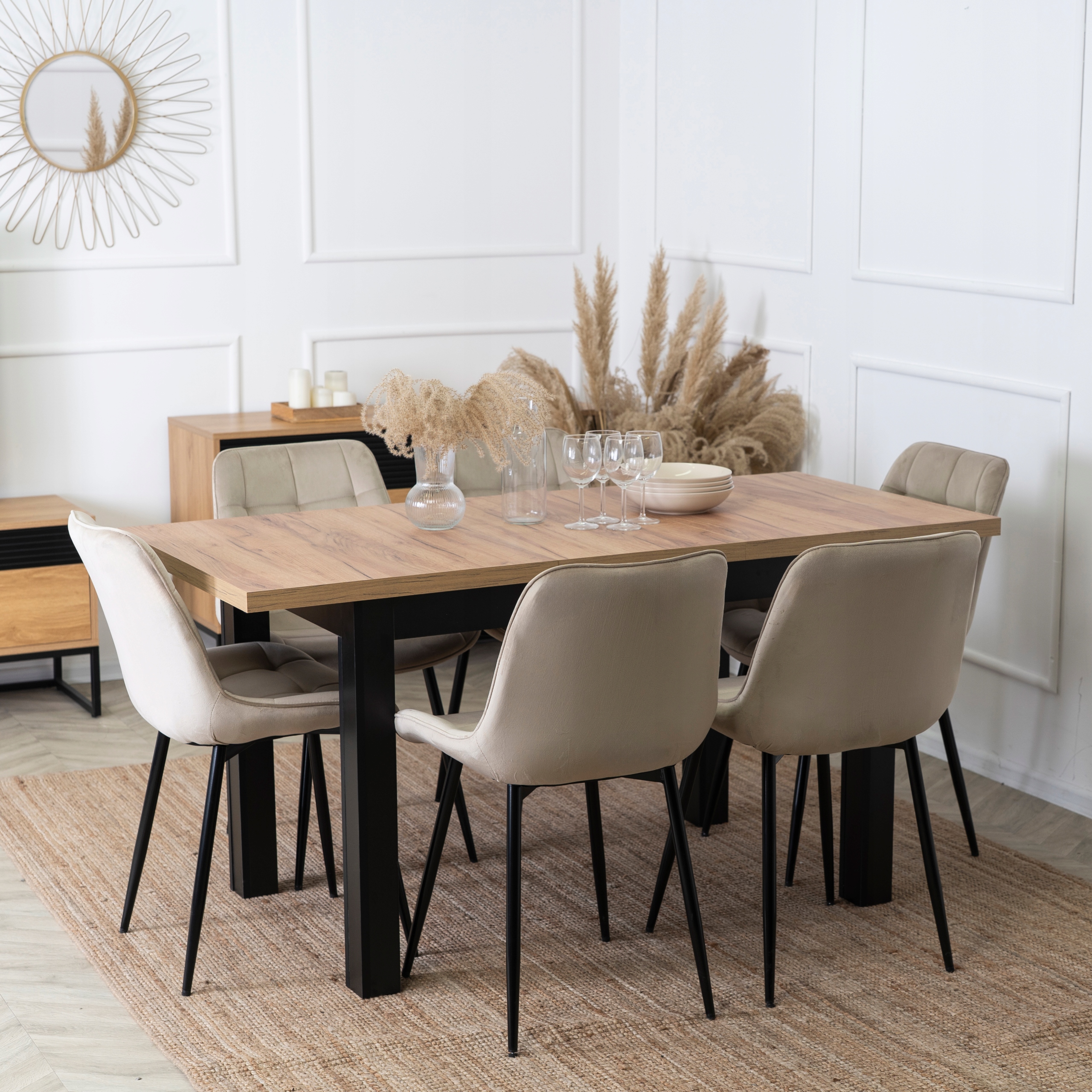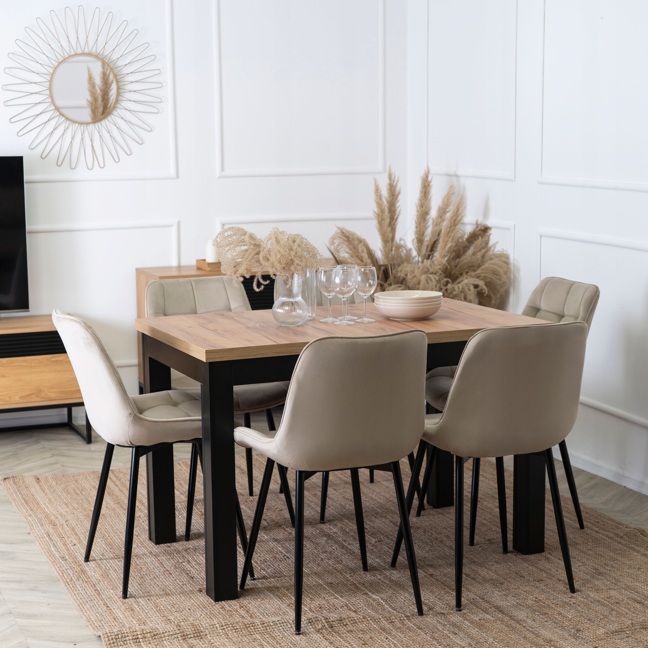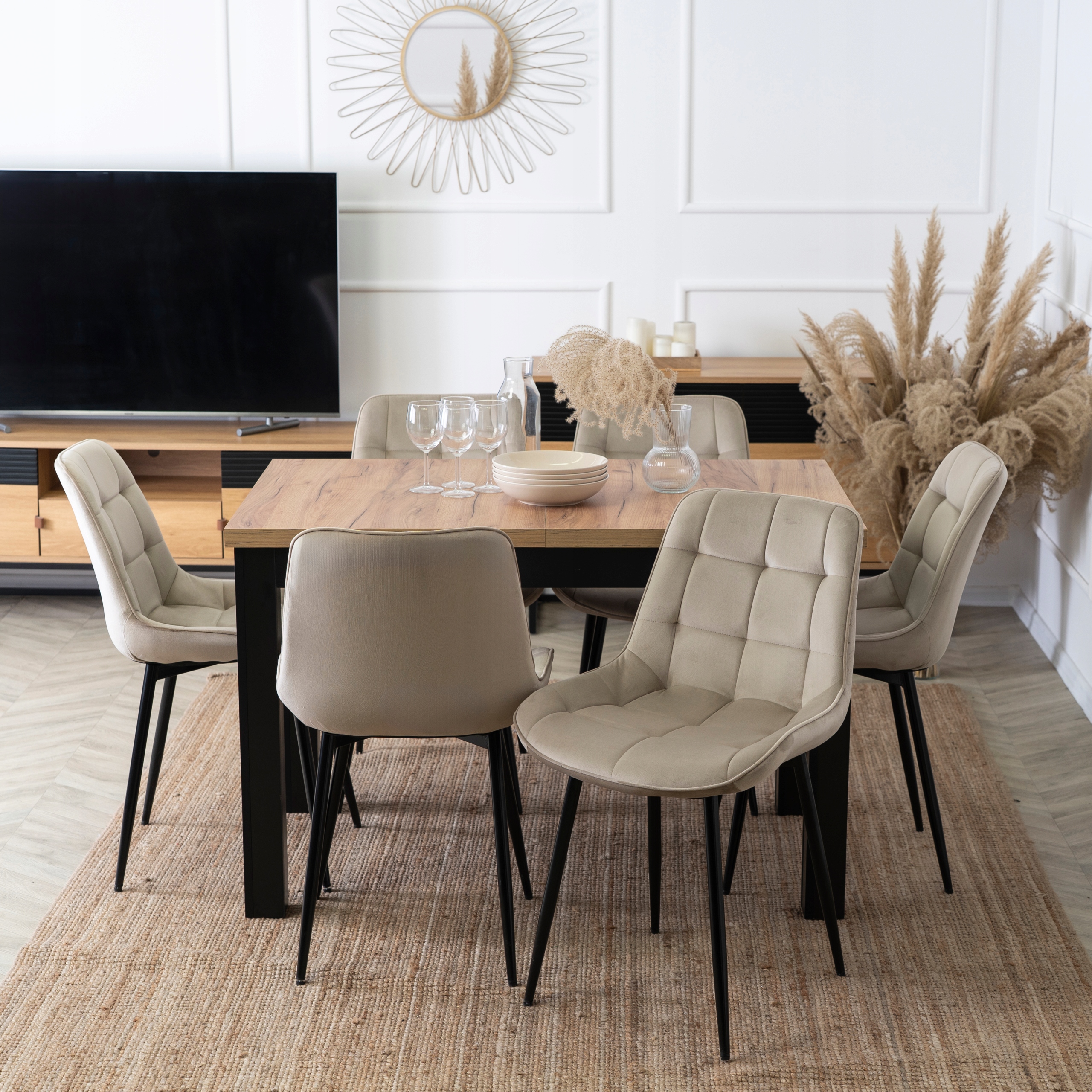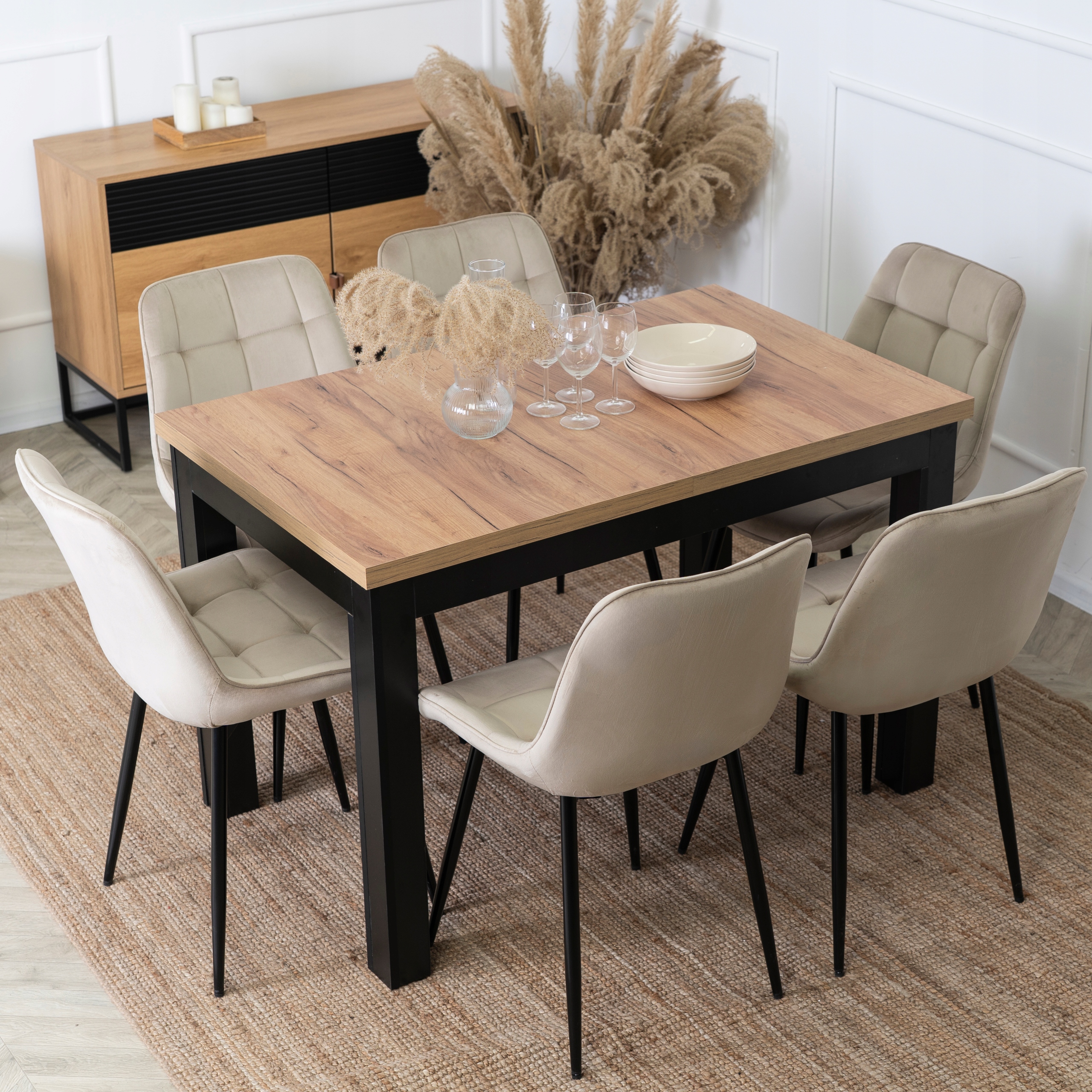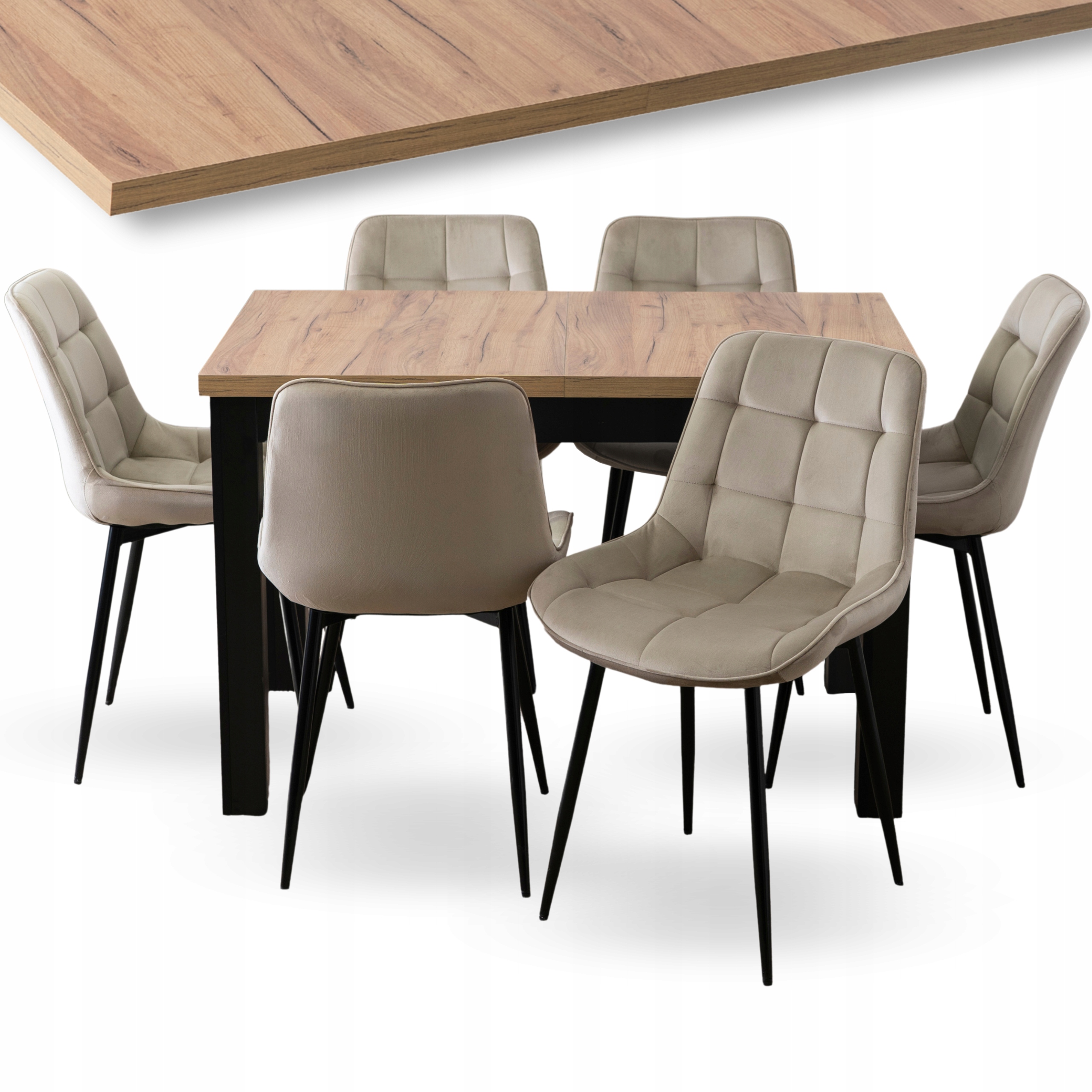 Zestaw składa się z prostokątnego stołu w kolorze dębu craft oraz sześciu krzeseł wykonanych z miękkiej, pikowanej tkaniny welurowej w beżowym kolorze.