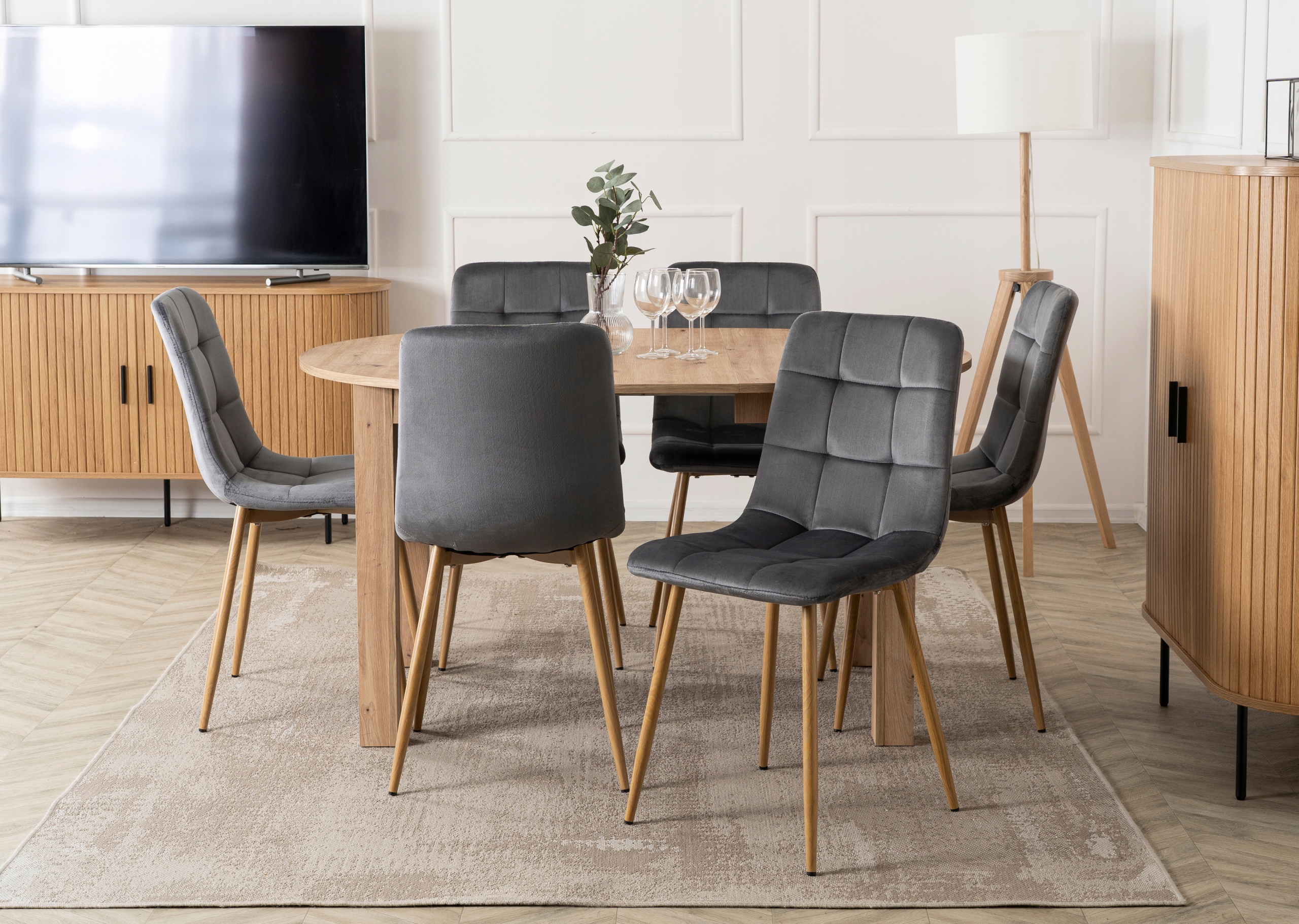 - Wygodne krzesła Fredy – miękkie, welurowe w szarym odcieniu gwarantują komfort siedzenia nawet podczas długich spotkań przy stole.