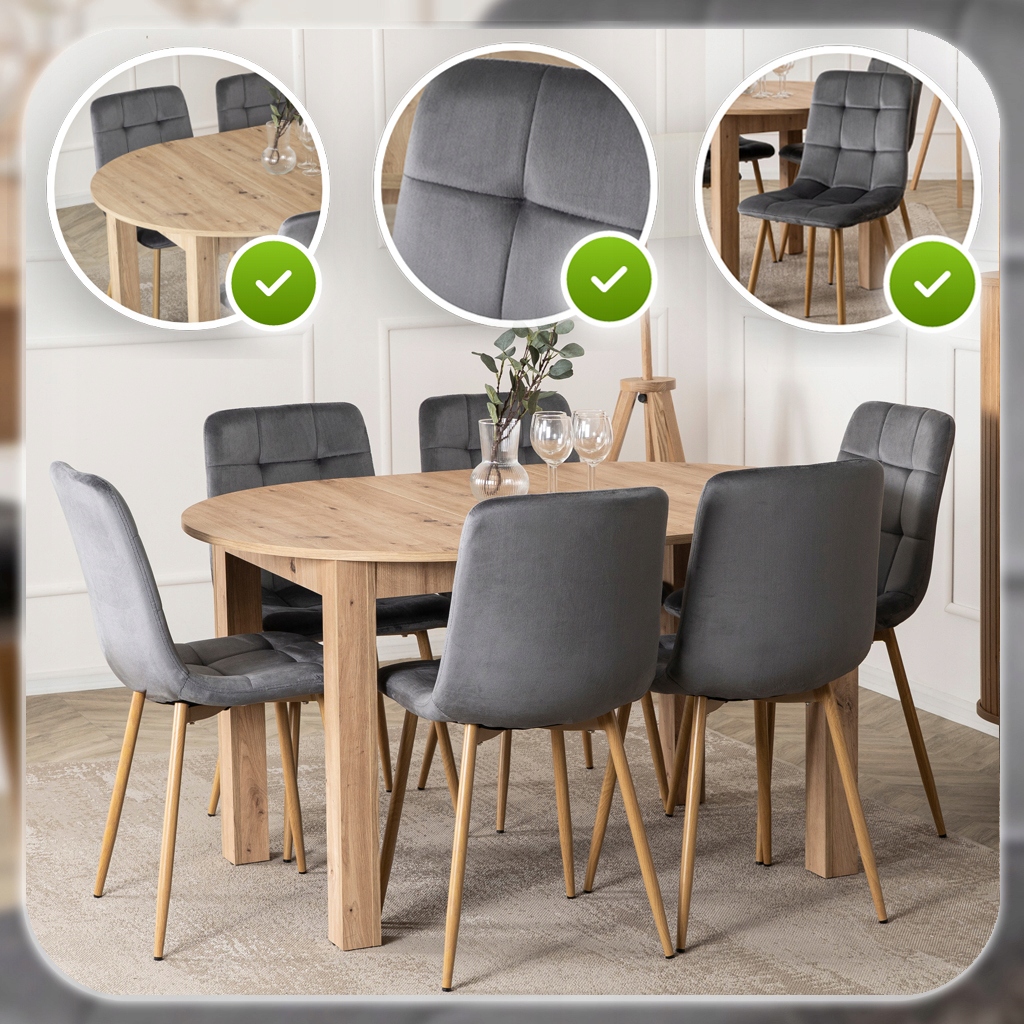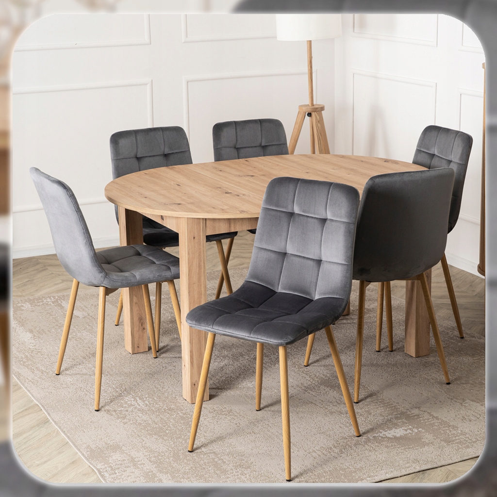 Zestaw składa się z okrągłego stołu w kolorze Dąb Artisan oraz czterech krzeseł o welurowej tapicerce i metalowych nogach. Całość prezentuje się lekko, nowocześnie i elegancko. Dzięki klasycznym kolorom łatwo go dopasować do różnych aranżacji.