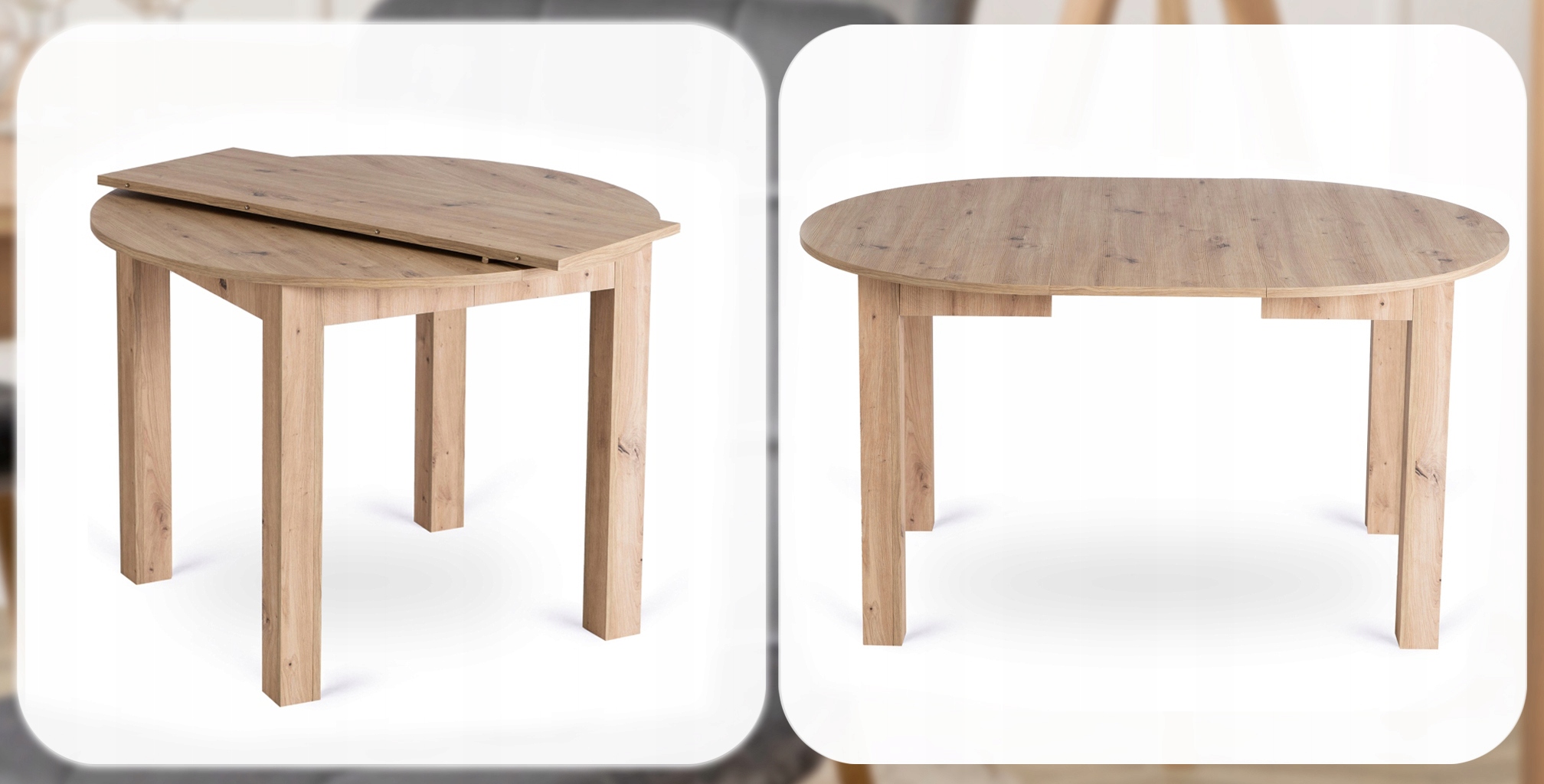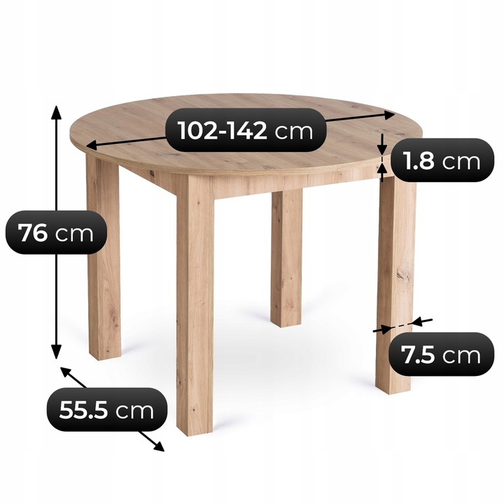 - Stół rozkładany – okrągły blat możliwością rozłożenia z 102 do 142 cm długości.